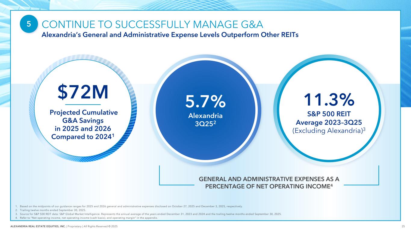 24ALEXANDRIA REAL ESTATE EQUITIES, INC. | Proprietary | All Rights Reserved © 2025 Average Annual Contractual Rent Escalations2 EMBEDDED FAVORABLE TRIPLE NET LEASE STRUCTURE DRIVES DURABLE HIGH MARGINS Refer to “Adjusted EBITDA and Adjusted EBITDA margin,” “Annual rental revenue,” and “and “Net operating income, net operating income (cash basis), and operating margin” in the appendix. 1. Percentage calculated based on our annual rental revenue in effect as of September 30, 2025. 2. For the three months ended September 30, 2025. 4 91% Percentage of Triple Net Leases1 68% Operating Margin2 71% Adjusted EBITDA Margin2