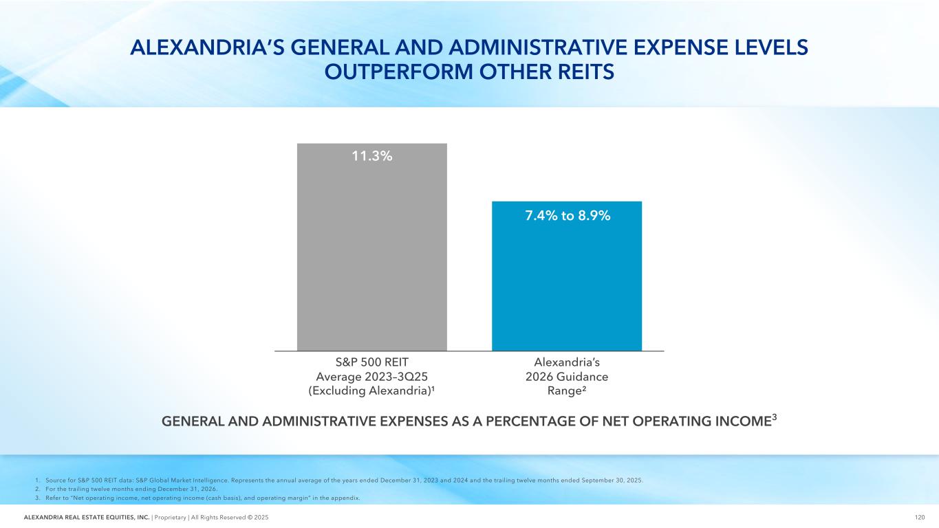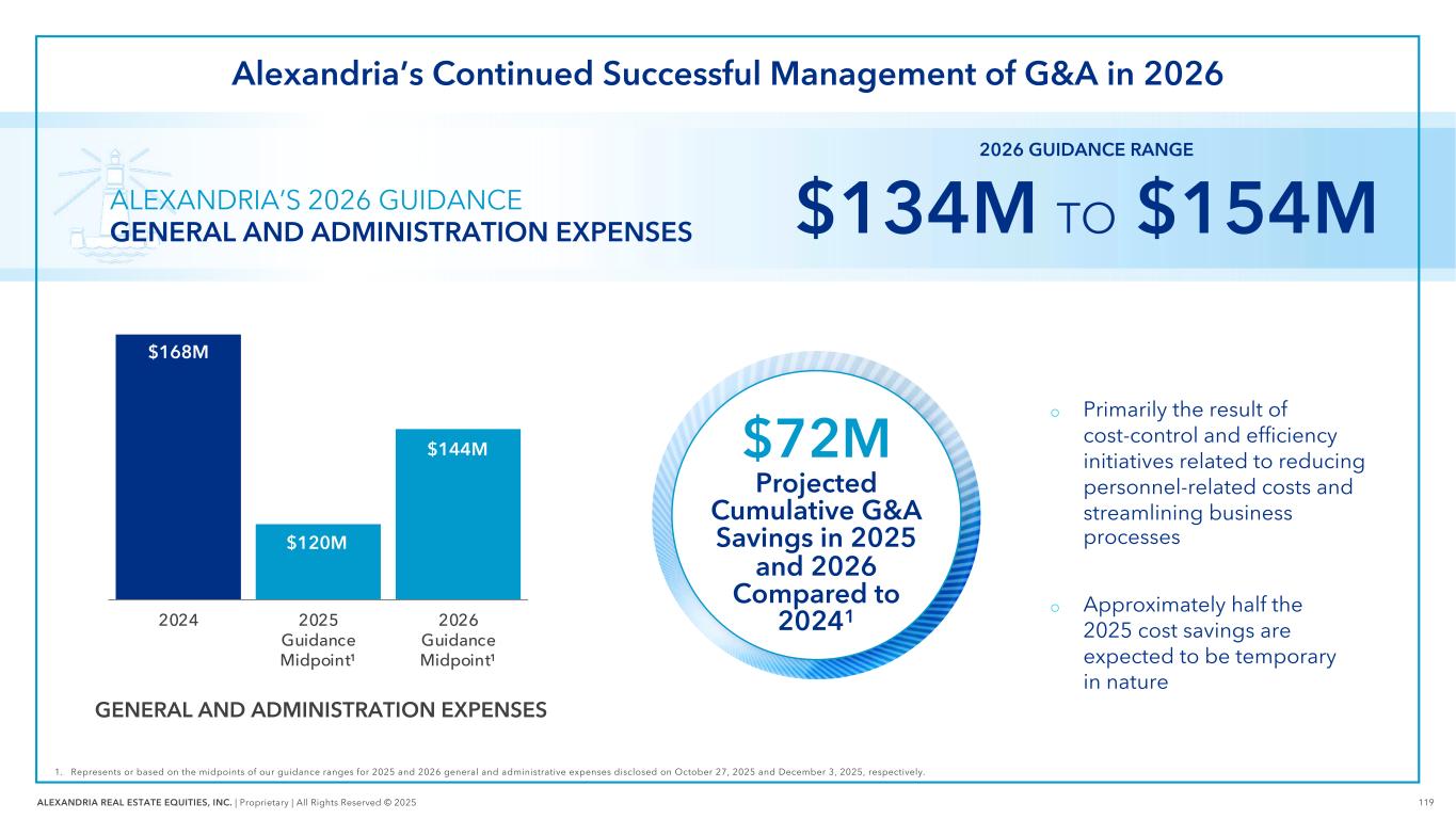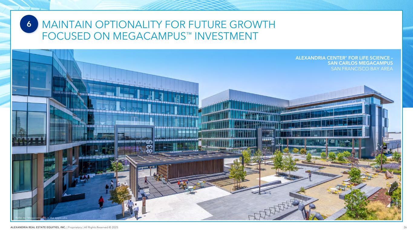 25ALEXANDRIA REAL ESTATE EQUITIES, INC. | Proprietary | All Rights Reserved © 2025 Alexandria’s General and Administrative Expense Levels Outperform Other REITs GENERAL AND ADMINISTRATIVE EXPENSES AS A PERCENTAGE OF NET OPERATING INCOME4 CONTINUE TO SUCCESSFULLY MANAGE G&A 1. Based on the midpoints of our guidance ranges for 2025 and 2026 general and administrative expenses disclosed on October 27, 2025 and December 3, 2025, respectively. 2. Trailing twelve months ended September 30, 2025. 3. Source for S&P 500 REIT data: S&P Global Market Intelligence. Represents the annual average of the years ended December 31, 2023 and 2024 and the trailing twelve months ended September 30, 2025. 4. Refer to “Net operating income, net operating income (cash basis), and operating margin” in the appendix. 5 11.3% S&P 500 REIT Average 2023–3Q25 (Excluding Alexandria)3 5.7% Alexandria 3Q252 $72M Projected Cumulative G&A Savings in 2025 and 2026 Compared to 20241