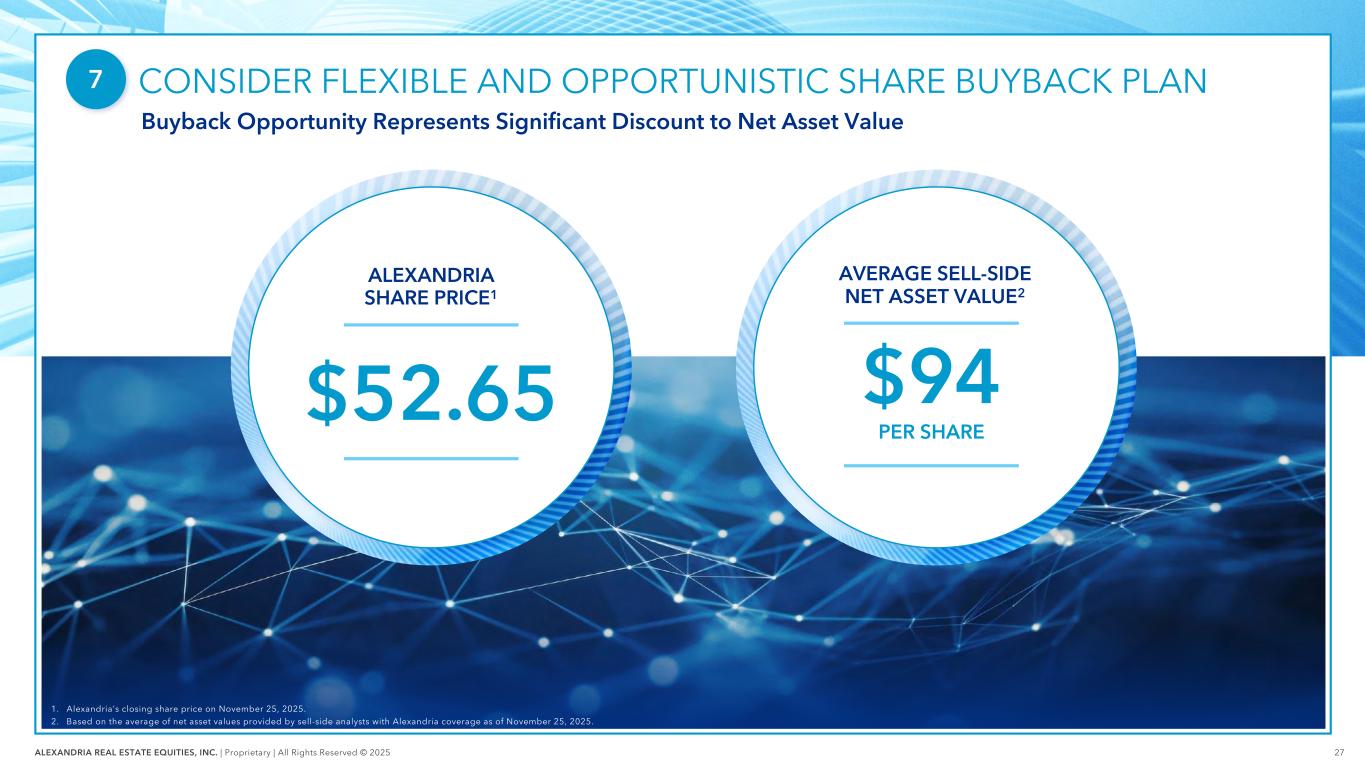 27ALEXANDRIA REAL ESTATE EQUITIES, INC. | Proprietary | All Rights Reserved © 2025 7 CONSIDER FLEXIBLE AND OPPORTUNISTIC SHARE BUYBACK PLAN 1. Alexandria’s closing share price on November 25, 2025. 2. Based on the average of net asset values provided by sell-side analysts with Alexandria coverage as of November 25, 2025. ALEXANDRIA SHARE PRICE1 $52.65 PER SHARE $94 AVERAGE SELL-SIDE NET ASSET VALUE2 Buyback Opportunity Represents Significant Discount to Net Asset Value