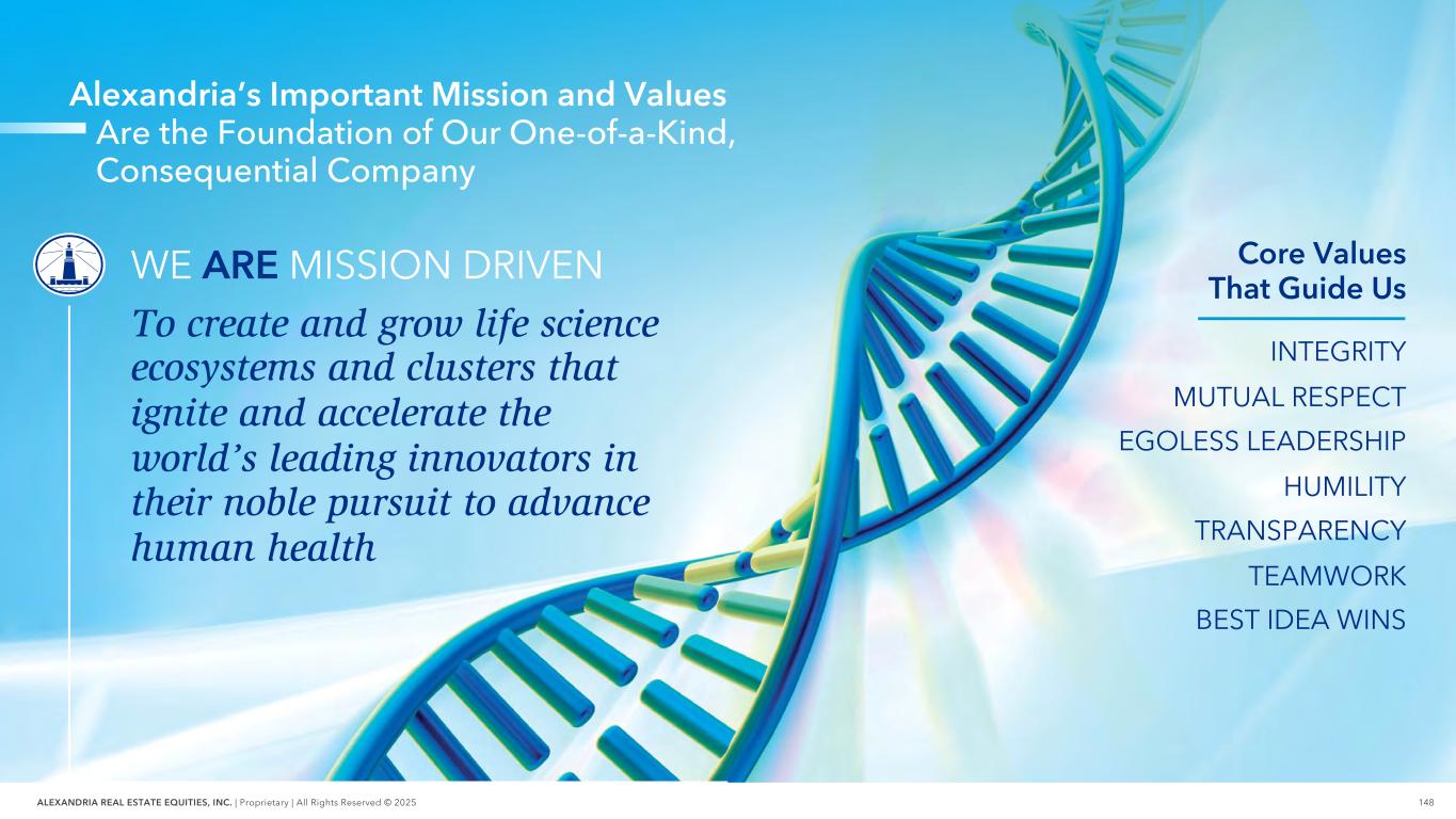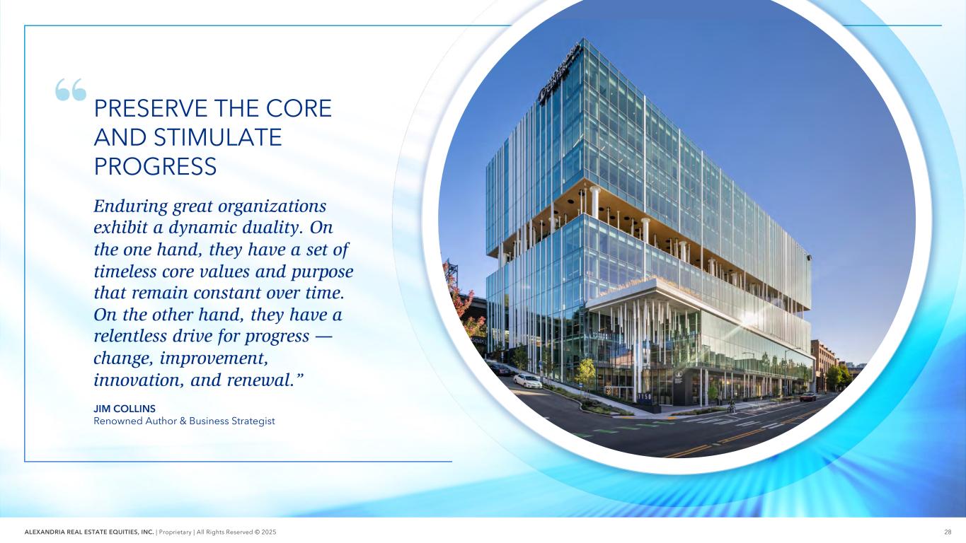 28ALEXANDRIA REAL ESTATE EQUITIES, INC. | Proprietary | All Rights Reserved © 2025 PRESERVE THE CORE AND STIMULATE PROGRESS Enduring great organizations exhibit a dynamic duality. On the one hand, they have a set of timeless core values and purpose that remain constant over time. On the other hand, they have a relentless drive for progress — change, improvement, innovation, and renewal.” JIM COLLINS Renowned Author & Business Strategist