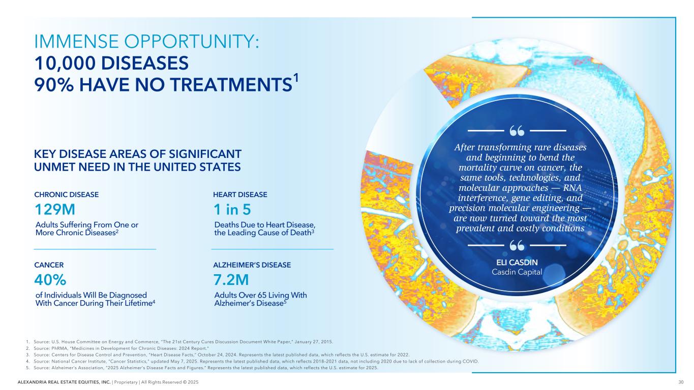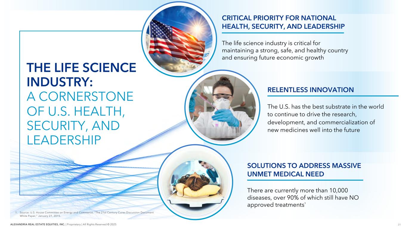 30ALEXANDRIA REAL ESTATE EQUITIES, INC. | Proprietary | All Rights Reserved © 2025 KEY DISEASE AREAS OF SIGNIFICANT UNMET NEED IN THE UNITED STATES Adults Suffering From One or More Chronic Diseases2 CHRONIC DISEASE 129M Deaths Due to Heart Disease, the Leading Cause of Death3 HEART DISEASE 1 in 5 of Individuals Will Be Diagnosed With Cancer During Their Lifetime4 CANCER 40% Adults Over 65 Living With Alzheimer’s Disease5 ALZHEIMER’S DISEASE 7.2M IMMENSE OPPORTUNITY: 10,000 DISEASES 90% HAVE NO TREATMENTS1 1. Source: U.S. House Committee on Energy and Commerce, “The 21st Century Cures Discussion Document White Paper,” January 27, 2015. 2. Source: PhRMA, “Medicines in Development for Chronic Diseases: 2024 Report.” 3. Source: Centers for Disease Control and Prevention, “Heart Disease Facts,” October 24, 2024. Represents the latest published data, which reflects the U.S. estimate for 2022. 4. Source: National Cancer Institute, “Cancer Statistics,” updated May 7, 2025. Represents the latest published data, which reflects 2018–2021 data, not including 2020 due to lack of collection during COVID. 5. Source: Alzheimer’s Association, “2025 Alzheimer’s Disease Facts and Figures.” Represents the latest published data, which reflects the U.S. estimate for 2025. After transforming rare diseases and beginning to bend the mortality curve on cancer, the same tools, technologies, and molecular approaches — RNA interference, gene editing, and precision molecular engineering — are now turned toward the most prevalent and costly conditions ELI CASDIN Casdin Capital