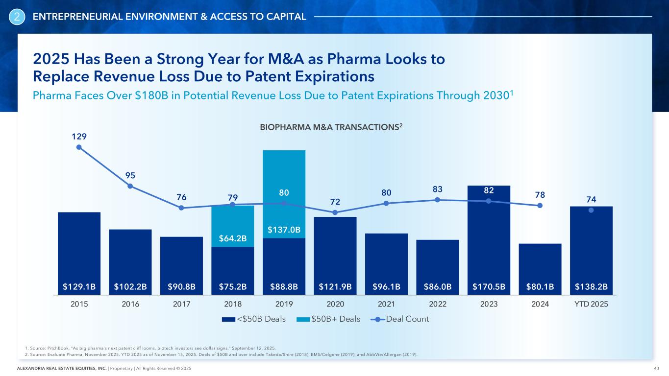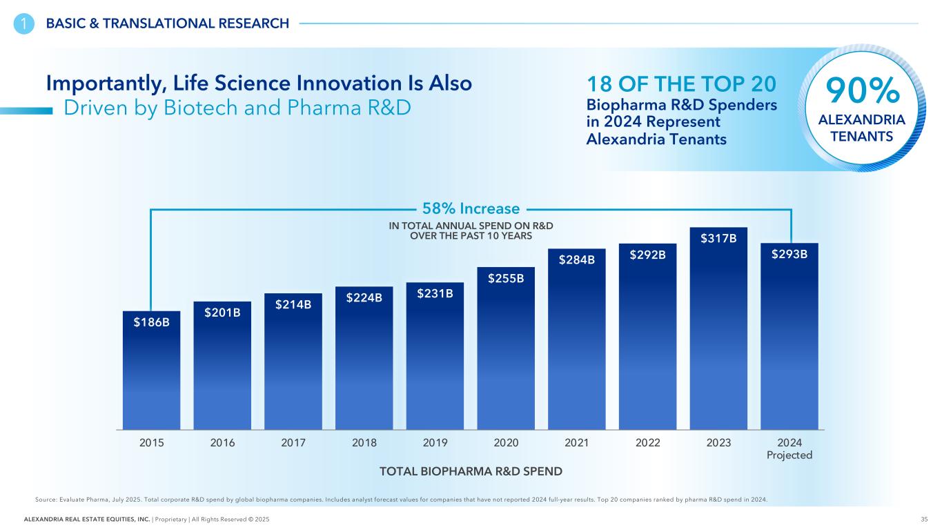33ALEXANDRIA REAL ESTATE EQUITIES, INC. | Proprietary | All Rights Reserved © 2025 KEY CATALYSTS FOR GROWTH: Four Pillars of the U.S. Life Science Industry That Are Collectively Critical to Driving Demand STRONG BASIC & TRANSLATIONAL RESEARCH INNOVATIVE ENTREPRENEURIAL ENVIRONMENT & ACCESS TO LOWER-COST CAPITAL 1 43 2 Discovery of fundamental disease biology that underpins the development of future medicines R&D funding across private, public biotech, and pharma to improve and extend lives RELIABLE AND EFFICIENT REGULATORY FRAMEWORK TO REDUCE TIME & COST OF FDA APPROVALS Transparent process for evaluating new medicines that is supported by reliable and efficient timelines and open communication HEALTHY PAYMENT ENVIRONMENT FOR INNOVATIVE MEDICINES Drug pricing policy that balances incentivizing new medicine development, potential long- term healthcare savings, and patient access