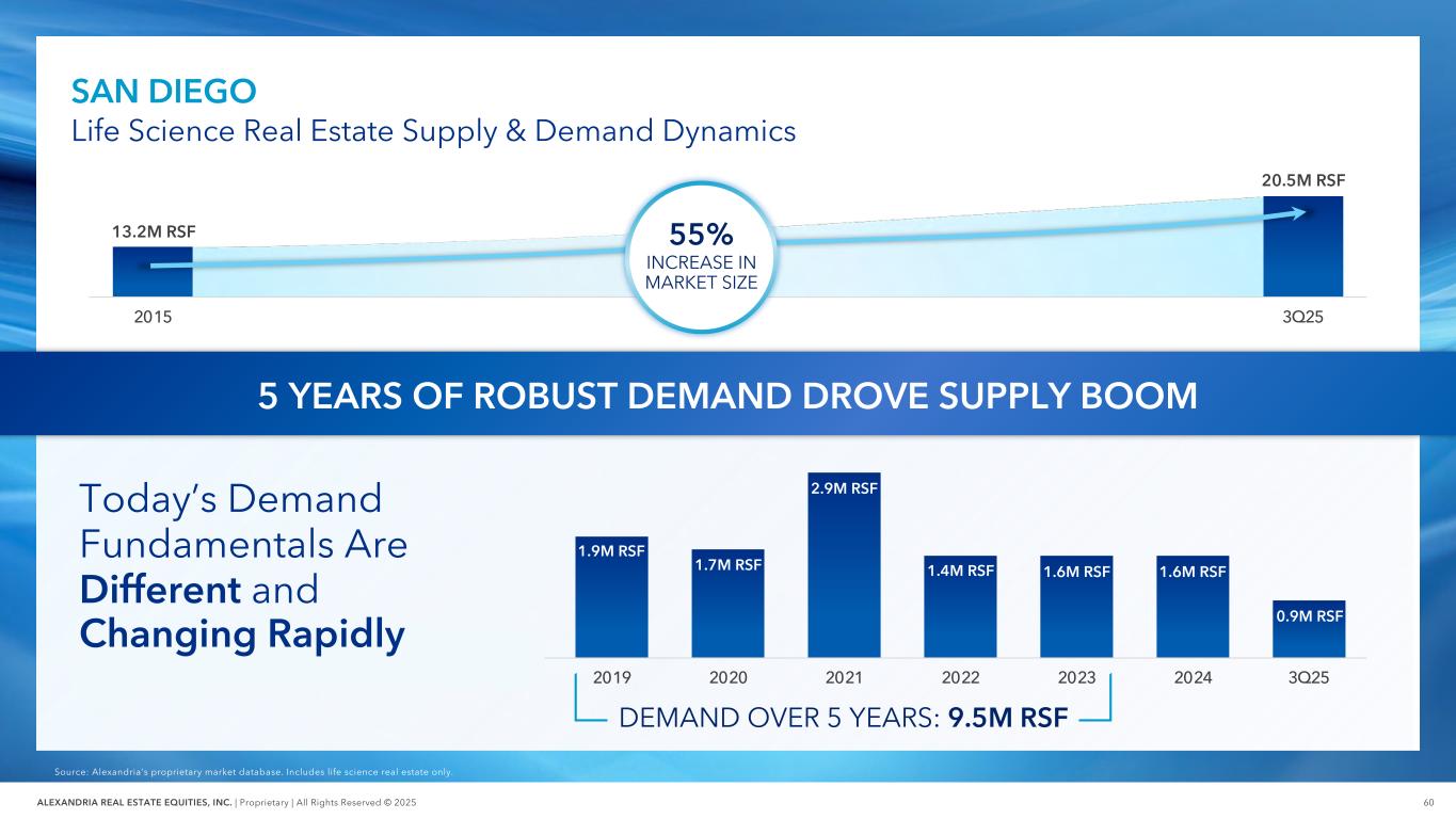 8ALEXANDRIA REAL ESTATE EQUITIES, INC. | Proprietary | All Rights Reserved © 2025 5.7 5.6 6.1 8.4 7.7 14.0 8.3 6.7 6.3 5.3 2016 2017 2018 2019 2020 2021 2022 2023 2024 3Q25 TOTAL AVERAGE DEMAND REQUIREMENTS (RSF IN MILLIONS) As of September 30, 2025. Total average requirements of Tenants in Market as tracked by Alexandria. Source: Alexandria’s proprietary market database. LIFE SCIENCE DEMAND HAS DECLINED OVER 60% SINCE HISTORICALLY UNIQUE COVID-DRIVEN DEMAND SURGE IN 2021 62% DECREASE ALEXANDRIA’S TOP 3 MARKETS: GREATER BOSTON, SAN FRANCISCO BAY AREA, AND SAN DIEGO