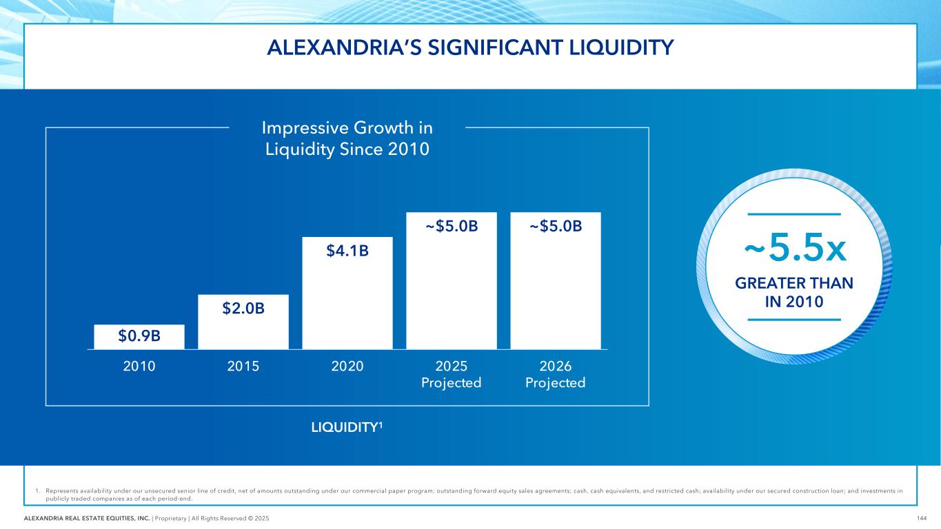 12ALEXANDRIA REAL ESTATE EQUITIES, INC. | Proprietary | All Rights Reserved © 2025 MAINTAIN A STRONG AND FLEXIBLE BALANCE SHEET, SIGNIFICANT LIQUIDITY, AND TARGETED LEVERAGE Refer to “Net debt and preferred stock to Adjusted EBITDA“ in the appendix. 1. Represents our guidance for net debt and preferred stock to Adjusted EBITDA for 4Q25 annualized, disclosed on October 27, 2025. 2. Represents our guidance for net debt and preferred stock to Adjusted EBITDA for 4Q25 annualized, disclosed on December 3, 2025. 3. Represents fourth quarter annualized for each year. NET DEBT AND PREFERRED STOCK TO ADJUSTED EBITDA3 7.1x 6.4x 5.6x 5.5x 5.7x 5.3x 5.2x 5.1x 5.1x 5.2x 5.5x to 6.0x 5.6x to 6.2x 5.5x to 6.0x 2015 2016 2017 2018 2019 2020 2021 2022 2023 2024 4Q25 Projected¹ 4Q26 Projected² Near-Term Goal Beyond 2026 1