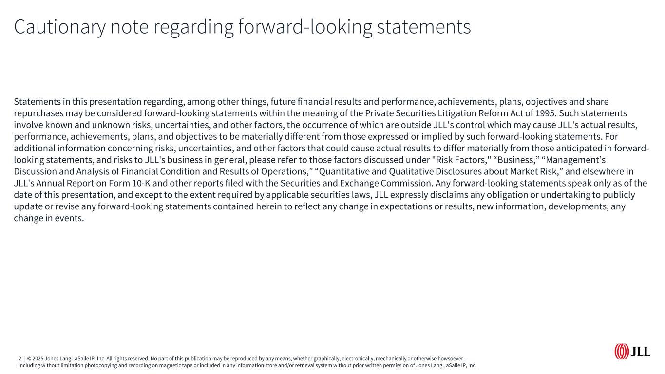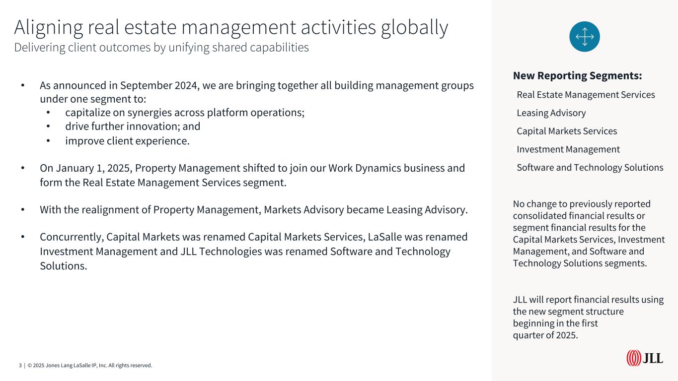 Cautionary note regarding forward-looking statements Statements in this presentation regarding, among other things, future financial results and performance, achievements, plans, objectives and share repurchases may be considered forward-looking statements within the meaning of the Private Securities Litigation Reform Act of 1995. Such statements involve known and unknown risks, uncertainties, and other factors, the occurrence of which are outside JLL's control which may cause JLL's actual results, performance, achievements, plans, and objectives to be materially different from those expressed or implied by such forward-looking statements. For additional information concerning risks, uncertainties, and other factors that could cause actual results to differ materially from those anticipated in forward- looking statements, and risks to JLL's business in general, please refer to those factors discussed under "Risk Factors," “Business,” “Management’s Discussion and Analysis of Financial Condition and Results of Operations,” “Quantitative and Qualitative Disclosures about Market Risk,” and elsewhere in JLL's Annual Report on Form 10-K and other reports filed with the Securities and Exchange Commission. Any forward-looking statements speak only as of the date of this presentation, and except to the extent required by applicable securities laws, JLL expressly disclaims any obligation or undertaking to publicly update or revise any forward-looking statements contained herein to reflect any change in expectations or results, new information, developments, any change in events. 2 | © 2025 Jones Lang LaSalle IP, Inc. All rights reserved. No part of this publication may be reproduced by any means, whether graphically, electronically, mechanically or otherwise howsoever, including without limitation photocopying and recording on magnetic tape or included in any information store and/or retrieval system without prior written permission of Jones Lang LaSalle IP, Inc.