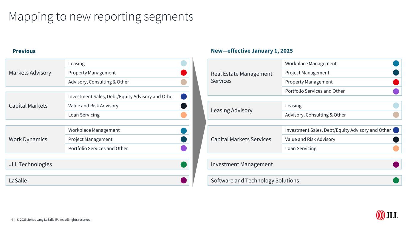 3 | © 2025 Jones Lang LaSalle IP, Inc. All rights reserved. Aligning real estate management activities globally Delivering client outcomes by unifying shared capabilities • As announced in September 2024, we are bringing together all building management groups under one segment to: • capitalize on synergies across platform operations; • drive further innovation; and • improve client experience. • On January 1, 2025, Property Management shifted to join our Work Dynamics business and form the Real Estate Management Services segment. • With the realignment of Property Management, Markets Advisory became Leasing Advisory. • Concurrently, Capital Markets was renamed Capital Markets Services, LaSalle was renamed Investment Management and JLL Technologies was renamed Software and Technology Solutions. New Reporting Segments: •Real Estate Management Services •Leasing Advisory •Capital Markets Services •Investment Management •Software and Technology Solutions No change to previously reported consolidated financial results or segment financial results for the Capital Markets Services, Investment Management, and Software and Technology Solutions segments. JLL will report financial results using the new segment structure beginning in the first quarter of 2025.