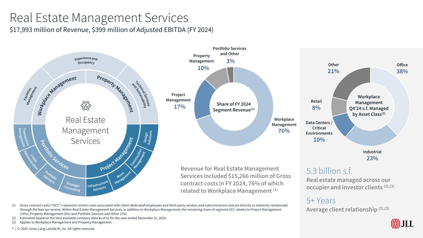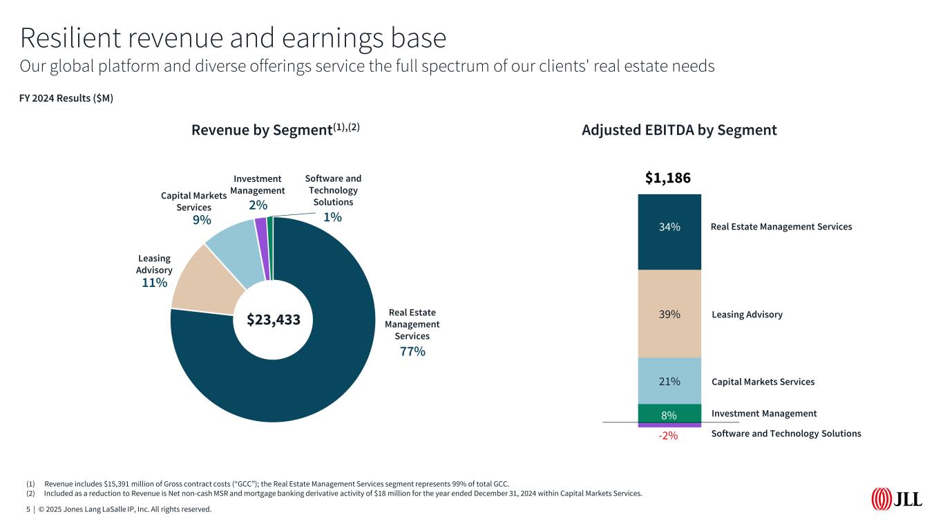 Real Estate Management Services Workplace Management Project Management Property Management Portfolio Services and Other Leasing Advisory Leasing Advisory, Consulting & Other Capital Markets Services Investment Sales, Debt/Equity Advisory and Other Value and Risk Advisory Loan Servicing Investment Management Software and Technology Solutions Markets Advisory Leasing Property Management Advisory, Consulting & Other Capital Markets Investment Sales, Debt/Equity Advisory and Other Value and Risk Advisory Loan Servicing Work Dynamics Workplace Management Project Management Portfolio Services and Other JLL Technologies LaSalle Mapping to new reporting segments 4 | © 2025 Jones Lang LaSalle IP, Inc. All rights reserved. New—effective January 1, 2025Previous