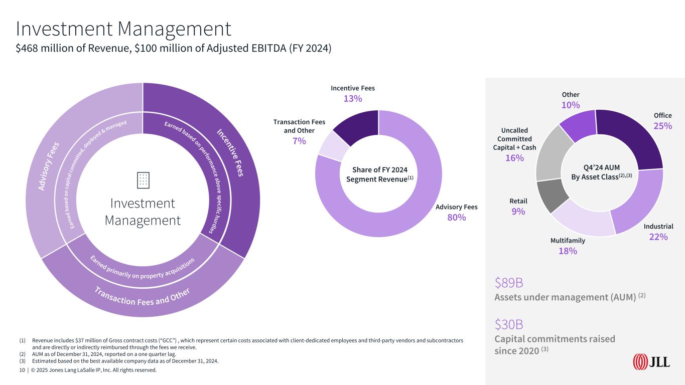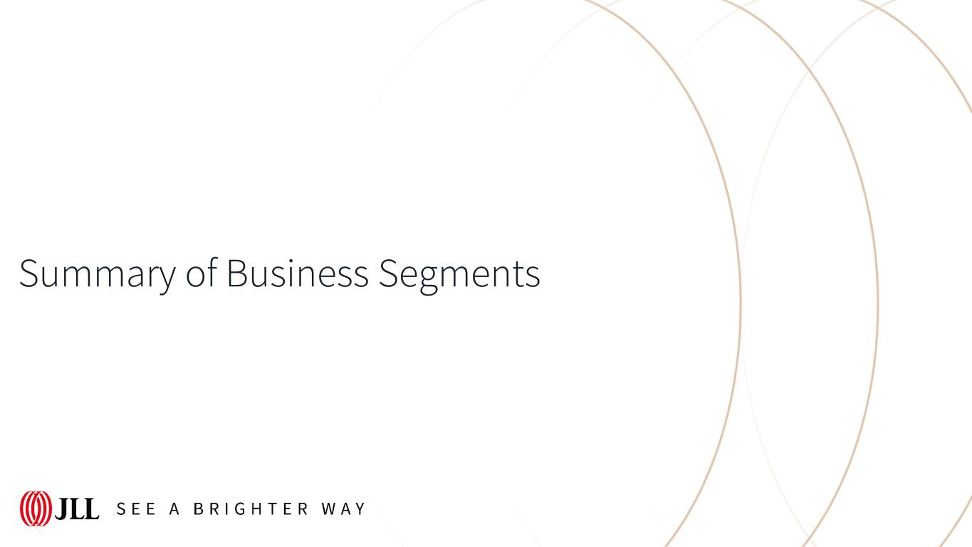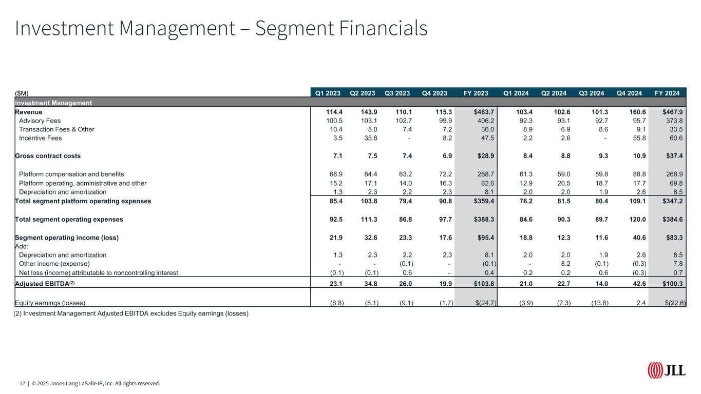 Capital Markets Services – Segment Financials 16 | © 2025 Jones Lang LaSalle IP, Inc. All rights reserved. ($M) Q1 2023 Q2 2023 Q3 2023 Q4 2023 FY 2023 Q1 2024 Q2 2024 Q3 2024 Q4 2024 FY 2024 Capital Markets Services Revenue 357.1 448.0 435.8 537.1 $1,778.0 377.6 457.6 498.8 706.4 $2,040.4 Investment Sales, Debt/Equity Advisory and Other 240.6 319.5 310.2 391.3 1,261.6 258.7 320.3 371.8 555.4 1,506.2 Value and Risk Advisory 79.1 89.5 87.5 107.7 363.8 80.2 95.8 86.0 111.0 373.0 Loan Servicing 37.4 39.0 38.1 38.1 152.6 38.7 41.5 41.0 40.0 161.2 Gross contract costs 9.3 13.1 11.5 13.6 $47.5 13.6 11.8 11.5 11.7 $48.6 Investment Sales, Debt/Equity Advisory and Other 7.2 10.2 8.4 9.0 34.8 11.1 8.6 7.9 8.0 35.6 Value and Risk Advisory 2.1 2.9 3.1 4.6 12.7 2.5 3.2 3.6 3.7 13.0 Loan Servicing - - - - - - - - - - Platform compensation and benefits 283.9 335.4 323.8 394.6 $1,337.7 287.6 341.1 365.5 497.7 $1,491.9 Platform operating, administrative and other 56.1 69.2 58.3 62.5 246.1 60.8 83.3 62.3 72.0 278.4 Depreciation and amortization 15.9 16.2 16.4 17.1 65.6 16.4 17.3 16.6 16.5 66.8 Total segment platform operating expenses 355.9 420.8 398.5 474.2 $1,649.4 364.8 441.7 444.4 586.2 $1,837.1 Total segment operating expenses 365.2 433.9 410.0 487.8 $1,696.9 378.4 453.5 455.9 597.9 $1,885.7 Segment operating income (loss) (8.1) 14.1 25.8 49.3 $81.1 (0.8) 4.1 42.9 108.5 $154.7 Add: Equity earnings (losses) 0.6 4.8 0.7 0.6 6.7 0.1 0.5 0.2 1.9 2.7 Depreciation and amortization 15.9 16.2 16.4 17.1 65.6 16.4 17.3 16.6 16.5 66.8 Other income (expense) (0.2) 0.4 1.3 1.0 2.5 0.6 0.8 1.6 1.5 4.5 Adjustments: Net non-cash MSR and mortgage banking derivative activity 1.8 0.6 7.1 8.7 18.2 9.0 11.8 5.1 (7.7) 18.2 Net loss (gain) on disposition - - (0.4) - (0.4) - - - - - Interest on employee loans, net of forgiveness 0.7 (0.1) (0.6) (0.6) (0.6) (0.3) (0.7) (0.7) (0.8) (2.5) Adjusted EBITDA 10.7 36.0 50.3 76.1 $173.1 25.0 33.8 65.7 119.9 $244.4