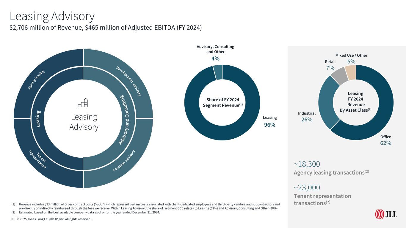 70% 17% 10% 3% Real Estate Management Services $17,993 million of Revenue, $399 million of Adjusted EBITDA (FY 2024) 7 | © 2025 Jones Lang LaSalle IP, Inc. All rights reserved. Share of FY 2024 Segment Revenue(1) Workplace Management Q4’24 s.f. Managed by Asset Class(2) Other 21% Office 38% Industrial 23% Retail 8% Real Estate Management Services Data Centers / Critical Environments 10% Workplace Management Project Management Property Management Portfolio Services and Other 5.3 billion s.f. Real estate managed across our occupier and investor clients (2),(3) 5+ Years Average client relationship (2),(3) (1) Gross contract costs (“GCC”) represent certain costs associated with client-dedicated employees and third-party vendors and subcontractors and are directly or indirectly reimbursed through the fees we receive. Within Real Estate Management Services, in addition to Workplace Management, the remaining share of segment GCC relates to Project Management (14%), Property Management (8%) and Portfolio Services and Other (2%). (2) Estimated based on the best available company data as of or for the year ended December 31, 2024. (3) Applies to Workplace Management and Property Management. Revenue for Real Estate Management Services included $15,266 million of Gross contract costs in FY 2024, 76% of which related to Workplace Management (1)