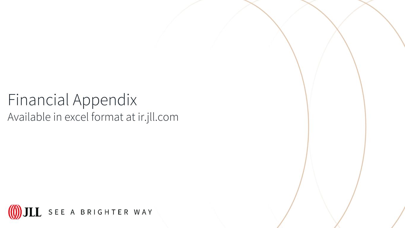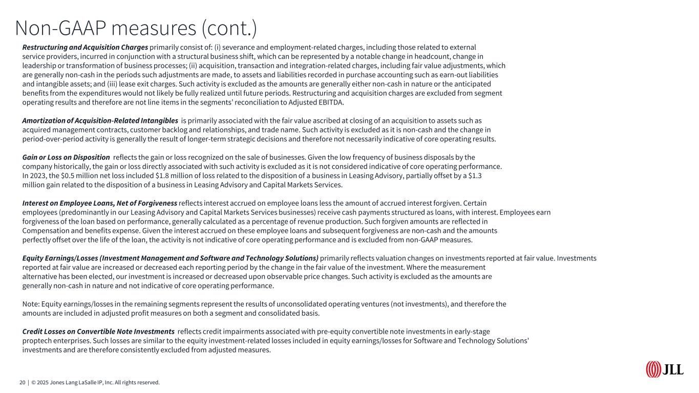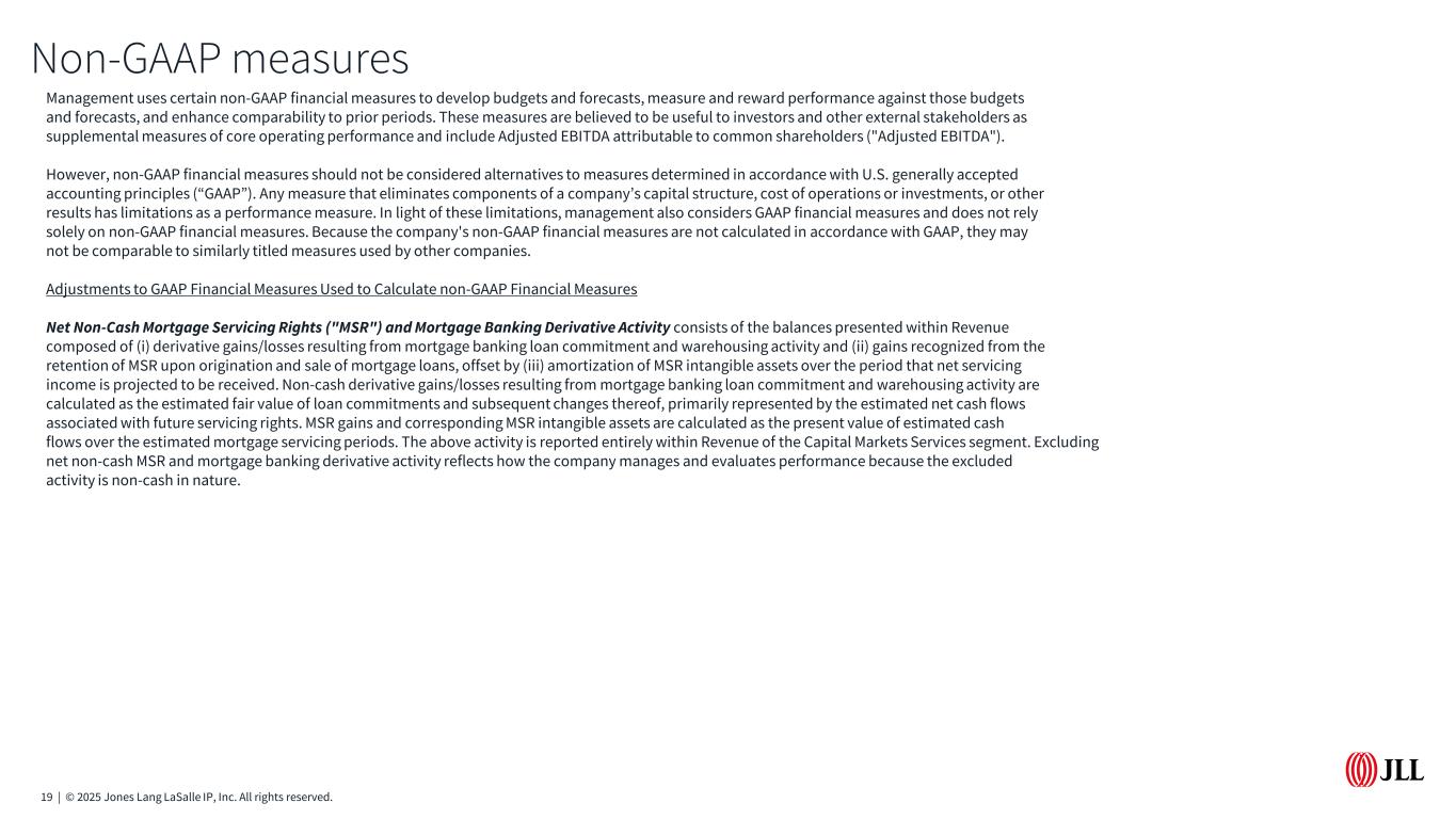 Non-GAAP measures Management uses certain non-GAAP financial measures to develop budgets and forecasts, measure and reward performance against those budgets and forecasts, and enhance comparability to prior periods. These measures are believed to be useful to investors and other external stakeholders as supplemental measures of core operating performance and include Adjusted EBITDA attributable to common shareholders ("Adjusted EBITDA"). However, non-GAAP financial measures should not be considered alternatives to measures determined in accordance with U.S. generally accepted accounting principles (“GAAP”). Any measure that eliminates components of a company’s capital structure, cost of operations or investments, or other results has limitations as a performance measure. In light of these limitations, management also considers GAAP financial measures and does not rely solely on non-GAAP financial measures. Because the company's non-GAAP financial measures are not calculated in accordance with GAAP, they may not be comparable to similarly titled measures used by other companies. Adjustments to GAAP Financial Measures Used to Calculate non-GAAP Financial Measures Net Non-Cash Mortgage Servicing Rights ("MSR") and Mortgage Banking Derivative Activity consists of the balances presented within Revenue composed of (i) derivative gains/losses resulting from mortgage banking loan commitment and warehousing activity and (ii) gains recognized from the retention of MSR upon origination and sale of mortgage loans, offset by (iii) amortization of MSR intangible assets over the period that net servicing income is projected to be received. Non-cash derivative gains/losses resulting from mortgage banking loan commitment and warehousing activity are calculated as the estimated fair value of loan commitments and subsequent changes thereof, primarily represented by the estimated net cash flows associated with future servicing rights. MSR gains and corresponding MSR intangible assets are calculated as the present value of estimated cash flows over the estimated mortgage servicing periods. The above activity is reported entirely within Revenue of the Capital Markets Services segment. Excluding net non-cash MSR and mortgage banking derivative activity reflects how the company manages and evaluates performance because the excluded activity is non-cash in nature. 19 | © 2025 Jones Lang LaSalle IP, Inc. All rights reserved.
