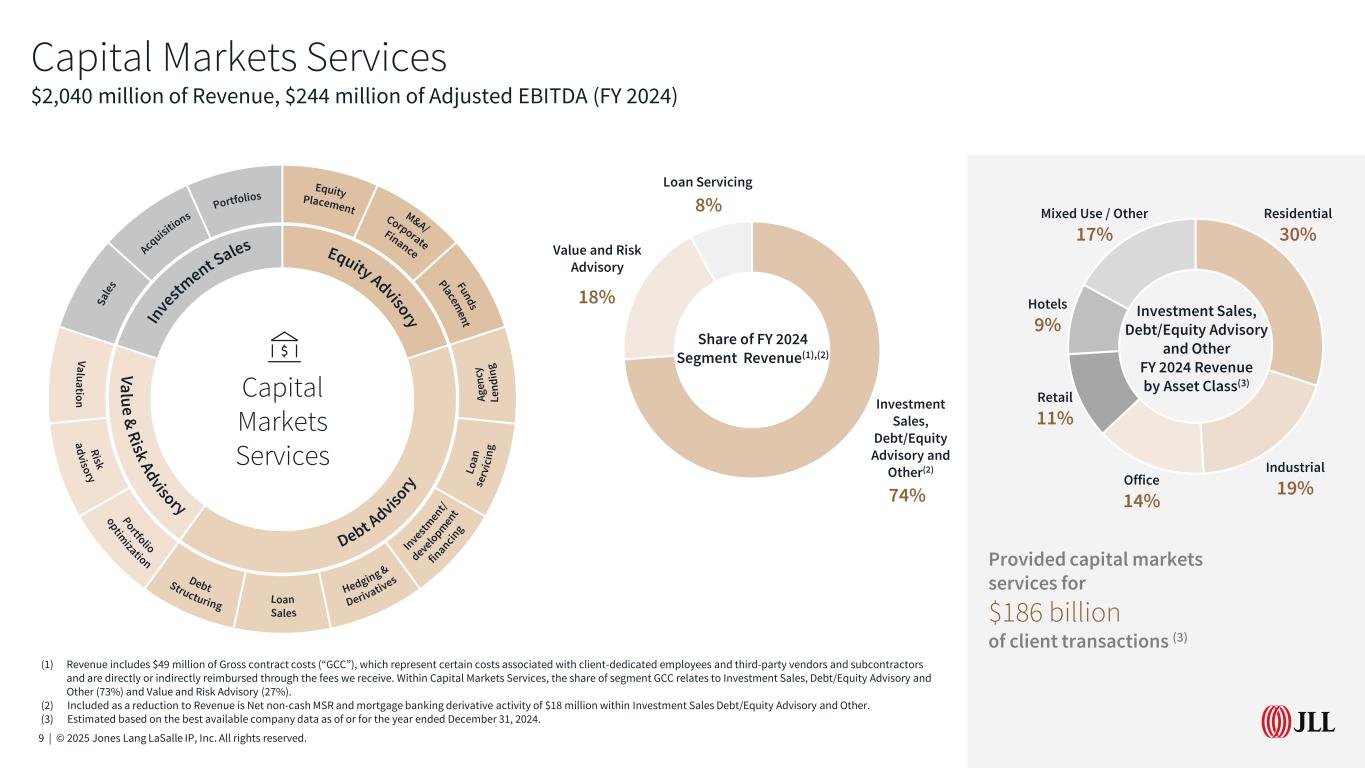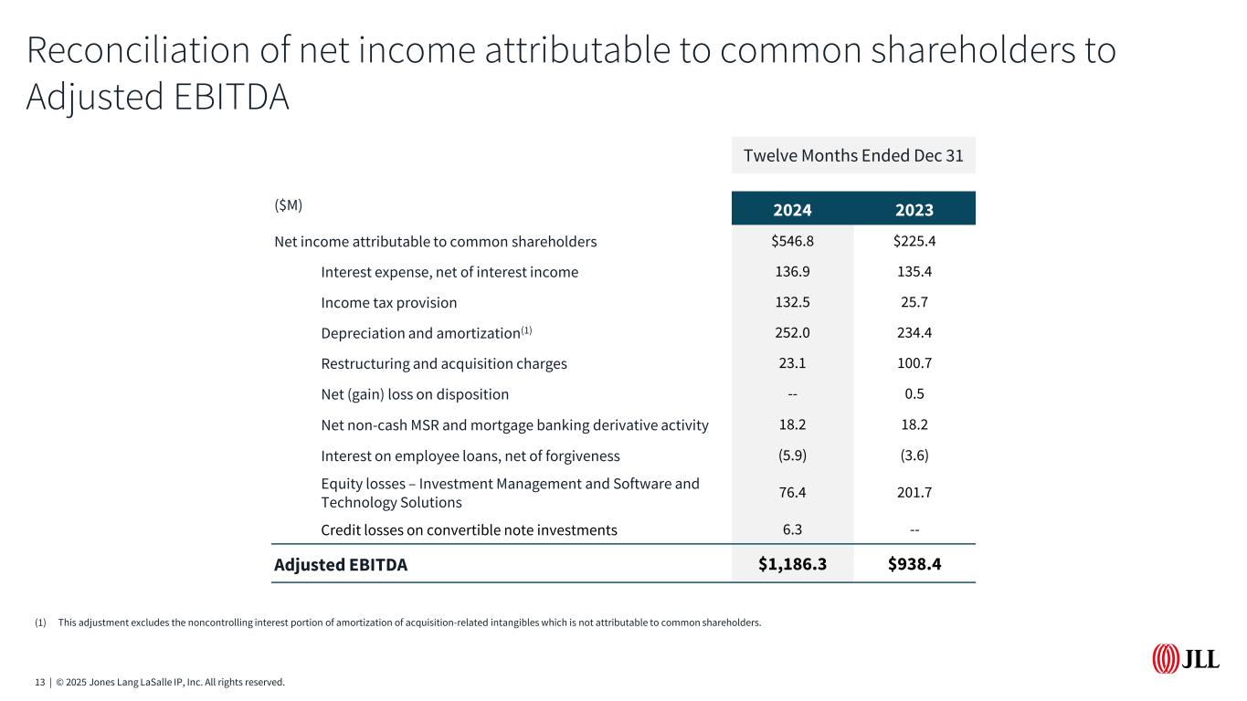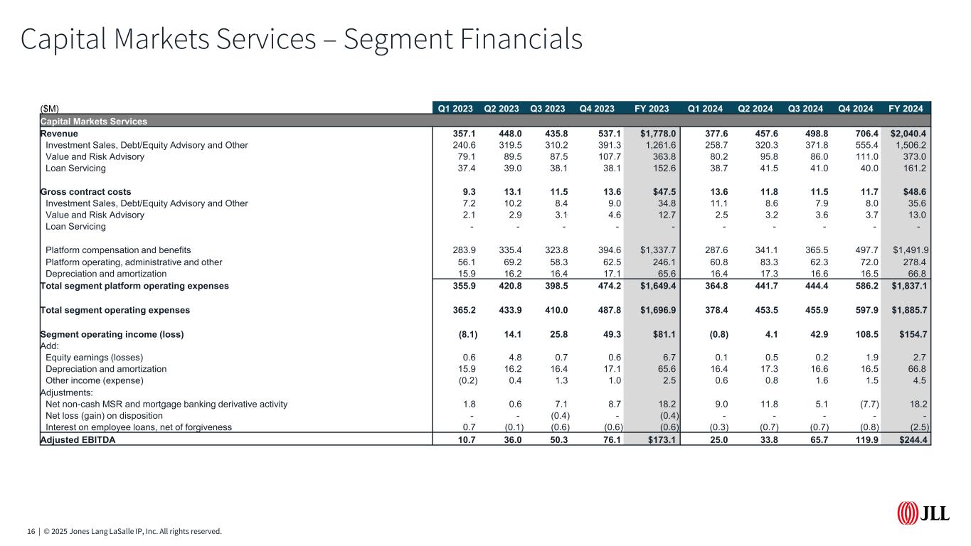 Non-GAAP measures Management uses certain non-GAAP financial measures to develop budgets and forecasts, measure and reward performance against those budgets and forecasts, and enhance comparability to prior periods. These measures are believed to be useful to investors and other external stakeholders as supplemental measures of core operating performance and include Adjusted EBITDA attributable to common shareholders ("Adjusted EBITDA"). However, non-GAAP financial measures should not be considered alternatives to measures determined in accordance with U.S. generally accepted accounting principles (“GAAP”). Any measure that eliminates components of a company’s capital structure, cost of operations or investments, or other results has limitations as a performance measure. In light of these limitations, management also considers GAAP financial measures and does not rely solely on non-GAAP financial measures. Because the company's non-GAAP financial measures are not calculated in accordance with GAAP, they may not be comparable to similarly titled measures used by other companies. Adjustments to GAAP Financial Measures Used to Calculate non-GAAP Financial Measures Net Non-Cash Mortgage Servicing Rights ("MSR") and Mortgage Banking Derivative Activity consists of the balances presented within Revenue composed of (i) derivative gains/losses resulting from mortgage banking loan commitment and warehousing activity and (ii) gains recognized from the retention of MSR upon origination and sale of mortgage loans, offset by (iii) amortization of MSR intangible assets over the period that net servicing income is projected to be received. Non-cash derivative gains/losses resulting from mortgage banking loan commitment and warehousing activity are calculated as the estimated fair value of loan commitments and subsequent changes thereof, primarily represented by the estimated net cash flows associated with future servicing rights. MSR gains and corresponding MSR intangible assets are calculated as the present value of estimated cash flows over the estimated mortgage servicing periods. The above activity is reported entirely within Revenue of the Capital Markets Services segment. Excluding net non-cash MSR and mortgage banking derivative activity reflects how the company manages and evaluates performance because the excluded activity is non-cash in nature. 19 | © 2025 Jones Lang LaSalle IP, Inc. All rights reserved.