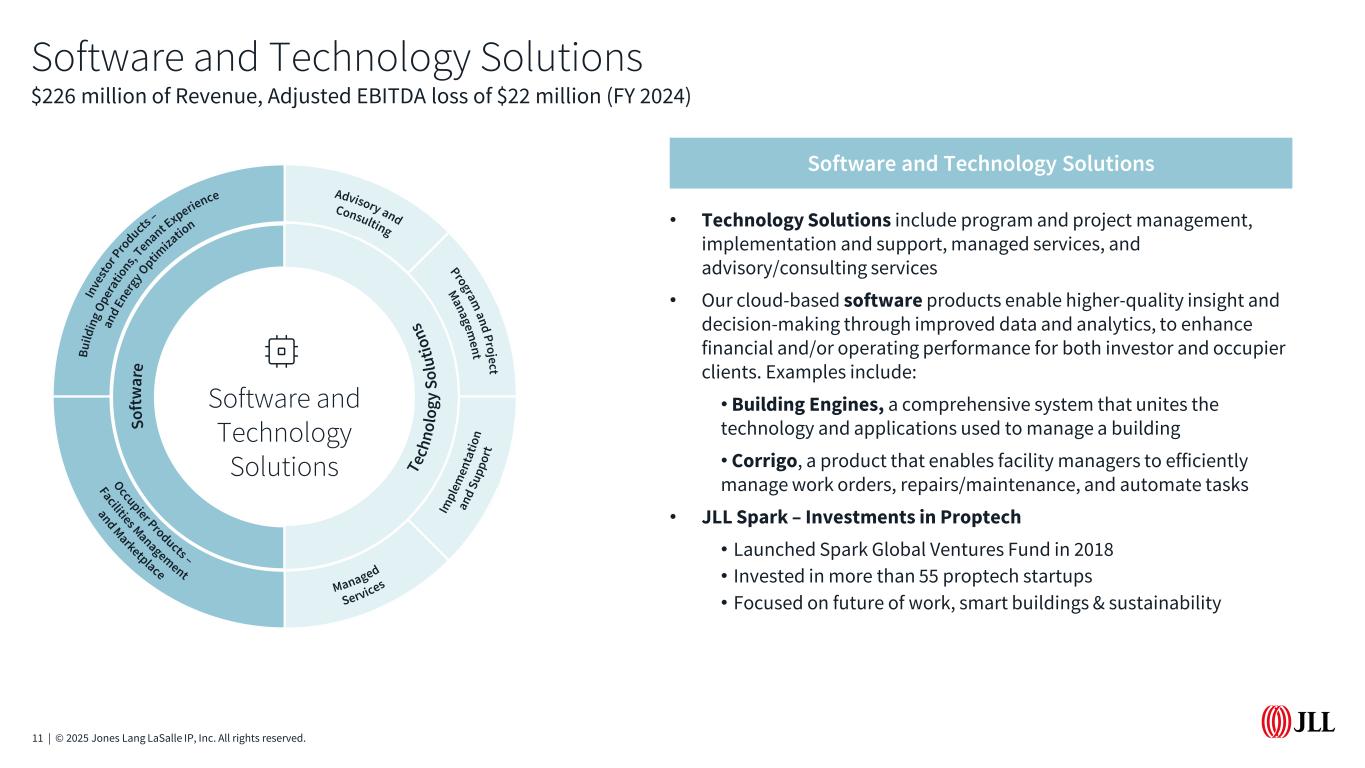 10 | © 2025 Jones Lang LaSalle IP, Inc. All rights reserved. Investment Management $468 million of Revenue, $100 million of Adjusted EBITDA (FY 2024) Incentive Fees 13% Transaction Fees and Other 7% Advisory Fees 80% Office 25% Industrial 22% Other 10% Retail 9% Multifamily 18% Q4’24 AUM By Asset Class(2),(3) Investment Management Uncalled Committed Capital + Cash 16% $89B Assets under management (AUM) (2) $30B Capital commitments raised since 2020 (3) (1) Revenue includes $37 million of Gross contract costs (“GCC”) , which represent certain costs associated with client-dedicated employees and third-party vendors and subcontractors and are directly or indirectly reimbursed through the fees we receive. (2) AUM as of December 31, 2024, reported on a one quarter lag. (3) Estimated based on the best available company data as of December 31, 2024. Share of FY 2024 Segment Revenue(1)