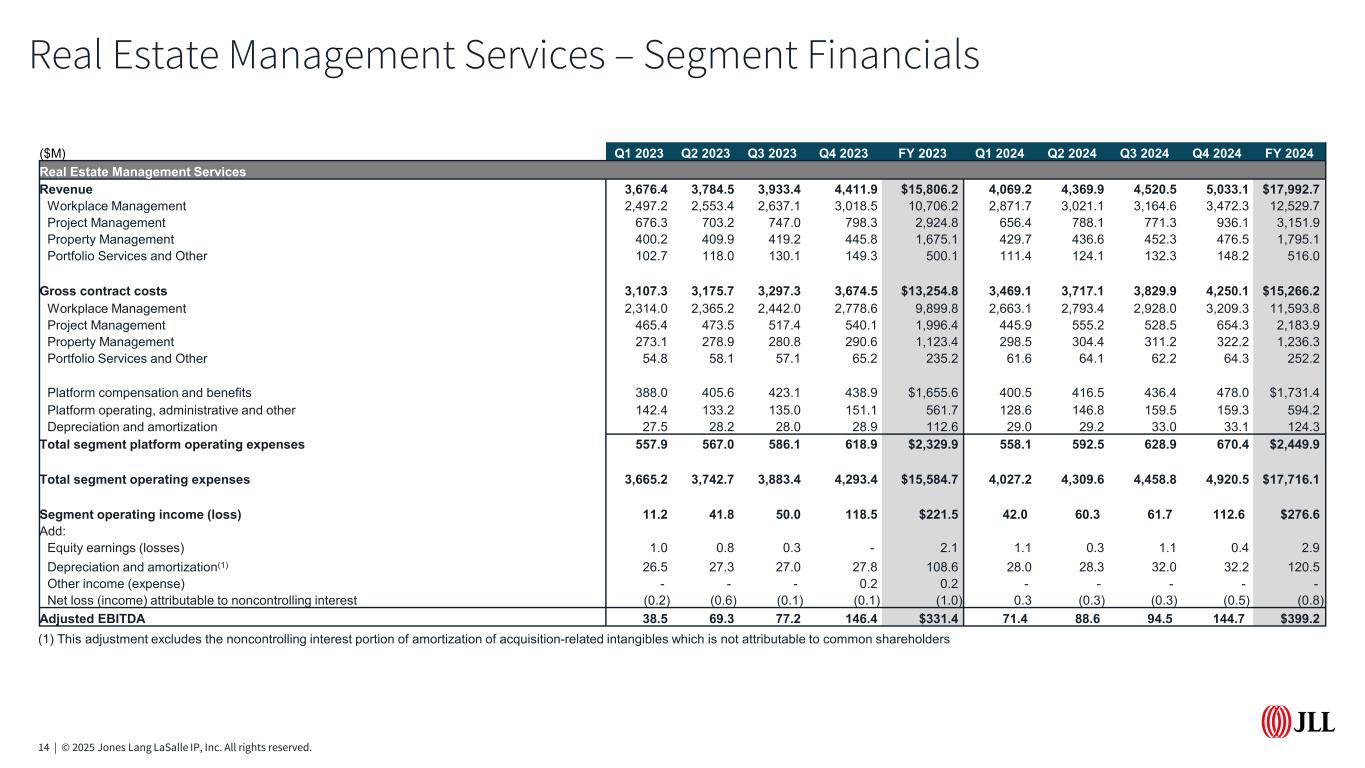 Reconciliation of net income attributable to common shareholders to Adjusted EBITDA Twelve Months Ended Dec 31 ($M) 2024 2023 Net income attributable to common shareholders $546.8 $225.4 Interest expense, net of interest income 136.9 135.4 Income tax provision 132.5 25.7 Depreciation and amortization(1) 252.0 234.4 Restructuring and acquisition charges 23.1 100.7 Net (gain) loss on disposition -- 0.5 Net non-cash MSR and mortgage banking derivative activity 18.2 18.2 Interest on employee loans, net of forgiveness (5.9) (3.6) Equity losses – Investment Management and Software and Technology Solutions 76.4 201.7 Credit losses on convertible note investments 6.3 -- Adjusted EBITDA $1,186.3 $938.4 (1) This adjustment excludes the noncontrolling interest portion of amortization of acquisition-related intangibles which is not attributable to common shareholders. 13 | © 2025 Jones Lang LaSalle IP, Inc. All rights reserved.