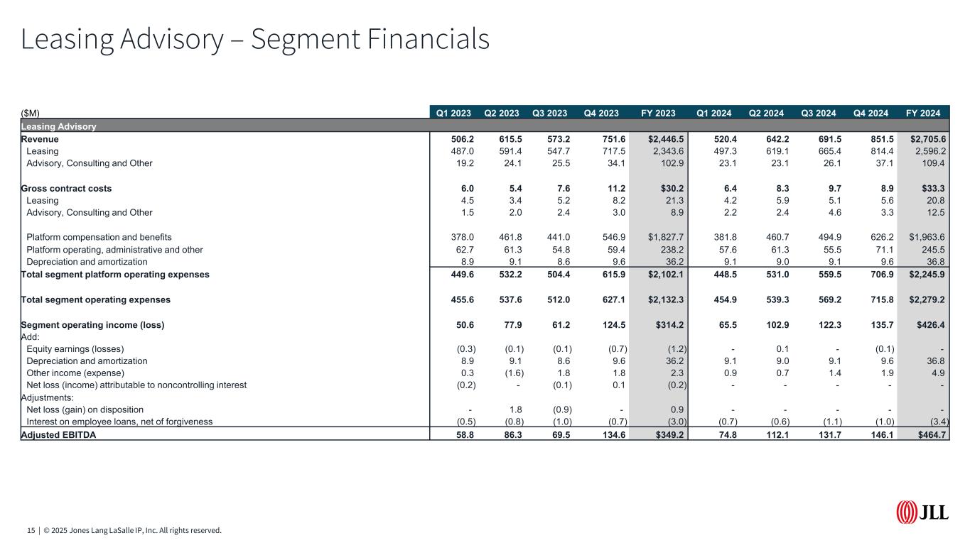 Real Estate Management Services – Segment Financials 14 | © 2025 Jones Lang LaSalle IP, Inc. All rights reserved. ($M) Q1 2023 Q2 2023 Q3 2023 Q4 2023 FY 2023 Q1 2024 Q2 2024 Q3 2024 Q4 2024 FY 2024 Real Estate Management Services Revenue 3,676.4 3,784.5 3,933.4 4,411.9 $15,806.2 4,069.2 4,369.9 4,520.5 5,033.1 $17,992.7 Workplace Management 2,497.2 2,553.4 2,637.1 3,018.5 10,706.2 2,871.7 3,021.1 3,164.6 3,472.3 12,529.7 Project Management 676.3 703.2 747.0 798.3 2,924.8 656.4 788.1 771.3 936.1 3,151.9 Property Management 400.2 409.9 419.2 445.8 1,675.1 429.7 436.6 452.3 476.5 1,795.1 Portfolio Services and Other 102.7 118.0 130.1 149.3 500.1 111.4 124.1 132.3 148.2 516.0 Gross contract costs 3,107.3 3,175.7 3,297.3 3,674.5 $13,254.8 3,469.1 3,717.1 3,829.9 4,250.1 $15,266.2 Workplace Management 2,314.0 2,365.2 2,442.0 2,778.6 9,899.8 2,663.1 2,793.4 2,928.0 3,209.3 11,593.8 Project Management 465.4 473.5 517.4 540.1 1,996.4 445.9 555.2 528.5 654.3 2,183.9 Property Management 273.1 278.9 280.8 290.6 1,123.4 298.5 304.4 311.2 322.2 1,236.3 Portfolio Services and Other 54.8 58.1 57.1 65.2 235.2 61.6 64.1 62.2 64.3 252.2 Platform compensation and benefits 388.0 405.6 423.1 438.9 $1,655.6 400.5 416.5 436.4 478.0 $1,731.4 Platform operating, administrative and other 142.4 133.2 135.0 151.1 561.7 128.6 146.8 159.5 159.3 594.2 Depreciation and amortization 27.5 28.2 28.0 28.9 112.6 29.0 29.2 33.0 33.1 124.3 Total segment platform operating expenses 557.9 567.0 586.1 618.9 $2,329.9 558.1 592.5 628.9 670.4 $2,449.9 Total segment operating expenses 3,665.2 3,742.7 3,883.4 4,293.4 $15,584.7 4,027.2 4,309.6 4,458.8 4,920.5 $17,716.1 Segment operating income (loss) 11.2 41.8 50.0 118.5 $221.5 42.0 60.3 61.7 112.6 $276.6 Add: Equity earnings (losses) 1.0 0.8 0.3 - 2.1 1.1 0.3 1.1 0.4 2.9 Depreciation and amortization(1) 26.5 27.3 27.0 27.8 108.6 28.0 28.3 32.0 32.2 120.5 Other income (expense) - - - 0.2 0.2 - - - - - Net loss (income) attributable to noncontrolling interest (0.2) (0.6) (0.1) (0.1) (1.0) 0.3 (0.3) (0.3) (0.5) (0.8) Adjusted EBITDA 38.5 69.3 77.2 146.4 $331.4 71.4 88.6 94.5 144.7 $399.2 (1) This adjustment excludes the noncontrolling interest portion of amortization of acquisition-related intangibles which is not attributable to common shareholders