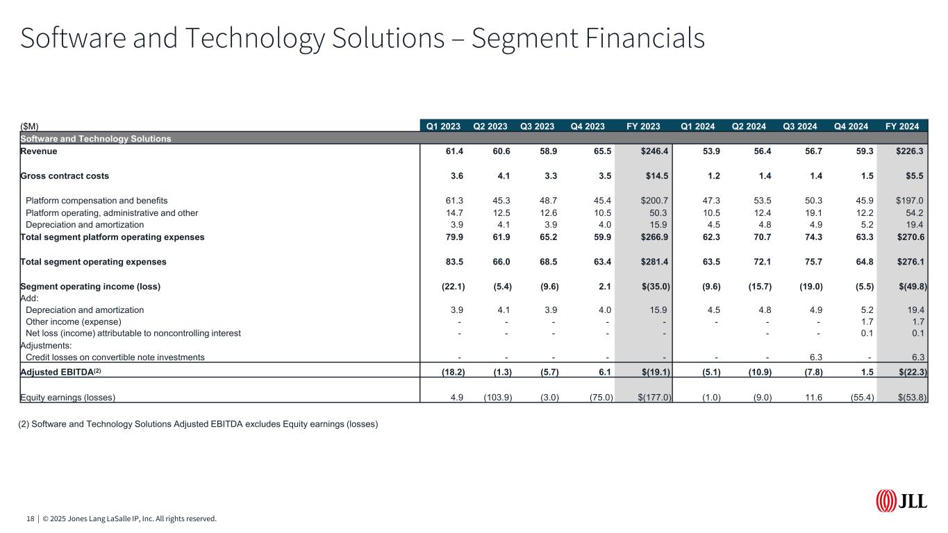 Investment Management – Segment Financials 17 | © 2025 Jones Lang LaSalle IP, Inc. All rights reserved. ($M) Q1 2023 Q2 2023 Q3 2023 Q4 2023 FY 2023 Q1 2024 Q2 2024 Q3 2024 Q4 2024 FY 2024 Investment Management Revenue 114.4 143.9 110.1 115.3 $483.7 103.4 102.6 101.3 160.6 $467.9 Advisory Fees 100.5 103.1 102.7 99.9 406.2 92.3 93.1 92.7 95.7 373.8 Transaction Fees & Other 10.4 5.0 7.4 7.2 30.0 8.9 6.9 8.6 9.1 33.5 Incentive Fees 3.5 35.8 - 8.2 47.5 2.2 2.6 - 55.8 60.6 Gross contract costs 7.1 7.5 7.4 6.9 $28.9 8.4 8.8 9.3 10.9 $37.4 Platform compensation and benefits 68.9 84.4 63.2 72.2 288.7 61.3 59.0 59.8 88.8 268.9 Platform operating, administrative and other 15.2 17.1 14.0 16.3 62.6 12.9 20.5 18.7 17.7 69.8 Depreciation and amortization 1.3 2.3 2.2 2.3 8.1 2.0 2.0 1.9 2.6 8.5 Total segment platform operating expenses 85.4 103.8 79.4 90.8 $359.4 76.2 81.5 80.4 109.1 $347.2 Total segment operating expenses 92.5 111.3 86.8 97.7 $388.3 84.6 90.3 89.7 120.0 $384.6 Segment operating income (loss) 21.9 32.6 23.3 17.6 $95.4 18.8 12.3 11.6 40.6 $83.3 Add: Depreciation and amortization 1.3 2.3 2.2 2.3 8.1 2.0 2.0 1.9 2.6 8.5 Other income (expense) - - (0.1) - (0.1) - 8.2 (0.1) (0.3) 7.8 Net loss (income) attributable to noncontrolling interest (0.1) (0.1) 0.6 - 0.4 0.2 0.2 0.6 (0.3) 0.7 Adjusted EBITDA(2) 23.1 34.8 26.0 19.9 $103.8 21.0 22.7 14.0 42.6 $100.3 Equity earnings (losses) (8.8) (5.1) (9.1) (1.7) $(24.7) (3.9) (7.3) (13.8) 2.4 $(22.6) (2) Investment Management Adjusted EBITDA excludes Equity earnings (losses)
