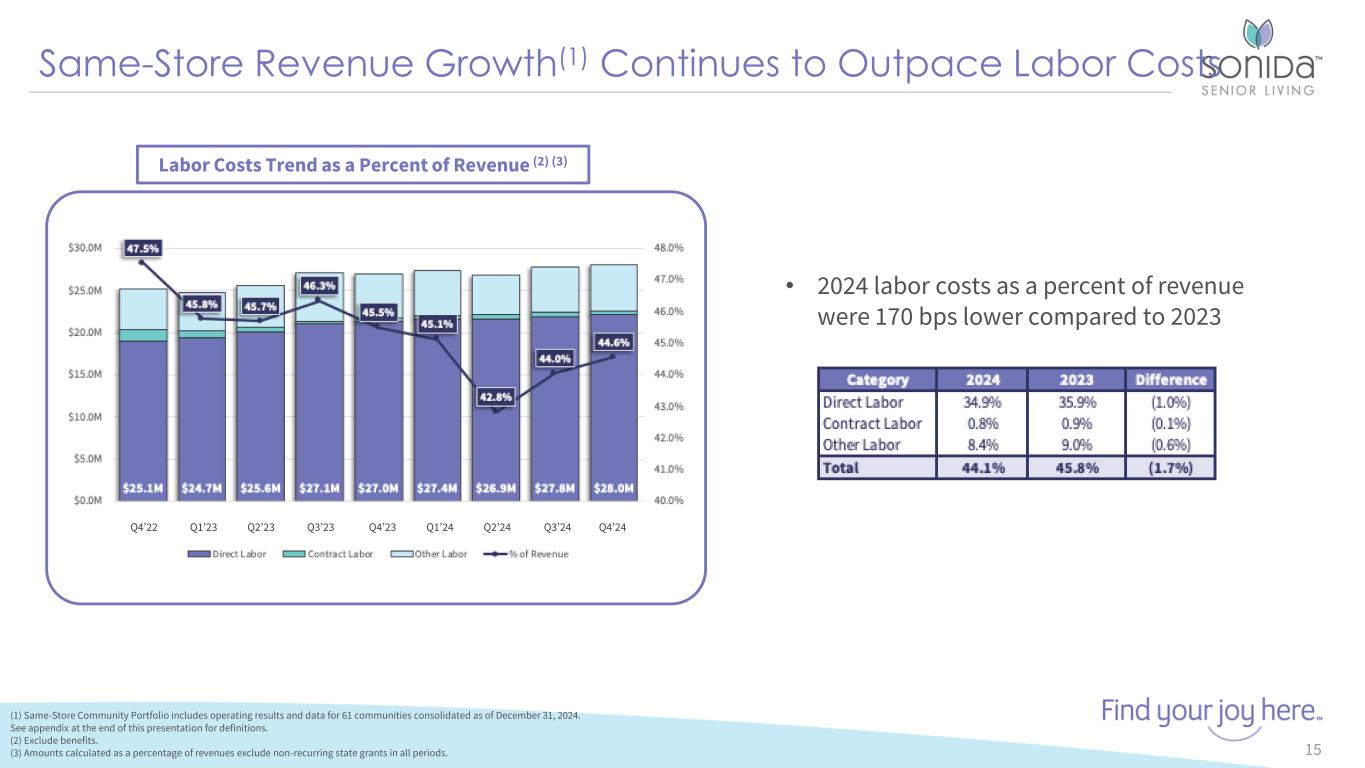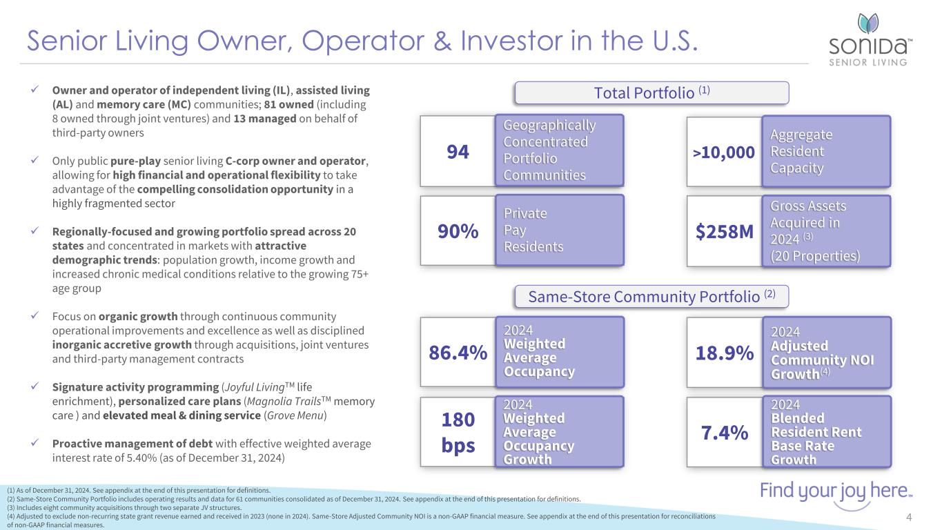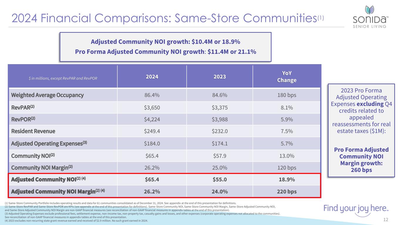 テキサス州ダラス発-2025年3月17日-高齢者向け住宅コミュニティーの所有、運営、投資の大手企業であるソニダ・シニアリビング社(NYSE: SNDA)は本日、第4四半期および2024年12月31日を期末とする通期の業績を発表しました。