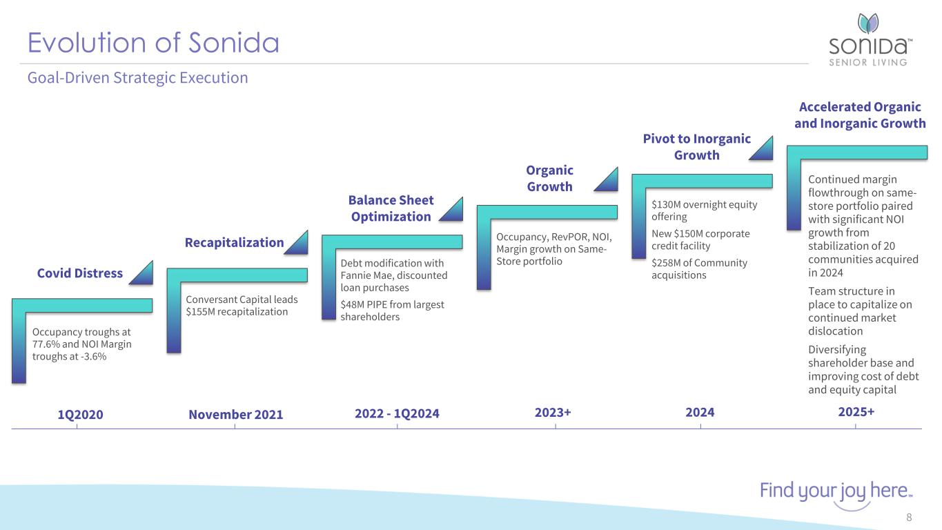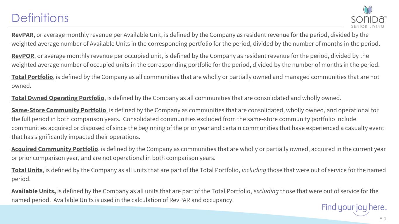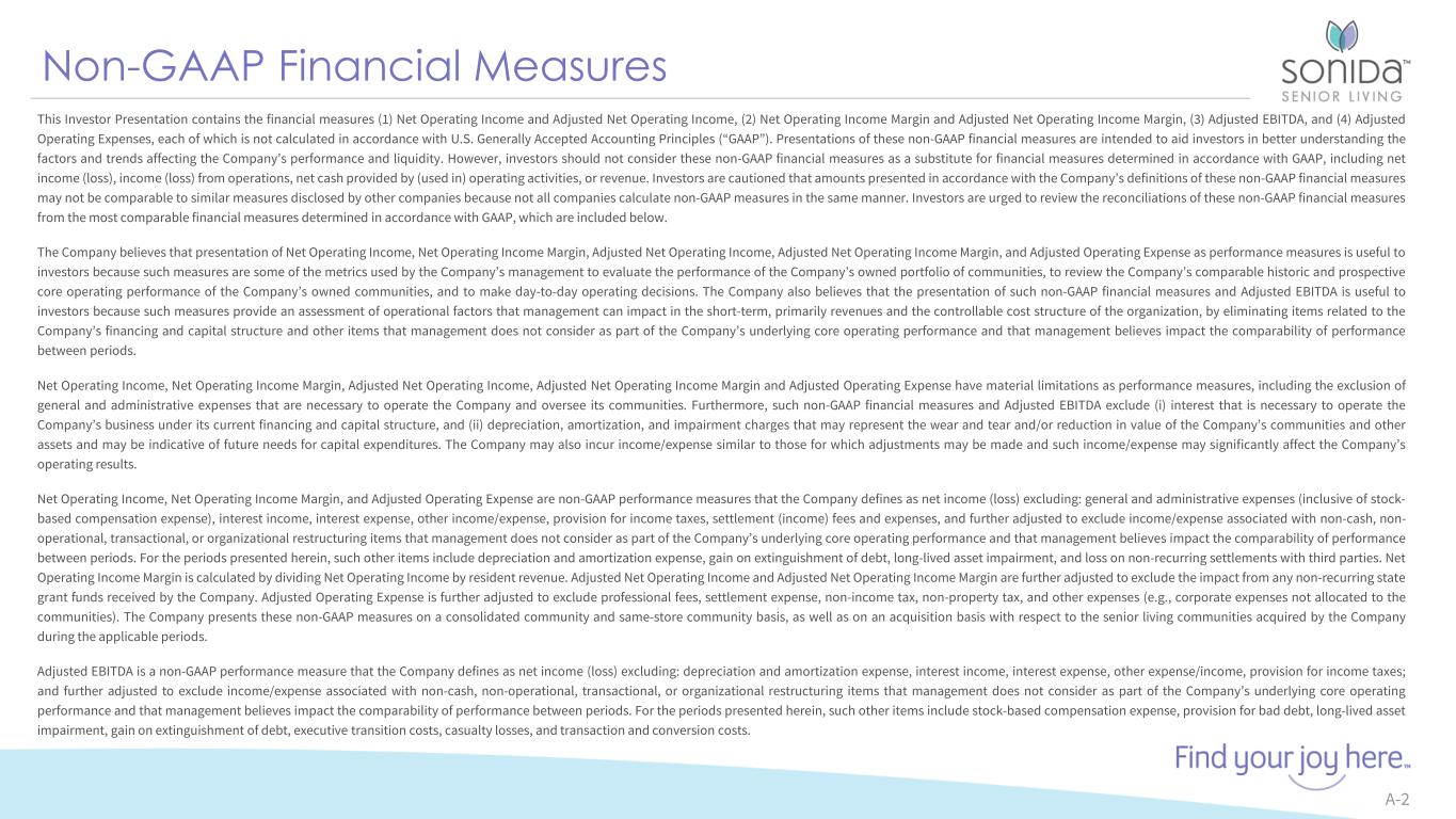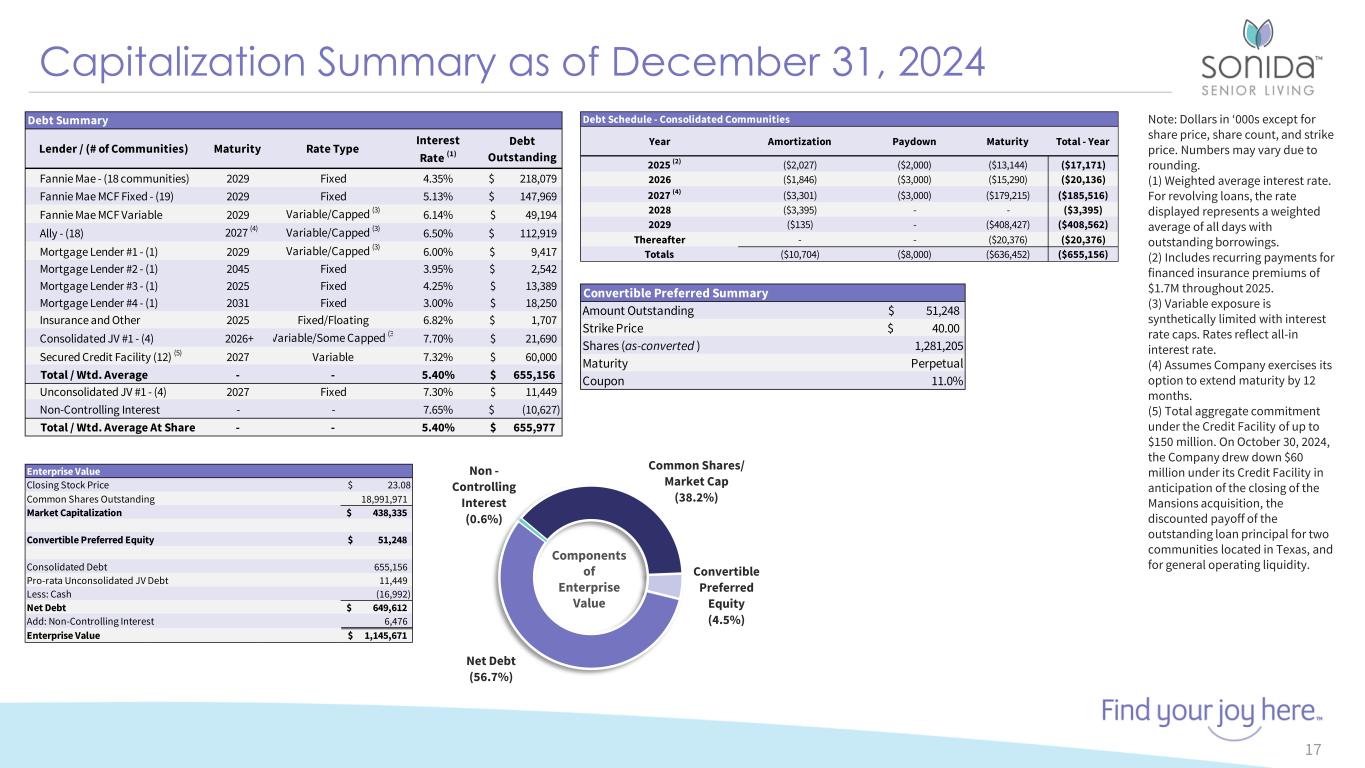 2024年10月、当社は有担保上位リボルビング・クレジット・ファシリティ(以下「クレジット・ファシリティ」)の下、7,500万ドルの追加コミットメントを実行した。この7,500万ドルの追加利用可能額により、与信枠のコミットメント総額は最大1億5,000万ドルとなる。与信枠の期間は3年で、SOFRプラス2.10%のマージンからSOFRプラス2.60%の間でレバレッジベースの価格マトリックスが設定され、ソニダへの完全リコースとなっています。2024年10月30日、当社は与信枠のもとで6,000万ドルを借り入れ、アトランタ買収およびテキサスDPO(以下に定義)の資金調達、ならびに流動性および一般的な企業目的のために使用しました。与信枠に基づく借入可能額は通常、与信枠に基づく当社の債務を担保するシニア・リビング・コミュニティの価値に基づいて決定される。現在の借入金は6,000万ドルで、13のシニア・リビング・コミュニティが担保となっている。