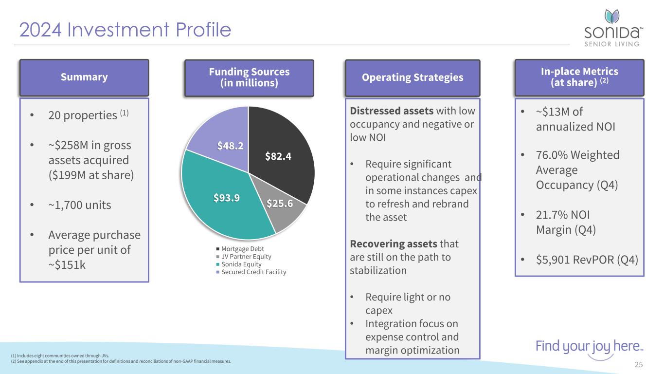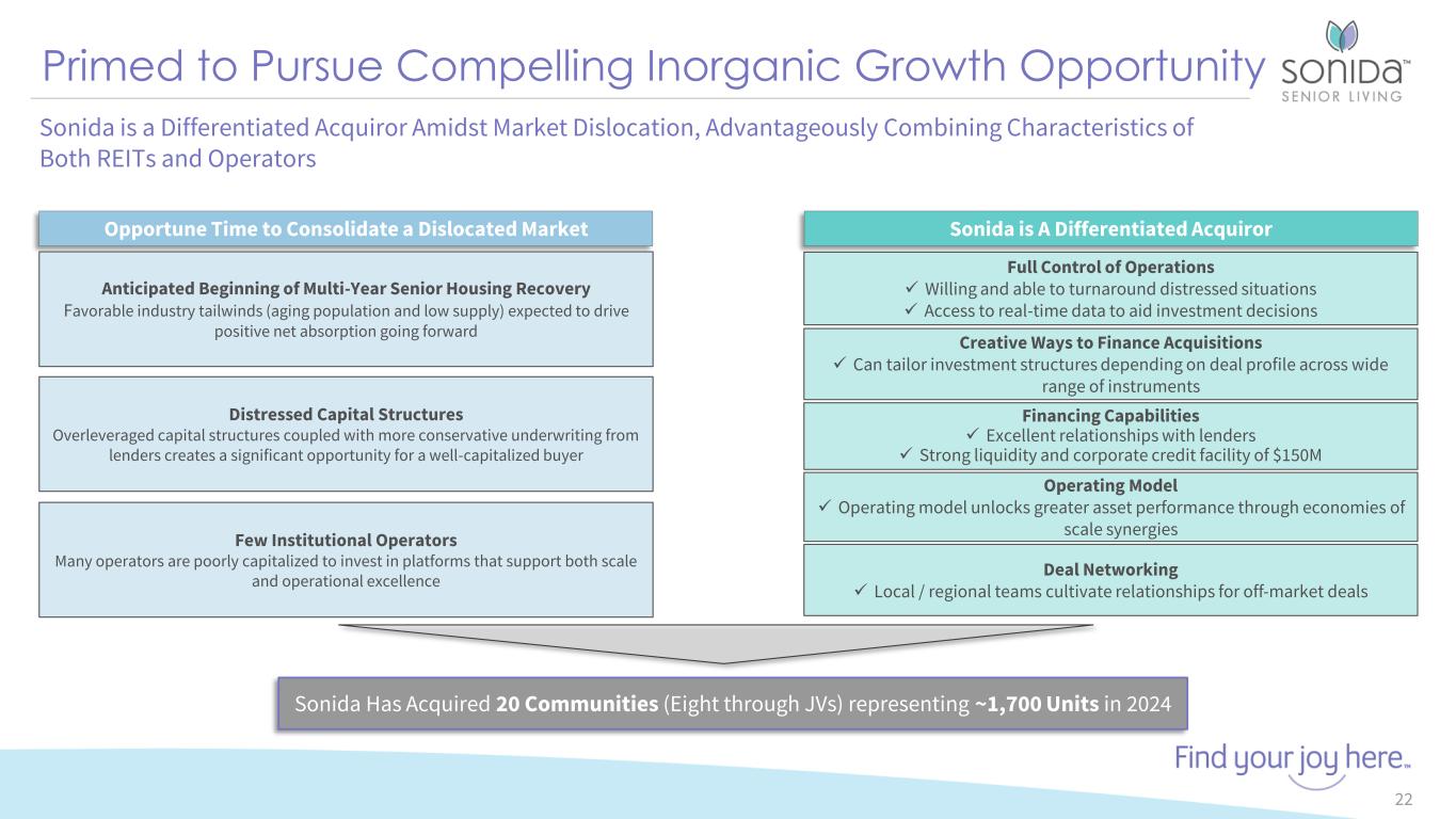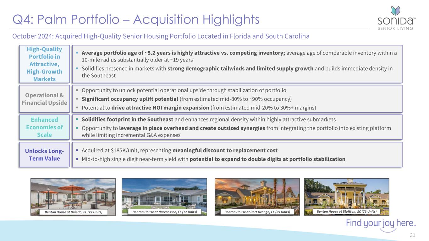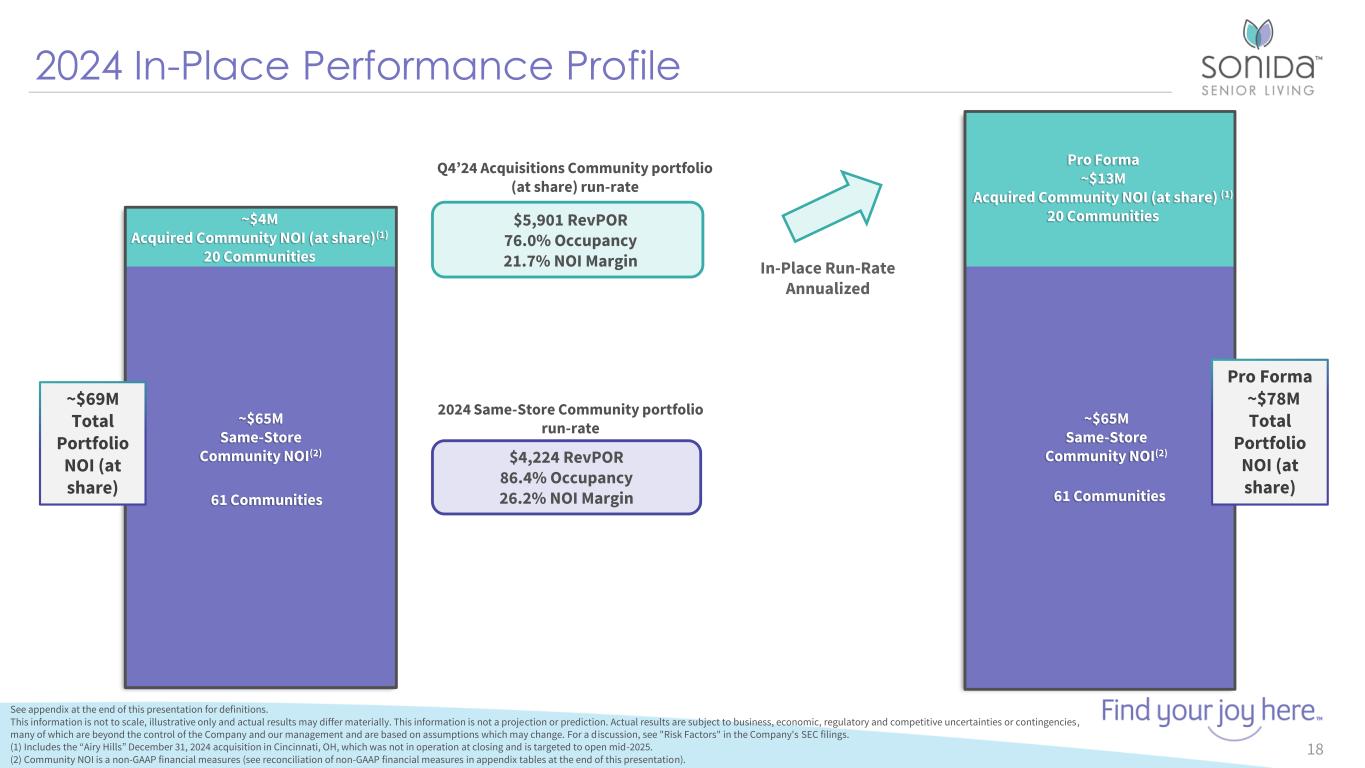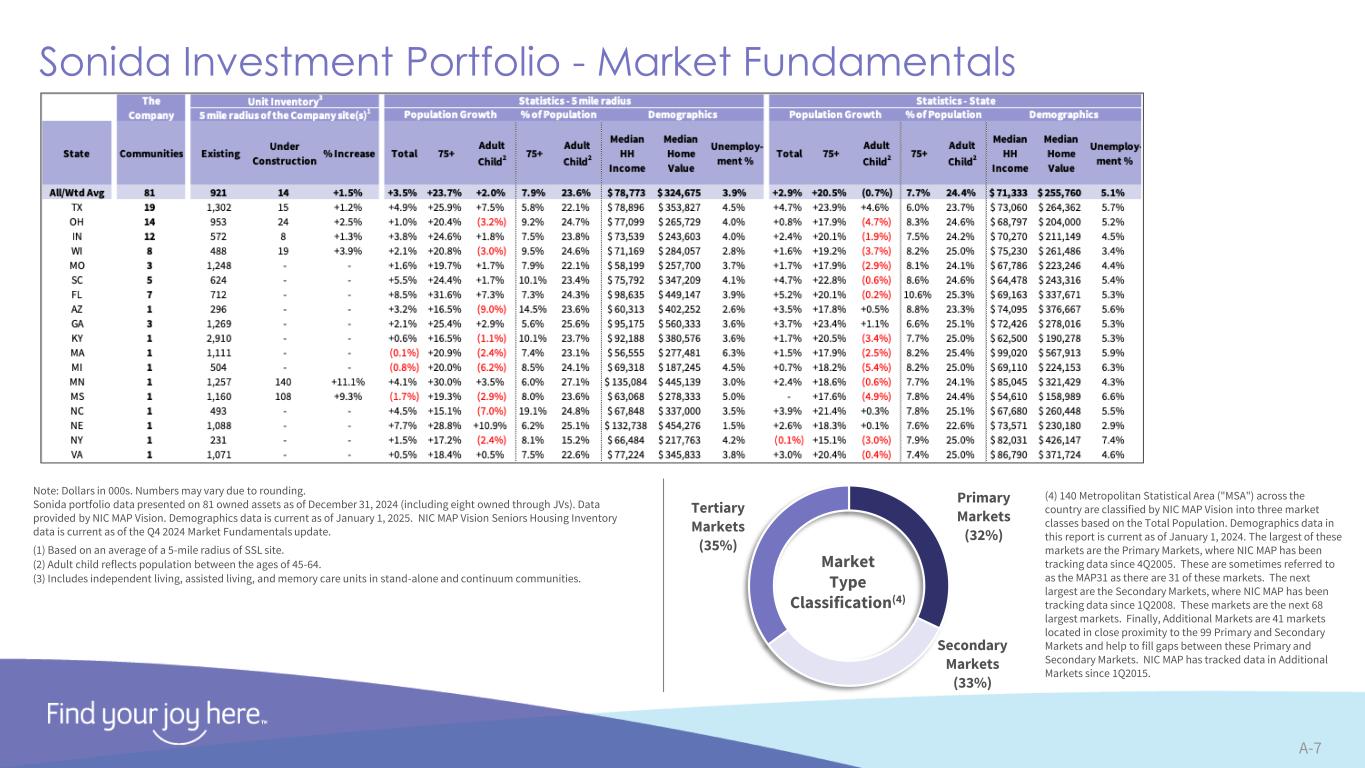 「2024 年はソニダにとって変革の年であり、有機的・無機的成長と継続的なバランスシートの強化が際立ちました。すべての主要指標の改善に牽引され、既存店NOIは今年も力強い伸びを示し、これに加え、大きなアップサイドを内包する20の優良コミュニティを取得しました。ソニダは、初のオーバーナイト株式公開を実施し、新たな有担保法人信用枠を設定することで、買収活動を急ピッチで進めるための資金を確保しました。ブランドン・リバー社長兼最高経営責任者(CEO)は次のように述べています。「こうした活動を積み重ねることで、ソニダは2025年にNOIを加速度的に成長させることができ、当社のオーナー/オペレーター・モデルと入居者の体験に対するハイタッチ・アプローチの威力を実証することができました。