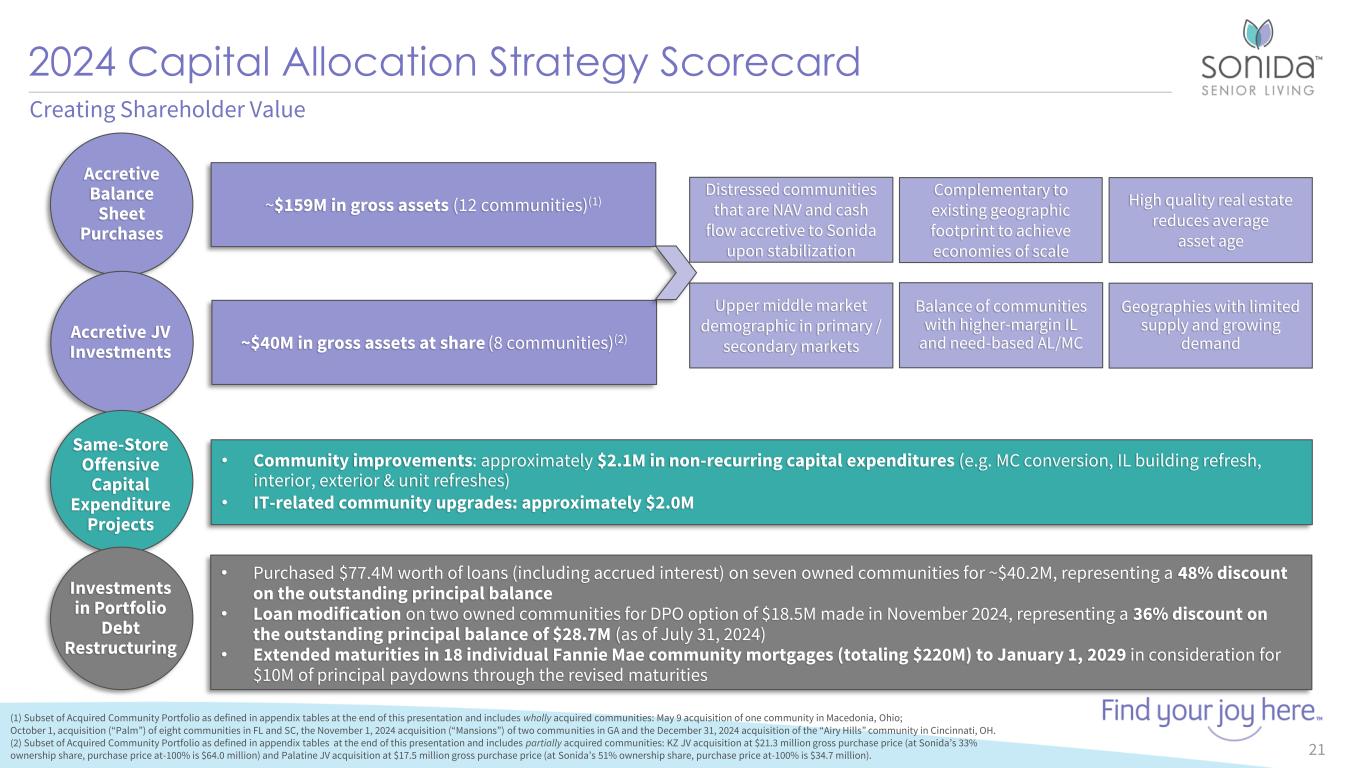 2024年11月、当社は、テキサス州に所在する2つのコミュニティについて、ローン元本のディスカウントペイオフ(以下「テキサ スDPO」)を行うオプションを行使した。テキサスDPOの金額1,830万ドルは、未払い元本合計2,840万ドル(2024年11月1日時点)に対する36%の割引に相当する。テキサスDPOは、当社のレガシー債務ポートフォリオの最後の重要なリストラクチャリングであり、60件中58件のローンが過去12ヶ月間に処理された。