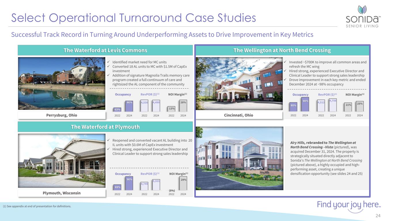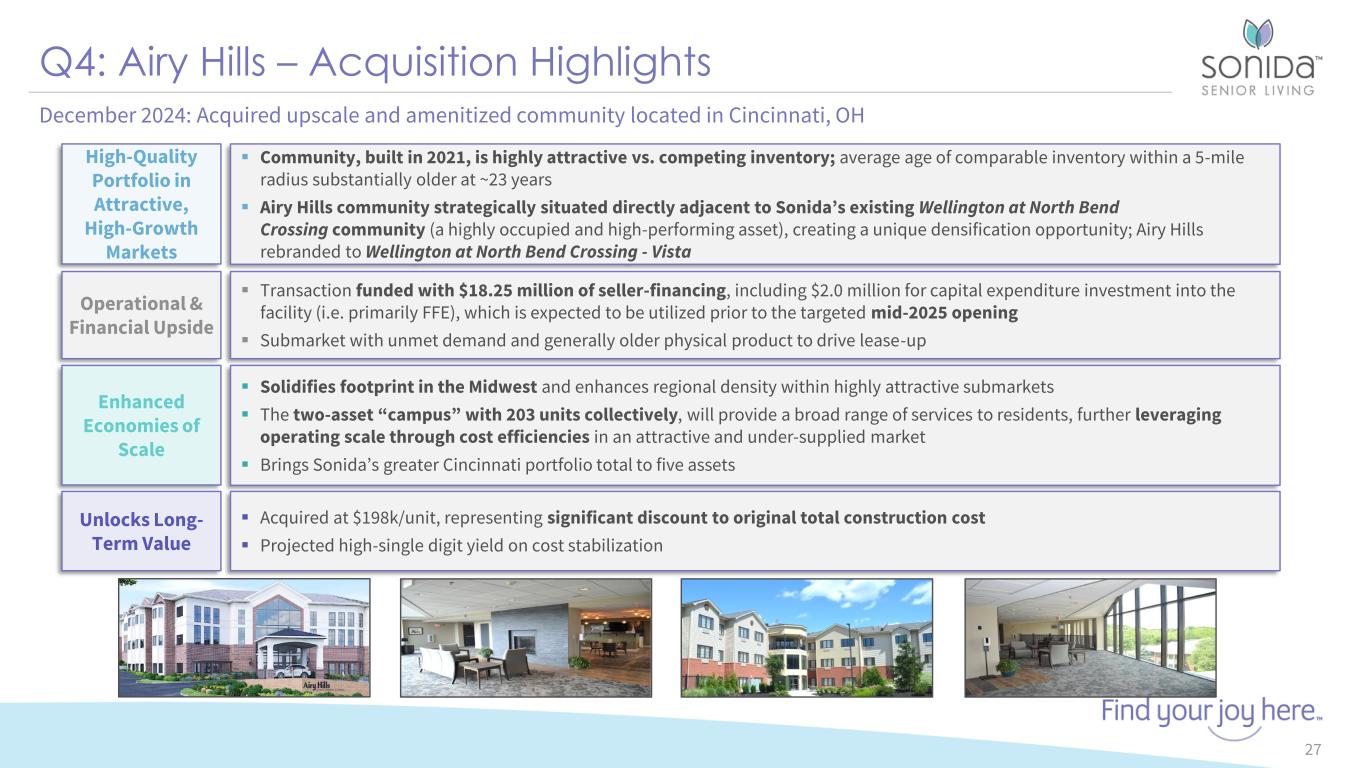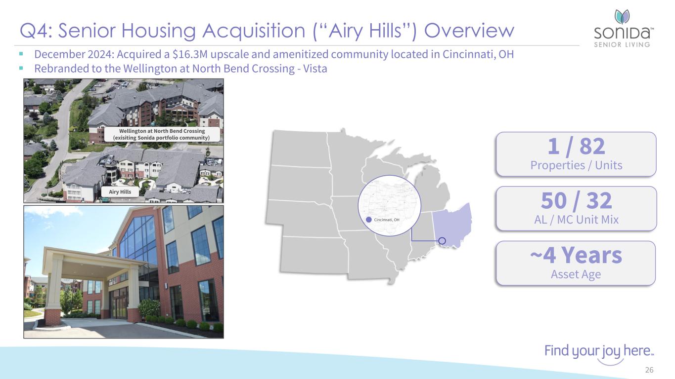 2024年12月、当社はオハイオ州シンシナティにある未入居の高齢者向け住宅1棟を1,630万ドルで取得しました。ソニダはこの取引に1,830万ドルのシニア・モーゲージ債務を調達しました。このうち200万ドルは施設への資本支出投資に充当され、コミュニティ開設前の家具や入居者の受け入れ準備に充当される予定です。ノンリコース・ローンは、リースアップと安定化を支援するため、84ヶ月の期間と24ヶ月の金利免除があり、その後は3%の固定金利のみとなる。地理的に近接しているため、このコミュニティは当社の既存コミュニティであるウェリントン・アット・ノースベンド・クロッシングとのデュアルキャンパスとして運営されている。