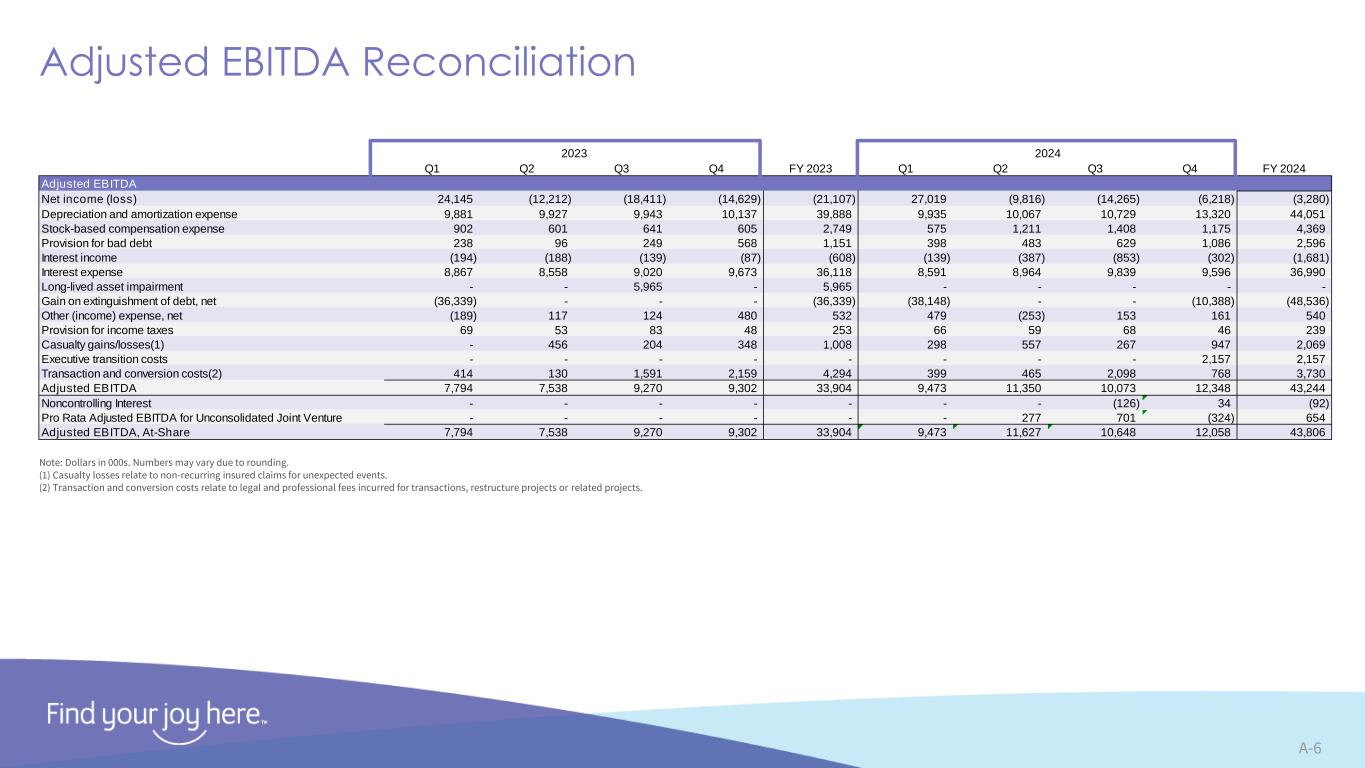コミュニティ事業営業利益率は、2024年通年で26.2%、2023年通年で25.0%。2023年に受領した州からの救済補助金290万ドルを除いた調整後のコミュニティ営業利益率は、2024年通期で26.2%、2023年通期で24.0%。