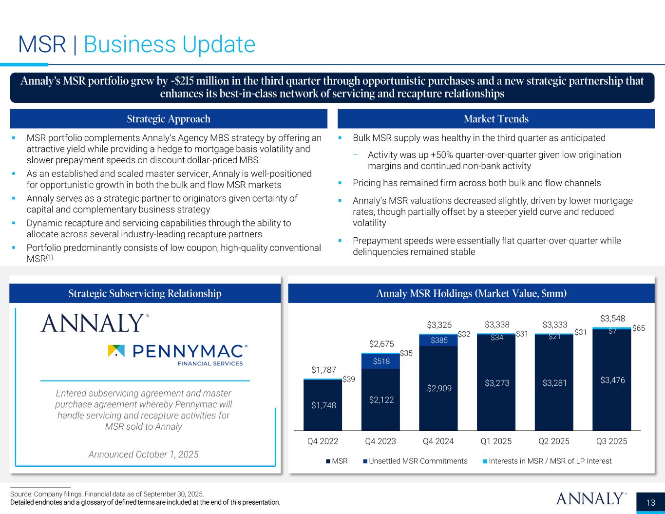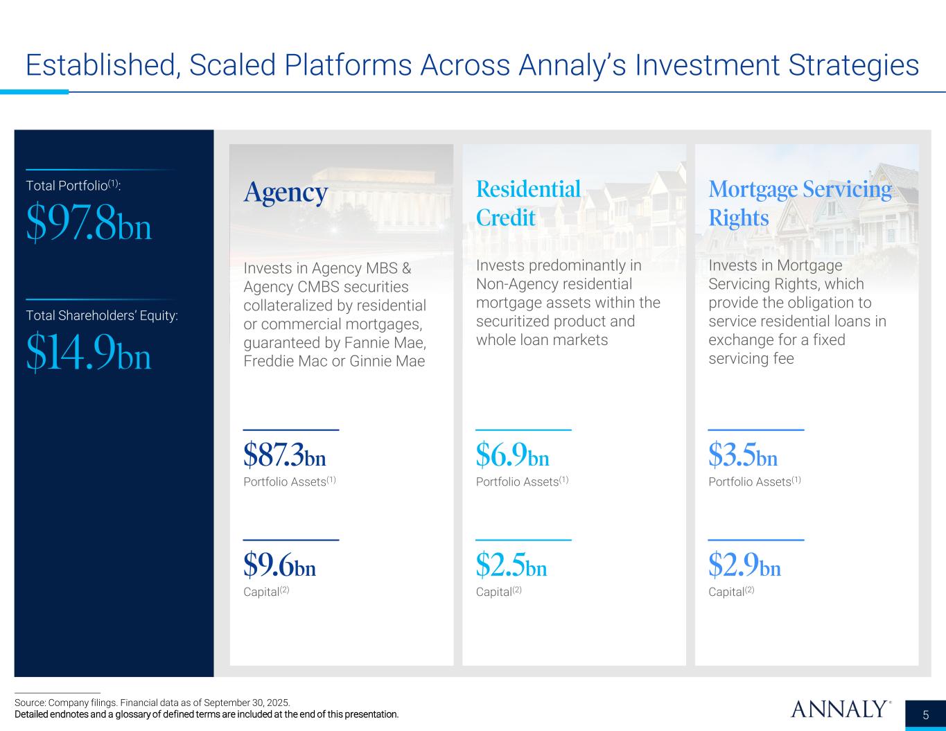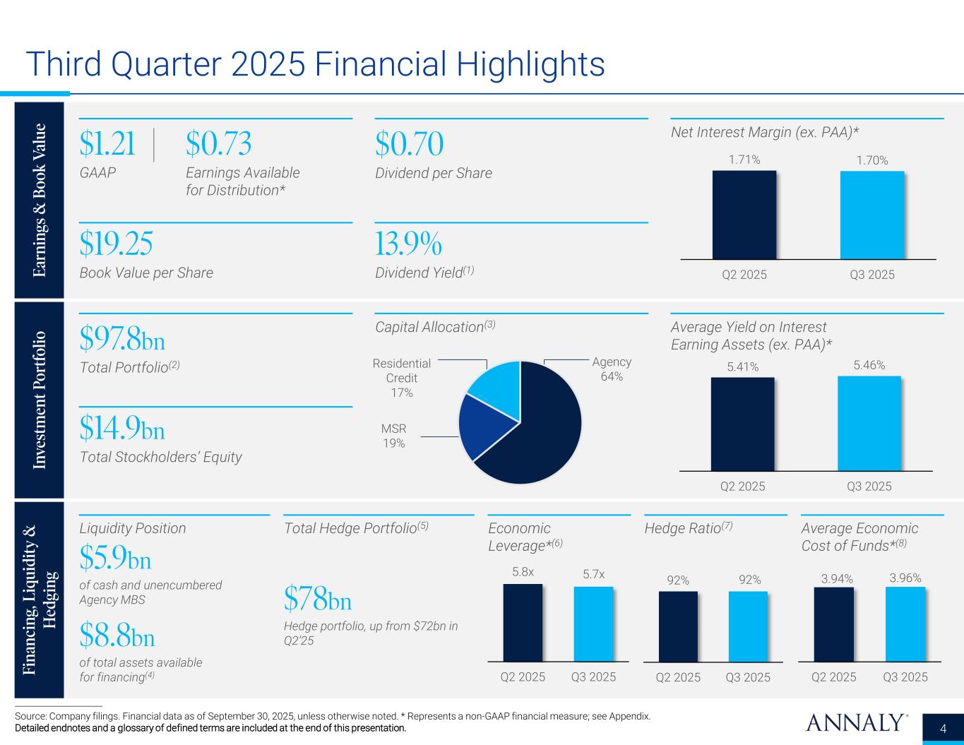 Recent Achievements and Performance Highlights Source: Company filings. Financial data as of September 30, 2025, unless otherwise noted. * Represents a non-GAAP financial measure; see Appendix. Detailed endnotes and a glossary of defined terms are included at the end of this presentation. Financial Performance Annaly delivered a strong economic return and earnings continued to exceed the dividend as the operating environment improved Earnings available for distribution* of $0.73 per average common share for the quarter Book value per common share of $19.25 Declared quarterly common stock cash dividend of $0.70 per share Economic return of 8.1% for the quarter and 11.5% year-to-date through the third quarter Financing, Capital & Liquidity Enhanced liquidity and maintained prudent leverage during the quarter while opportunistically accessing the capital markets Economic leverage* of 5.7x, down from 5.8x in the second quarter $8.8 billion of total assets available for financing(1), including cash and unencumbered Agency MBS of $5.9 billion Annaly Residential Credit Group remains the largest non-bank issuer and the second largest issuer overall of Prime Jumbo and Expanded Credit MBS, pricing 24 residential whole loan securitizations totaling $12.4 billion in proceeds in 2025 year-to-date(2) Average GAAP cost of interest-bearing liabilities of 4.73%, down 3 basis points quarter-over-quarter, and average economic cost of interest-bearing liabilities* of 3.96%, up 2 basis points quarter-over-quarter Raised $1.1 billion of accretive capital during the quarter, including $823 million(3) of common equity through the Company’s at-the-market sales program and $275 million(4) through the issuance of 8.875% Series J fixed-rate cumulative redeemable preferred stock Portfolio Performance Overweight Agency MBS given attractive relative returns while continuing to achieve milestones across Residential Credit and MSR Total portfolio of $97.8 billion(5), including $87.3 billion in highly liquid Agency MBS strategy, which represents 89% of total assets and 64% of dedicated capital Majority of the capital raised during the quarter was allocated to Annaly’s Agency portfolio, which grew by 10%. New purchases were predominantly in specified pools with call protection across 5.5% and 6.0% coupons Annaly’s Residential Credit portfolio increased 4% to $6.9 billion(5), representing 17% of dedicated capital, driven by record correspondent channel activity – Onslow Bay had several notable achievements during the quarter, including lock volume surpassing $6 billion, record quarterly securitization issuance of nearly $4 billion and the introduction of innovative deal structures that differentiate the platform Annaly’s MSR portfolio increased 6% to $3.5 billion(5) in market value, representing 19% of dedicated capital at the end of the quarter – Entered into strategic subservicing relationship with and agreement to purchase MSR from PennyMac Financial Services, Inc. (“Pennymac”) whereby Pennymac will handle all servicing and recapture activities for the initial $12 billion in UPB of MSR sold to Annaly 3