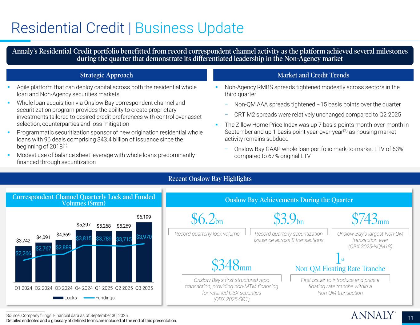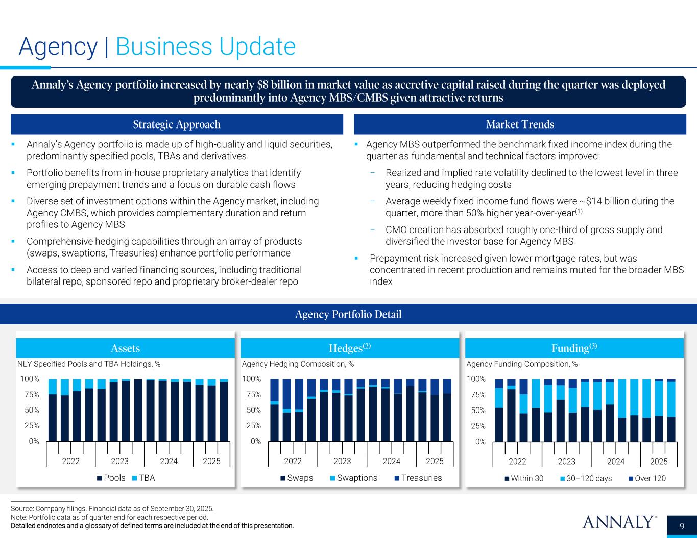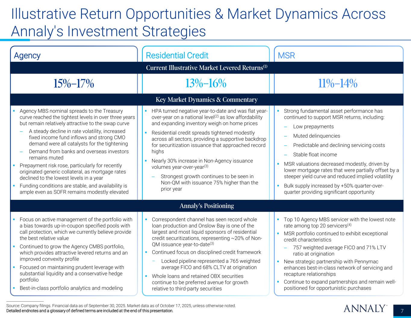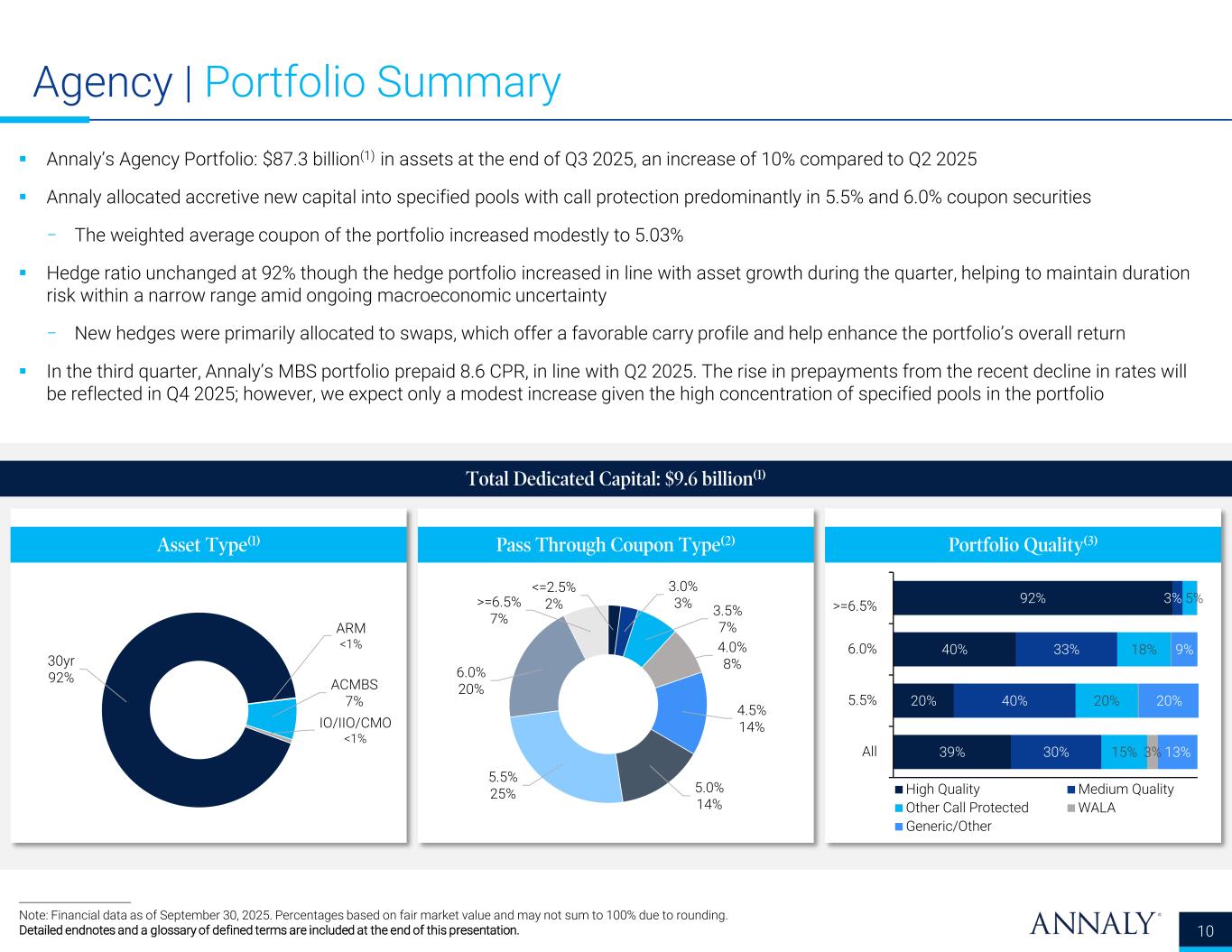 Recent Achievements and Performance Highlights Source: Company filings. Financial data as of September 30, 2025, unless otherwise noted. * Represents a non-GAAP financial measure; see Appendix. Detailed endnotes and a glossary of defined terms are included at the end of this presentation. Financial Performance Annaly delivered a strong economic return and earnings continued to exceed the dividend as the operating environment improved Earnings available for distribution* of $0.73 per average common share for the quarter Book value per common share of $19.25 Declared quarterly common stock cash dividend of $0.70 per share Economic return of 8.1% for the quarter and 11.5% year-to-date through the third quarter Financing, Capital & Liquidity Enhanced liquidity and maintained prudent leverage during the quarter while opportunistically accessing the capital markets Economic leverage* of 5.7x, down from 5.8x in the second quarter $8.8 billion of total assets available for financing(1), including cash and unencumbered Agency MBS of $5.9 billion Annaly Residential Credit Group remains the largest non-bank issuer and the second largest issuer overall of Prime Jumbo and Expanded Credit MBS, pricing 24 residential whole loan securitizations totaling $12.4 billion in proceeds in 2025 year-to-date(2) Average GAAP cost of interest-bearing liabilities of 4.73%, down 3 basis points quarter-over-quarter, and average economic cost of interest-bearing liabilities* of 3.96%, up 2 basis points quarter-over-quarter Raised $1.1 billion of accretive capital during the quarter, including $823 million(3) of common equity through the Company’s at-the-market sales program and $275 million(4) through the issuance of 8.875% Series J fixed-rate cumulative redeemable preferred stock Portfolio Performance Overweight Agency MBS given attractive relative returns while continuing to achieve milestones across Residential Credit and MSR Total portfolio of $97.8 billion(5), including $87.3 billion in highly liquid Agency MBS strategy, which represents 89% of total assets and 64% of dedicated capital Majority of the capital raised during the quarter was allocated to Annaly’s Agency portfolio, which grew by 10%. New purchases were predominantly in specified pools with call protection across 5.5% and 6.0% coupons Annaly’s Residential Credit portfolio increased 4% to $6.9 billion(5), representing 17% of dedicated capital, driven by record correspondent channel activity – Onslow Bay had several notable achievements during the quarter, including lock volume surpassing $6 billion, record quarterly securitization issuance of nearly $4 billion and the introduction of innovative deal structures that differentiate the platform Annaly’s MSR portfolio increased 6% to $3.5 billion(5) in market value, representing 19% of dedicated capital at the end of the quarter – Entered into strategic subservicing relationship with and agreement to purchase MSR from PennyMac Financial Services, Inc. (“Pennymac”) whereby Pennymac will handle all servicing and recapture activities for the initial $12 billion in UPB of MSR sold to Annaly 3