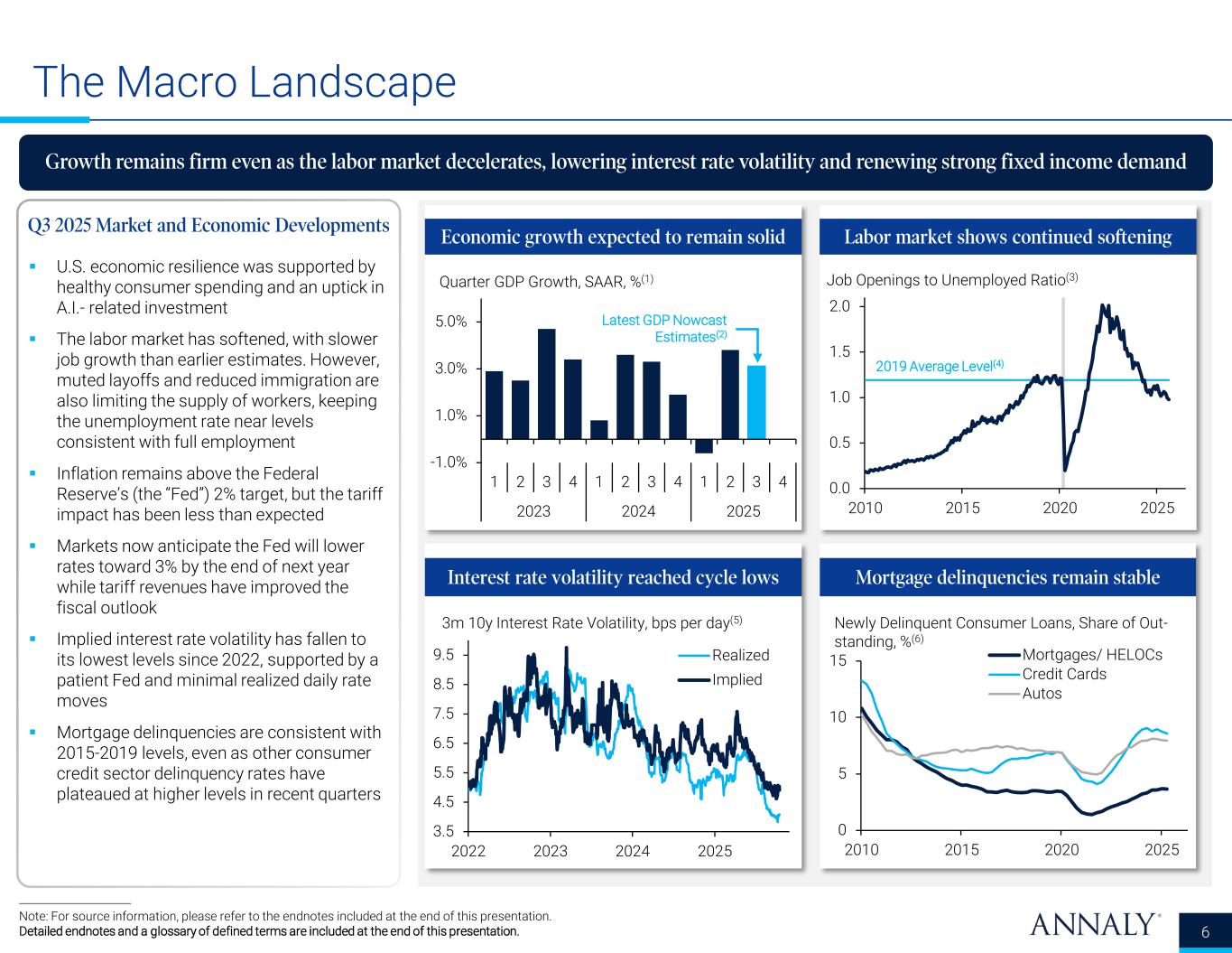 Important Notices 2 This presentation is issued by Annaly Capital Management, Inc. ("Annaly"), an internally-managed, publicly traded company that has elected to be taxed as a real estate investment trust for federal income tax purposes, and is being furnished in connection with Annaly’s Third Quarter 2025 earnings release. This presentation is provided for investors in Annaly for informational purposes only and is not an offer to sell, or a solicitation of an offer to buy, any security or instrument. Forward-Looking Statements This presentation, other written or oral communications, and our public documents to which we refer contain or incorporate by reference certain forward-looking statements which are based on various assumptions (some of which are beyond our control) and may be identified by reference to a future period or periods or by the use of forward-looking terminology, such as “may,” “will,” “believe,” “expect,” “anticipate,” “continue,” “illustrative” or similar terms or variations on those terms or the negative of those terms. Such statements include those relating to the Company’s future performance, macro outlook, the interest rate and credit environments, tax reform and future opportunities. Actual results could differ materially from those set forth in forward-looking statements due to a variety of factors, including, but not limited to, changes in interest rates; changes in the yield curve; changes in prepayment rates; the availability of mortgage-backed securities (“MBS”) and other securities for purchase; the availability of financing and, if available, the terms of any financing; changes in the market value of the Company’s assets; changes in business conditions and the general economy; the Company’s ability to grow its residential credit business; the Company's ability to grow its mortgage servicing rights business; credit risks related to the Company’s investments in credit risk transfer securities and residential mortgage-backed securities and related residential mortgage credit assets; risks related to investments in mortgage servicing rights; the Company’s ability to consummate any contemplated investment opportunities; changes in government regulations or policy affecting the Company’s business; the Company’s ability to maintain its qualification as a REIT for U.S. federal income tax purposes; the Company’s ability to maintain its exemption from registration under the Investment Company Act of 1940; and operational risks or risk management failures by us or critical third parties, including cybersecurity incidents. For a discussion of the risks and uncertainties which could cause actual results to differ from those contained in the forward-looking statements, see “Risk Factors” in our most recent Annual Report on Form 10-K and any subsequent Quarterly Reports on Form 10-Q. The Company does not undertake, and specifically disclaims any obligation, to publicly release the result of any revisions which may be made to any forward-looking statements to reflect the occurrence of anticipated or unanticipated events or circumstances after the date of such statements, except as required by law. We use our website (www.annaly.com) and LinkedIn account (www.linkedin.com/company/annaly-capital-management) as channels of distribution of company information. The information we post through these channels may be deemed material. Accordingly, investors should monitor these channels, in addition to following our press releases, SEC filings and public conference calls and webcasts. In addition, you may automatically receive email alerts and other information about Annaly when you enroll your email address by visiting the "News & Insights" section of our website, then clicking on "Subscribe" and completing the email notification form. Our website, any alerts and social media channels are not incorporated into this document. Past performance is no guarantee of future results. There is no guarantee that any investment strategy referenced herein will work under all market conditions. There is no guarantee that illustrative returns will occur. Prior to making any investment decision, you should evaluate your ability to invest for the long-term, especially during periods of downturns in the market. You alone assume the responsibility of evaluating the merits and risks associated with any potential investment or investment strategy referenced herein. To the extent that this material contains reference to any past specific investment recommendations or strategies which were or would have been profitable to any person, it should not be assumed that recommendations made in the future will be profitable or will equal the performance of such past investment recommendations or strategies. The information contained herein is not intended to provide, and should not be relied upon for accounting, legal or tax advice or investment recommendations for Annaly or any of its affiliates. Regardless of source, information is believed to be reliable for purposes used herein, but Annaly makes no representation or warranty as to the accuracy or completeness thereof and does not take any responsibility for information obtained from sources outside of Annaly. Certain information contained in the presentation discusses general market activity, industry or sector trends, or other broad-based economic, market or political conditions and should not be construed as research or investment advice. Non-GAAP Financial Measures This presentation includes certain non-GAAP financial measures, including earnings available for distribution. We believe the non-GAAP financial measures are useful for management, investors, analysts, and other interested parties in evaluating our performance but should not be viewed in isolation and are not a substitute for financial measures computed in accordance with U.S. generally accepted accounting principles (“GAAP”). In addi