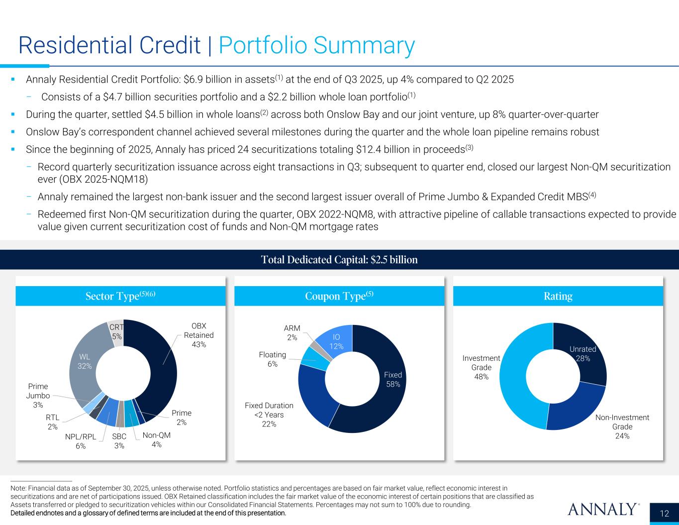 Residential Credit | Business Update Annaly’s Residential Credit portfolio benefitted from record correspondent channel activity as the platform achieved several milestones during the quarter that demonstrate its differentiated leadership in the Non-Agency market 11Source: Company filings. Financial data as of September 30, 2025. Detailed endnotes and a glossary of defined terms are included at the end of this presentation. Agile platform that can deploy capital across both the residential whole loan and Non-Agency securities markets Whole loan acquisition via Onslow Bay correspondent channel and securitization program provides the ability to create proprietary investments tailored to desired credit preferences with control over asset selection, counterparties and loss mitigation Programmatic securitization sponsor of new origination residential whole loans with 96 deals comprising $43.4 billion of issuance since the beginning of 2018(1) Modest use of balance sheet leverage with whole loans predominantly financed through securitization Strategic Approach Non-Agency RMBS spreads tightened modestly across sectors in the third quarter − Non-QM AAA spreads tightened ~15 basis points over the quarter − CRT M2 spreads were relatively unchanged compared to Q2 2025 The Zillow Home Price Index was up 7 basis points month-over-month in September and up 1 basis point year-over-year(2) as housing market activity remains subdued − Onslow Bay GAAP whole loan portfolio mark-to-market LTV of 63% compared to 67% original LTV Market and Credit Trends Recent Onslow Bay Highlights Correspondent Channel Quarterly Lock and Funded Volumes ($mm) Onslow Bay Achievements During the Quarter $348mm Onslow Bay’s first structured repo transaction, providing non-MTM financing for retained OBX securities (OBX 2025-SR1) 1st Non-QM Floating Rate Tranche First issuer to introduce and price a floating rate tranche within a Non-QM transaction $3,742 $4,091 $4,369 $5,397 $5,268 $5,269 $6,199 $2,266 $2,767 $2,889 $3,815 $3,789 $3,715 $3,970 Q1 2024 Q2 2024 Q3 2024 Q4 2024 Q1 2025 Q2 2025 Q3 2025 Locks Fundings $6.2bn Record quarterly lock volume $3.9bn Record quarterly securitization issuance across 8 transactions $743mm Onslow Bay’s largest Non-QM transaction ever (OBX 2025-NQM18)
