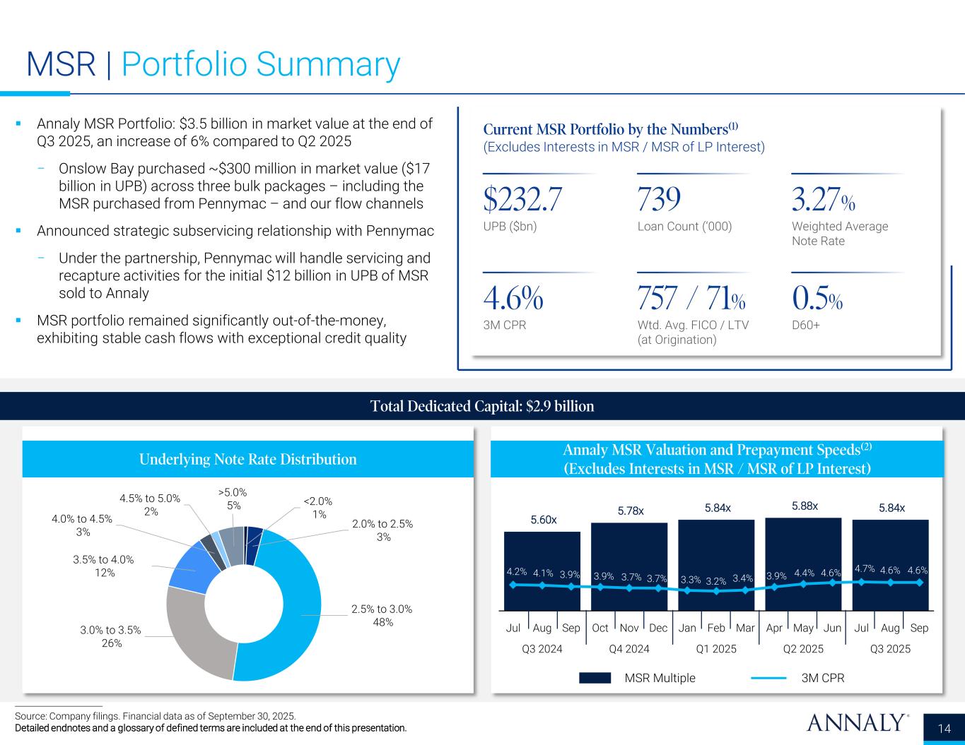 MSR | Business Update 13 Source: Company filings. Financial data as of September 30, 2025. Detailed endnotes and a glossary of defined terms are included at the end of this presentation. Annaly’s MSR portfolio grew by ~$215 million in the third quarter through opportunistic purchases and a new strategic partnership that enhances its best-in-class network of servicing and recapture relationships MSR portfolio complements Annaly’s Agency MBS strategy by offering an attractive yield while providing a hedge to mortgage basis volatility and slower prepayment speeds on discount dollar-priced MBS As an established and scaled master servicer, Annaly is well-positioned for opportunistic growth in both the bulk and flow MSR markets Annaly serves as a strategic partner to originators given certainty of capital and complementary business strategy Dynamic recapture and servicing capabilities through the ability to allocate across several industry-leading recapture partners Portfolio predominantly consists of low coupon, high-quality conventional MSR(1) Strategic Approach Bulk MSR supply was healthy in the third quarter as anticipated − Activity was up +50% quarter-over-quarter given low origination margins and continued non-bank activity Pricing has remained firm across both bulk and flow channels Annaly’s MSR valuations decreased slightly, driven by lower mortgage rates, though partially offset by a steeper yield curve and reduced volatility Prepayment speeds were essentially flat quarter-over-quarter while delinquencies remained stable Market Trends Annaly MSR Holdings (Market Value, $mm)Strategic Subservicing Relationship Entered subservicing agreement and master purchase agreement whereby Pennymac will handle servicing and recapture activities for MSR sold to Annaly Announced October 1, 2025 $1,748 $2,122 $2,909 $3,273 $3,281 $3,476 $518 $385 $34 $21 $7 $39 $35 $32 $31 $31 $65 $1,787 $2,675 $3,326 $3,338 $3,333 $3,548 Q4 2022 Q4 2023 Q4 2024 Q1 2025 Q2 2025 Q3 2025 MSR Unsettled MSR Commitments Interests in MSR / MSR of LP Interest