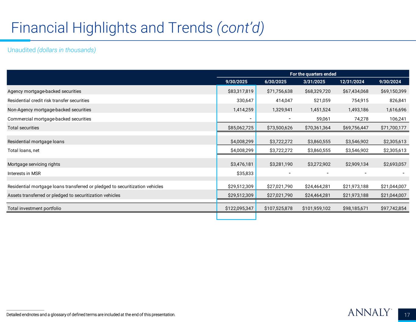 Financial Highlights and Trends 16 * Represents a non-GAAP financial measure; see Appendix. Detailed endnotes and a glossary of defined terms are included at the end of this presentation. Unaudited For the quarters ended 9/30/2025 6/30/2025 3/31/2025 12/31/2024 9/30/2024 GAAP net income (loss) per average common share(1) $1.21 $0.03 $0.15 $0.78 $0.05 Earnings available for distribution per average common share*(1) $0.73 $0.73 $0.72 $0.72 $0.66 Dividends declared per common share $0.70 $0.70 $0.70 $0.65 $0.65 Book value per common share $19.25 $18.45 $19.02 $19.15 $19.54 Annualized GAAP return (loss) on average equity(2) 23.69% 1.82% 4.04% 15.00% 2.77% Annualized EAD return on average equity* 14.70% 14.86% 14.43% 14.27% 12.95% Net interest margin(3) 0.97% 1.04% 0.87% 0.75% 0.06% Average yield on interest earning assets(4) 5.40% 5.42% 5.18% 5.36% 5.16% Average GAAP cost of interest bearing liabilities(5) 4.73% 4.76% 4.77% 4.96% 5.42% Net interest margin (excluding PAA)(3)* 1.70% 1.71% 1.69% 1.71% 1.52% Average yield on interest earning assets (excluding PAA)(4)* 5.46% 5.41% 5.23% 5.26% 5.25% Average economic cost of interest bearing liabilities(5)* 3.96% 3.94% 3.88% 3.79% 3.93% GAAP leverage, at period-end(6) 7.1x 7.1x 6.8x 7.1x 6.9x Economic leverage, at period-end(6)* 5.7x 5.8x 5.7x 5.5x 5.7x