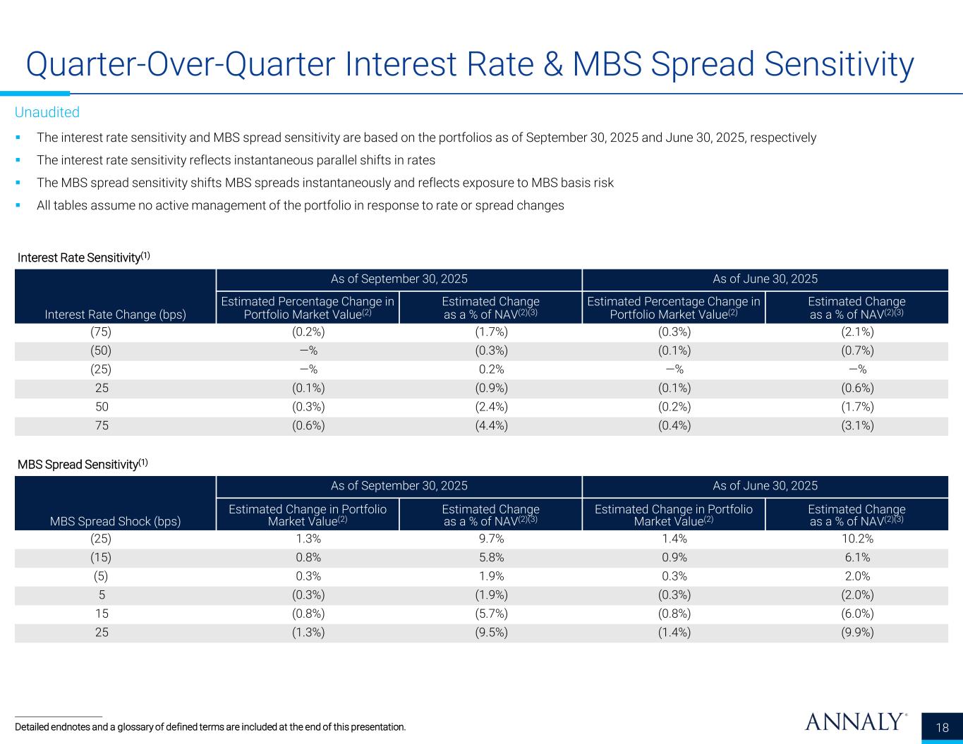 Quarter-Over-Quarter Interest Rate & MBS Spread Sensitivity The interest rate sensitivity and MBS spread sensitivity are based on the portfolios as of September 30, 2025 and June 30, 2025, respectively The interest rate sensitivity reflects instantaneous parallel shifts in rates The MBS spread sensitivity shifts MBS spreads instantaneously and reflects exposure to MBS basis risk All tables assume no active management of the portfolio in response to rate or spread changes 18 Unaudited Interest Rate Sensitivity(1) Interest Rate Change (bps) As of September 30, 2025 As of June 30, 2025 Estimated Percentage Change in Portfolio Market Value(2) Estimated Change as a % of NAV(2)(3) Estimated Percentage Change in Portfolio Market Value(2) Estimated Change as a % of NAV(2)(3) (75) (0.2%) (1.7%) (0.3%) (2.1%) (50) —% (0.3%) (0.1%) (0.7%) (25) —% 0.2% —% —% 25 (0.1%) (0.9%) (0.1%) (0.6%) 50 (0.3%) (2.4%) (0.2%) (1.7%) 75 (0.6%) (4.4%) (0.4%) (3.1%) MBS Spread Sensitivity(1) MBS Spread Shock (bps) As of September 30, 2025 As of June 30, 2025 Estimated Change in Portfolio Market Value(2) Estimated Change as a % of NAV(2)(3) Estimated Change in Portfolio Market Value(2) Estimated Change as a % of NAV(2)(3) (25) 1.3% 9.7% 1.4% 10.2% (15) 0.8% 5.8% 0.9% 6.1% (5) 0.3% 1.9% 0.3% 2.0% 5 (0.3%) (1.9%) (0.3%) (2.0%) 15 (0.8%) (5.7%) (0.8%) (6.0%) 25 (1.3%) (9.5%) (1.4%) (9.9%) Detailed endnotes and a glossary of defined terms are included at the end of this presentation.
