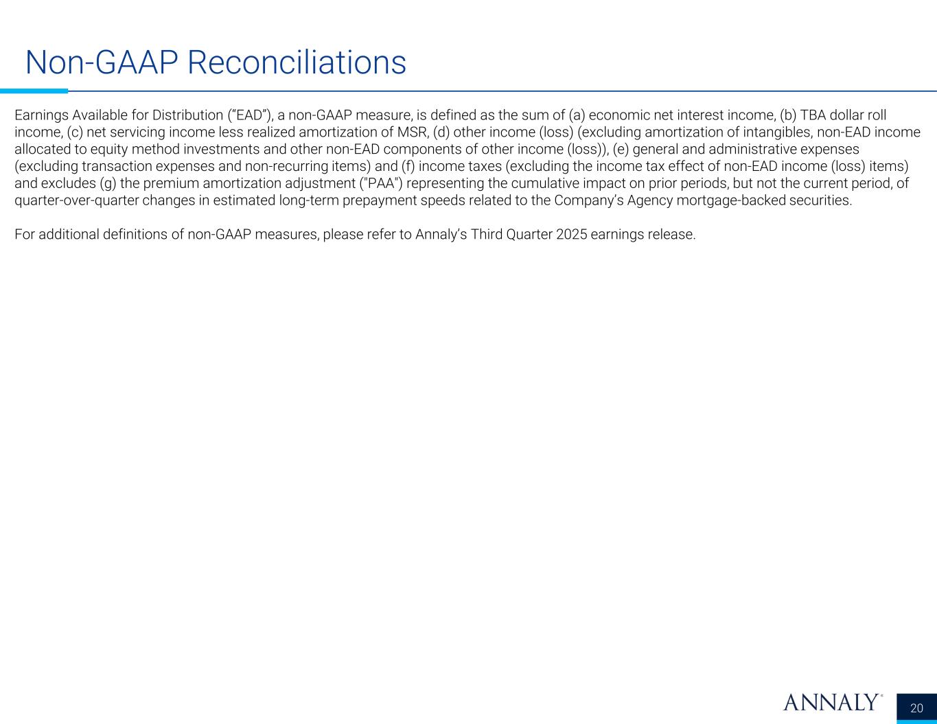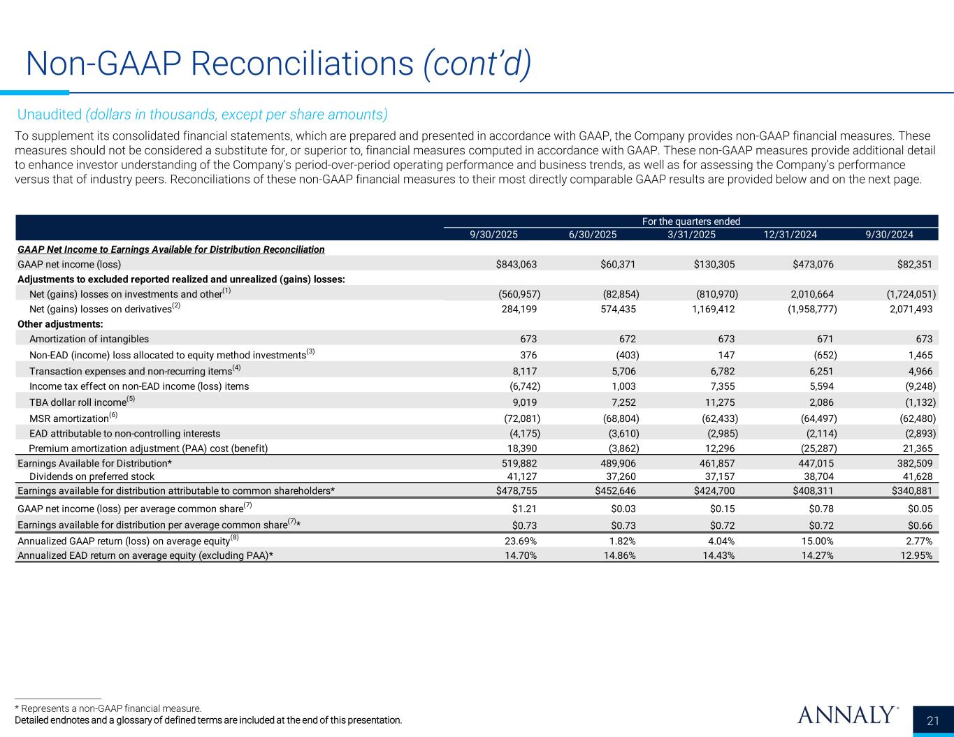 Non-GAAP Reconciliations 20 Earnings Available for Distribution (“EAD”), a non-GAAP measure, is defined as the sum of (a) economic net interest income, (b) TBA dollar roll income, (c) net servicing income less realized amortization of MSR, (d) other income (loss) (excluding amortization of intangibles, non-EAD income allocated to equity method investments and other non-EAD components of other income (loss)), (e) general and administrative expenses (excluding transaction expenses and non-recurring items) and (f) income taxes (excluding the income tax effect of non-EAD income (loss) items) and excludes (g) the premium amortization adjustment ("PAA") representing the cumulative impact on prior periods, but not the current period, of quarter-over-quarter changes in estimated long-term prepayment speeds related to the Company’s Agency mortgage-backed securities. For additional definitions of non-GAAP measures, please refer to Annaly’s Third Quarter 2025 earnings release.