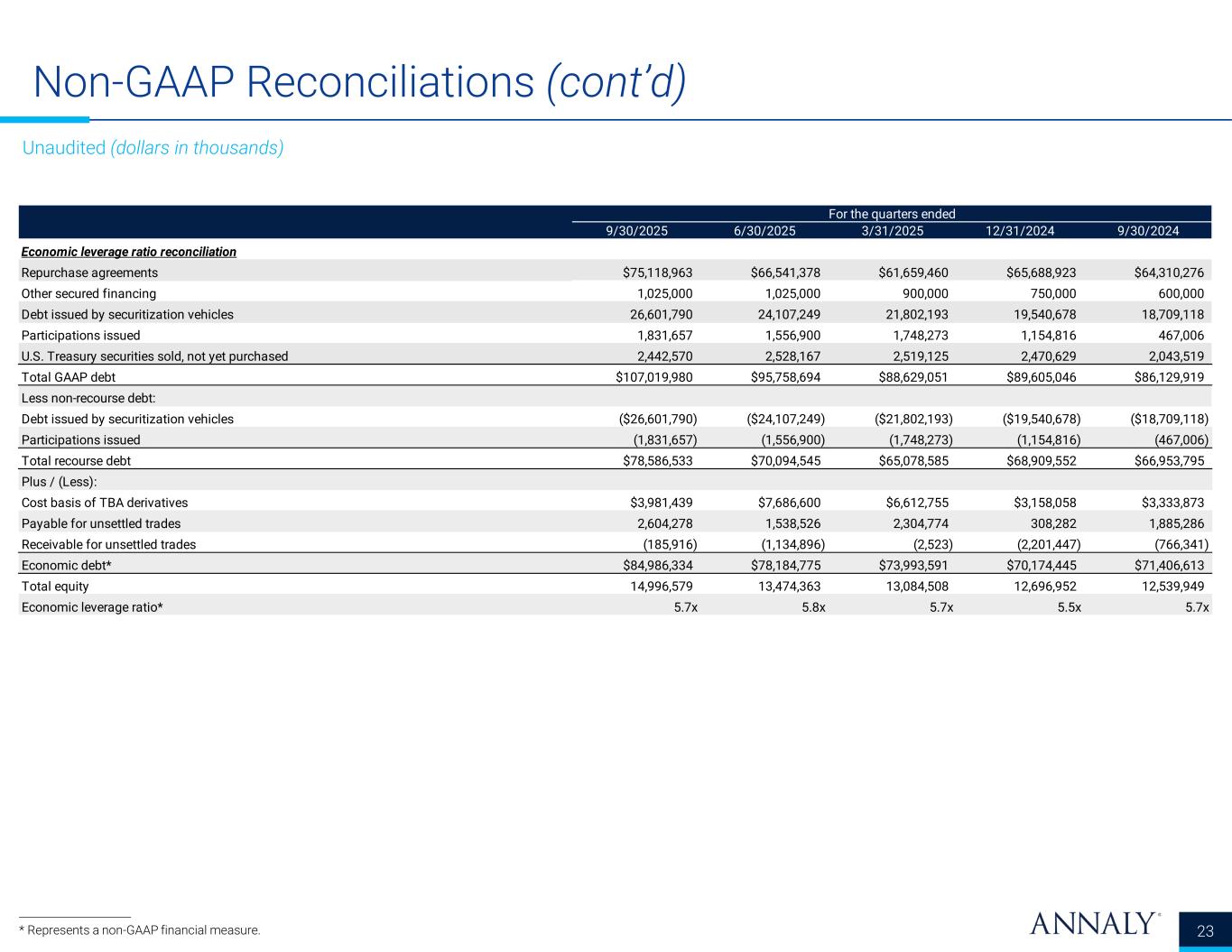 Non-GAAP Reconciliations (cont’d) 23 Unaudited (dollars in thousands) * Represents a non-GAAP financial measure. For the quarters ended 9/30/2025 6/30/2025 3/31/2025 12/31/2024 9/30/2024 Economic leverage ratio reconciliation Repurchase agreements $75,118,963 $66,541,378 $61,659,460 $65,688,923 $64,310,276 Other secured financing 1,025,000 1,025,000 900,000 750,000 600,000 Debt issued by securitization vehicles 26,601,790 24,107,249 21,802,193 19,540,678 18,709,118 Participations issued 1,831,657 1,556,900 1,748,273 1,154,816 467,006 U.S. Treasury securities sold, not yet purchased 2,442,570 2,528,167 2,519,125 2,470,629 2,043,519 Total GAAP debt $107,019,980 $95,758,694 $88,629,051 $89,605,046 $86,129,919 Less non-recourse debt: Debt issued by securitization vehicles ($26,601,790) ($24,107,249) ($21,802,193) ($19,540,678) ($18,709,118) Participations issued (1,831,657) (1,556,900) (1,748,273) (1,154,816) (467,006) Total recourse debt $78,586,533 $70,094,545 $65,078,585 $68,909,552 $66,953,795 Plus / (Less): Cost basis of TBA derivatives $3,981,439 $7,686,600 $6,612,755 $3,158,058 $3,333,873 Payable for unsettled trades 2,604,278 1,538,526 2,304,774 308,282 1,885,286 Receivable for unsettled trades (185,916) (1,134,896) (2,523) (2,201,447) (766,341) Economic debt* $84,986,334 $78,184,775 $73,993,591 $70,174,445 $71,406,613 Total equity 14,996,579 13,474,363 13,084,508 12,696,952 12,539,949 Economic leverage ratio* 5.7x 5.8x 5.7x 5.5x 5.7x