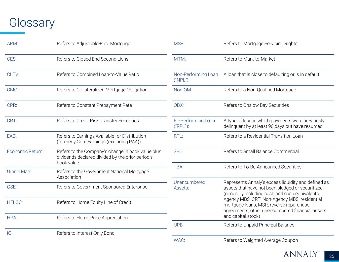 Glossary 25 ARM: Refers to Adjustable-Rate Mortgage CES: Refers to Closed End Second Liens CLTV: Refers to Combined Loan-to-Value Ratio CMO: Refers to Collateralized Mortgage Obligation CPR: Refers to Constant Prepayment Rate CRT: Refers to Credit Risk Transfer Securities EAD: Refers to Earnings Available for Distribution (formerly Core Earnings (excluding PAA)) Economic Return: Refers to the Company’s change in book value plus dividends declared divided by the prior period’s book value Ginnie Mae: Refers to the Government National Mortgage Association GSE: Refers to Government Sponsored Enterprise HELOC: Refers to Home Equity Line of Credit HPA: Refers to Home Price Appreciation IO: Refers to Interest-Only Bond MSR: Refers to Mortgage Servicing Rights MTM: Refers to Mark-to-Market Non-Performing Loan (“NPL”): A loan that is close to defaulting or is in default Non-QM: Refers to a Non-Qualified Mortgage OBX: Refers to Onslow Bay Securities Re-Performing Loan (“RPL”): A type of loan in which payments were previously delinquent by at least 90 days but have resumed RTL: Refers to a Residential Transition Loan SBC: Refers to Small Balance Commercial TBA: Refers to To-Be-Announced Securities Unencumbered Assets: Represents Annaly’s excess liquidity and defined as assets that have not been pledged or securitized (generally including cash and cash equivalents, Agency MBS, CRT, Non-Agency MBS, residential mortgage loans, MSR, reverse repurchase agreements, other unencumbered financial assets and capital stock) UPB: Refers to Unpaid Principal Balance WAC: Refers to Weighted Average Coupon
