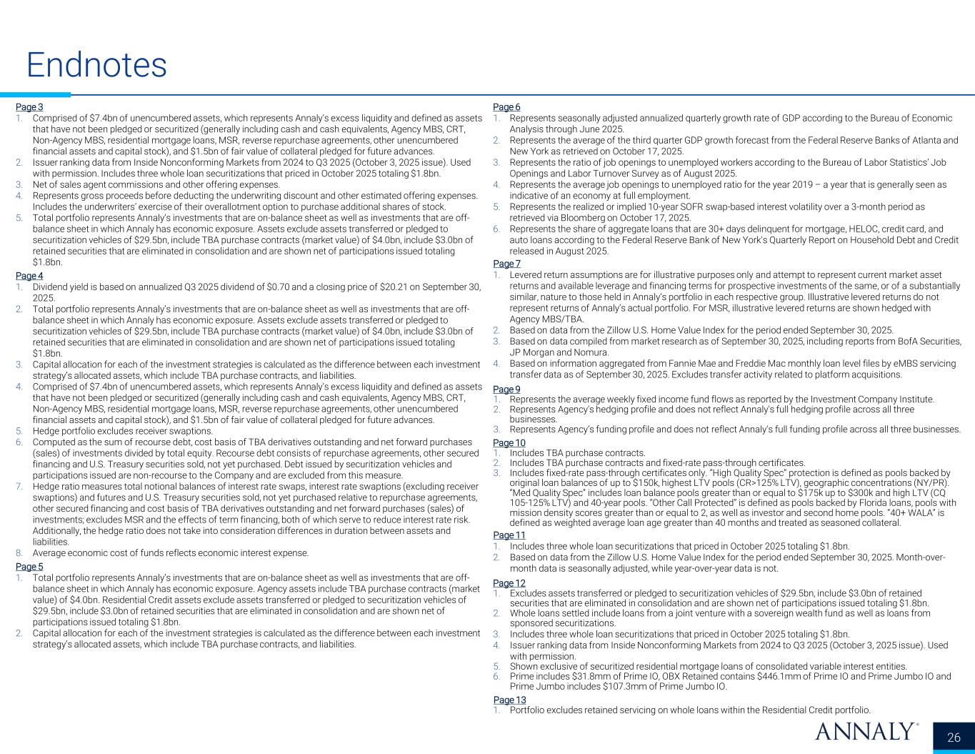 Endnotes 26 Page 3 1. Comprised of $7.4bn of unencumbered assets, which represents Annaly’s excess liquidity and defined as assets that have not been pledged or securitized (generally including cash and cash equivalents, Agency MBS, CRT, Non-Agency MBS, residential mortgage loans, MSR, reverse repurchase agreements, other unencumbered financial assets and capital stock), and $1.5bn of fair value of collateral pledged for future advances. 2. Issuer ranking data from Inside Nonconforming Markets from 2024 to Q3 2025 (October 3, 2025 issue). Used with permission. Includes three whole loan securitizations that priced in October 2025 totaling $1.8bn. 3. Net of sales agent commissions and other offering expenses. 4. Represents gross proceeds before deducting the underwriting discount and other estimated offering expenses. Includes the underwriters’ exercise of their overallotment option to purchase additional shares of stock. 5. Total portfolio represents Annaly’s investments that are on-balance sheet as well as investments that are off- balance sheet in which Annaly has economic exposure. Assets exclude assets transferred or pledged to securitization vehicles of $29.5bn, include TBA purchase contracts (market value) of $4.0bn, include $3.0bn of retained securities that are eliminated in consolidation and are shown net of participations issued totaling $1.8bn. Page 4 1. Dividend yield is based on annualized Q3 2025 dividend of $0.70 and a closing price of $20.21 on September 30, 2025. 2. Total portfolio represents Annaly’s investments that are on-balance sheet as well as investments that are off- balance sheet in which Annaly has economic exposure. Assets exclude assets transferred or pledged to securitization vehicles of $29.5bn, include TBA purchase contracts (market value) of $4.0bn, include $3.0bn of retained securities that are eliminated in consolidation and are shown net of participations issued totaling $1.8bn. 3. Capital allocation for each of the investment strategies is calculated as the difference between each investment strategy’s allocated assets, which include TBA purchase contracts, and liabilities. 4. Comprised of $7.4bn of unencumbered assets, which represents Annaly’s excess liquidity and defined as assets that have not been pledged or securitized (generally including cash and cash equivalents, Agency MBS, CRT, Non-Agency MBS, residential mortgage loans, MSR, reverse repurchase agreements, other unencumbered financial assets and capital stock), and $1.5bn of fair value of collateral pledged for future advances. 5. Hedge portfolio excludes receiver swaptions. 6. Computed as the sum of recourse debt, cost basis of TBA derivatives outstanding and net forward purchases (sales) of investments divided by total equity. Recourse debt consists of repurchase agreements, other secured financing and U.S. Treasury securities sold, not yet purchased. Debt issued by securitization vehicles and participations issued are non-recourse to the Company and are excluded from this measure. 7. Hedge ratio measures total notional balances of interest rate swaps, interest rate swaptions (excluding receiver swaptions) and futures and U.S. Treasury securities sold, not yet purchased relative to repurchase agreements, other secured financing and cost basis of TBA derivatives outstanding and net forward purchases (sales) of investments; excludes MSR and the effects of term financing, both of which serve to reduce interest rate risk. Additionally, the hedge ratio does not take into consideration differences in duration between assets and liabilities. 8. Average economic cost of funds reflects economic interest expense. Page 5 1. Total portfolio represents Annaly’s investments that are on-balance sheet as well as investments that are off- balance sheet in which Annaly has economic exposure. Agency assets include TBA purchase contracts (market value) of $4.0bn. Residential Credit assets exclude assets transferred or pledged to securitization vehicles of $29.5bn, include $3.0bn of retained securities that are eliminated in consolidation and are shown net of participations issued totaling $1.8bn. 2. Capital allocation for each of the investment strategies is calculated as the difference between each investment strategy’s allocated assets, which include TBA purchase contracts, and liabilities. Page 6 1. Represents seasonally adjusted annualized quarterly growth rate of GDP according to the Bureau of Economic Analysis through June 2025. 2. Represents the average of the third quarter GDP growth forecast from the Federal Reserve Banks of Atlanta and New York as retrieved on October 17, 2025. 3. Represents the ratio of job openings to unemployed workers according to the Bureau of Labor Statistics’ Job Openings and Labor Turnover Survey as of August 2025. 4. Represents the average job openings to unemployed ratio for the year 2019 – a year that is generally seen as indicative of an economy at full employment. 5. Represents the realized or implied 10-year SOFR swap-based interest volatility over a 3-month period as retrieved via Bloomberg on October 17, 2025. 6. Represents the share of aggregate loans that are 30+ days delinquent for mortgage, HELOC, credit card, and auto loans according to the Federal Reserve Bank of New York's Quarterly Report on Household Debt and Credit released in August 2025. Page 7 1. Levered return assumptions are for illustrative purposes only and attempt to represent current market asset returns and available leverage and financing terms for prospective investments of the same, or of a substantially similar, nature to those held in Annaly’s portfolio in each respective group. Illustrative levered returns do not represent returns of Annaly’s actual portfolio. For MSR, illustrative levered returns are shown hedged with Agency MBS/TBA. 2. Based on data from the Zillow U.S. Home Value Index for the period ended September 30, 2025. 3. Based on data compiled from market r