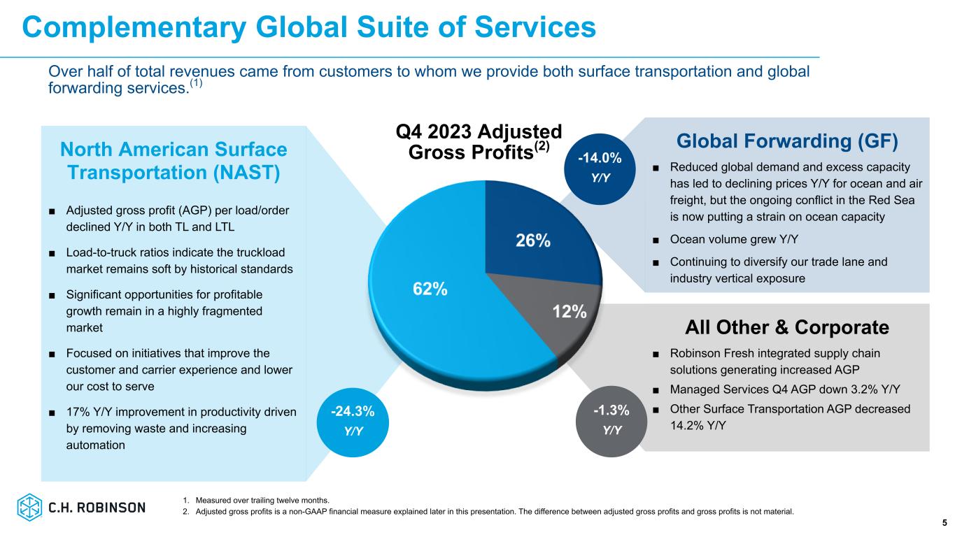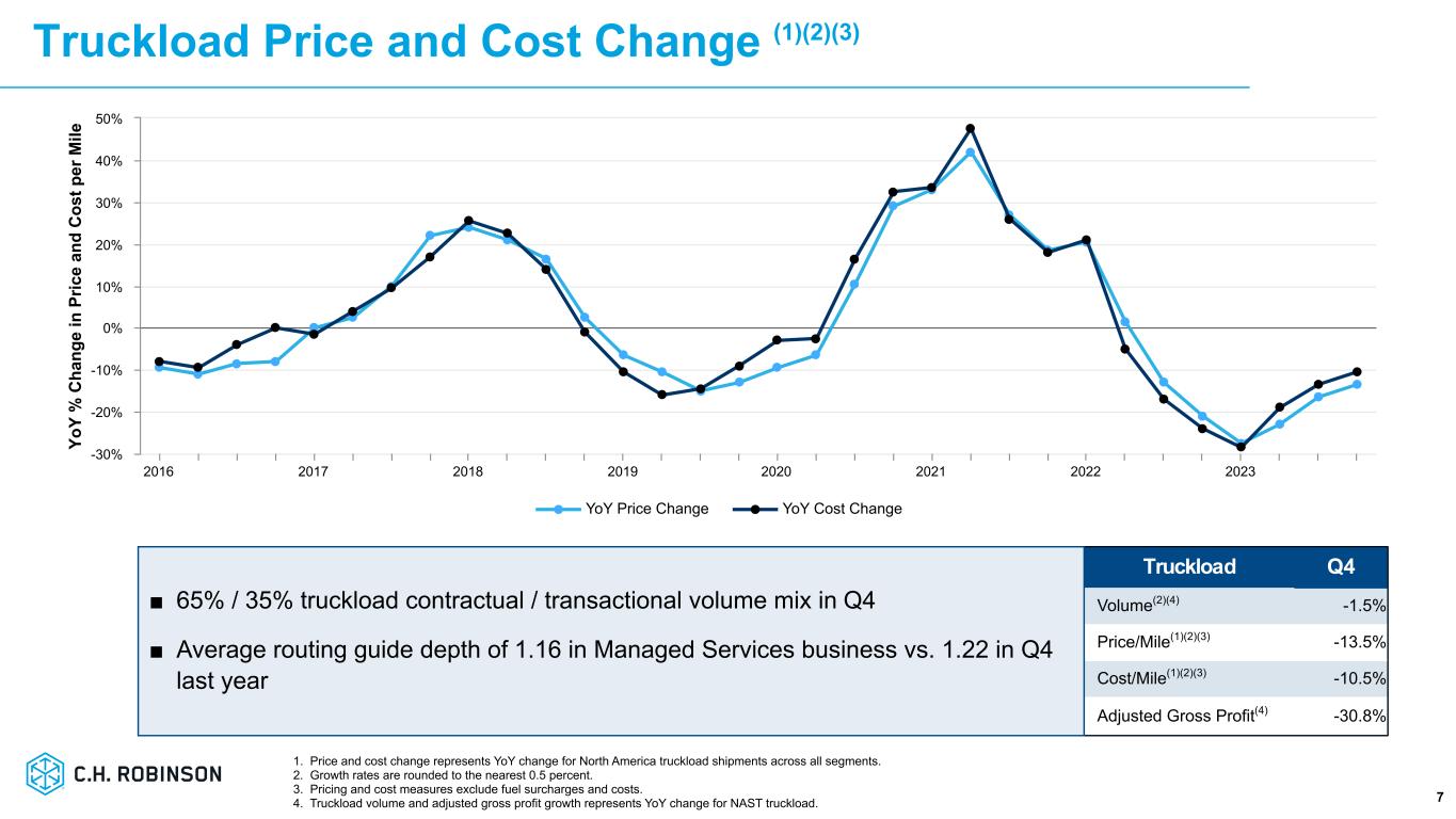 「第4四半期の業績は、需要および価格環境の低迷が続く中、当社の期待に応えるものではありませんでした。C.H.ロビンソンの社長兼最高経営責任者(CEO)であるデーブ・ボーズマンは、次のように述べた。「市場の谷が長く続くなか、貨物需要が低迷し、輸送会社のキャパシティが過剰となった結果、非常に競争の激しい市場が続きました。「このような環境下、私たちは、季節的な市場の緊張により、より多くの利益を獲得できるスポット市場でのトラック積載量を増やしました。その結果、10 月と 11 月にはトラック積載量全体の荷当たり利益が順次改善しました。しかし、12 月は季節的に購入輸送コストが上昇したため、一荷あたり利益が減少しました。グローバル・フォワーディング事業では、海上貨物は前年同期比で増加しましたが、第4四半期は通常そうであるように、前四半期比で減少しました。