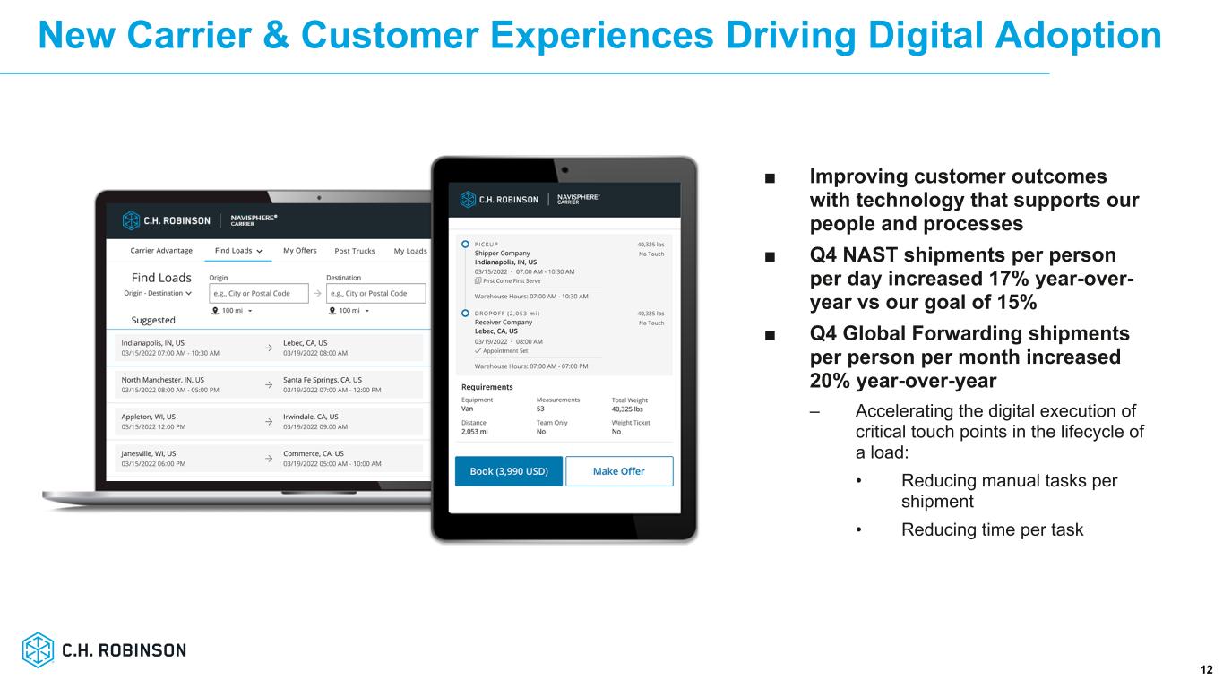 「世界の貨物市場が季節的、循環的、地政学的要因によって変動する中、当社は顧客と輸送会社に優れたサービスを提供し、無駄と手作業を排除してプロセスを合理化し、顧客と輸送会社の担当社員が関係構築、付加価値のあるソリューション提供、例外管理に時間を割けるようなツールを提供することで、コントロールできることに引き続き注力しています。第4四半期の1人1日あたりのNAST出荷件数は17%改善し、目標としていた15%を上回りました。これは、無駄や手作業をなくすことで前進したことを示すものです。このような努力は事業の他の主要分野でも実を結んでおり、グローバル・フォワーディングは第 4 四半期に 1 人当たり月間出荷量で前年同期比 20%の改善を達成しました。生産性向上に引き続き注力することは、全社的な構造コストに対処し最適化する計画の一環です」とボーズマンは付け加えた。「カスタマー・エクスペリエンスとサービス提供コストの改善を続けながら、最終的な運賃市況の回復に備え、台数の伸びと人員の伸びを切り離し、営業レバレッジを高める持続可能なコスト構造を確保することに注力しています。