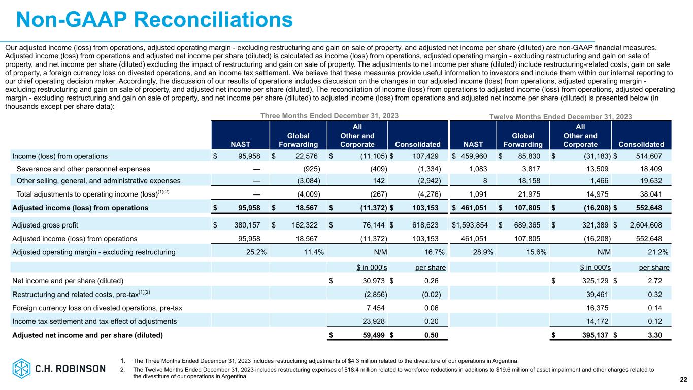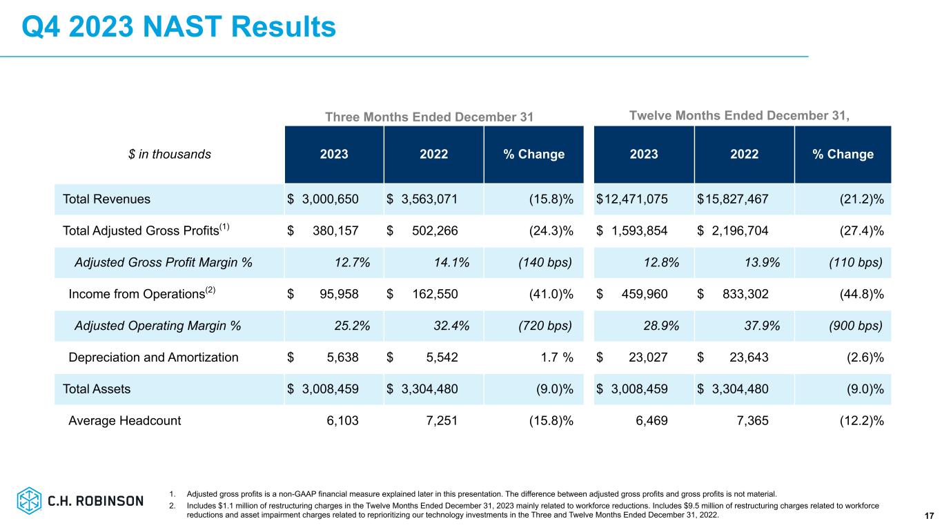 NAST 事業の第 4 四半期の総収益は 30 億ドルで、前年同期から 15.8%減少しました。これは主に、軟調 な貨物需要に比べ、トラック積載量の供給過剰を反映したトラック積載量の価格下落によるものです。NAST の調整後売上総利益は、前年同期比 24.3%減の 3 億 8,020 万ドルとなりました。トラック貨物の調整後売上総利益は、出荷あたりの調整後売上総利益が 29.5%減少し、トラック貨物の出荷が 1.5%減少したため、30.8%減少しました。燃料サーチャージを除いた、お客様に請求したトラック貨物のマイルあたりの平均運賃は前年同期比で約 13.5%減少し、燃料サーチャージを除いたトラック貨物のマイルあたりの運賃は約 10.5%減少したため、トラック貨物のマイルあたりの調整後売上総利益は 28.0%減少しました。LTL の調整後売上総利益は前年同期比で 9.0%減少しましたが、これは受注 1 件当たりの調整後売上総利益が 8.5%減少し、LTL の出荷が 0.5%減少したためです。NAST 全体の取扱量は 1.0%減少しました。営業費用は 16.3%減少しました。これは主に、平均従業員数の減少、変動報酬の減少、技術費の減少など、コ ストの最適化努力によるものです。NAST の平均従業員数は 15.8%減少しました。営業利益は前年同期比41.0%減の9,600万ドル、調整後営業利益率は前年同期比720ベーシス・ポイント減の25.2%となった。