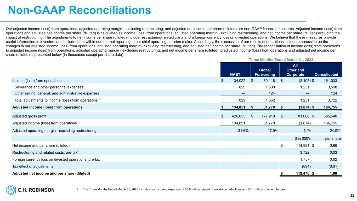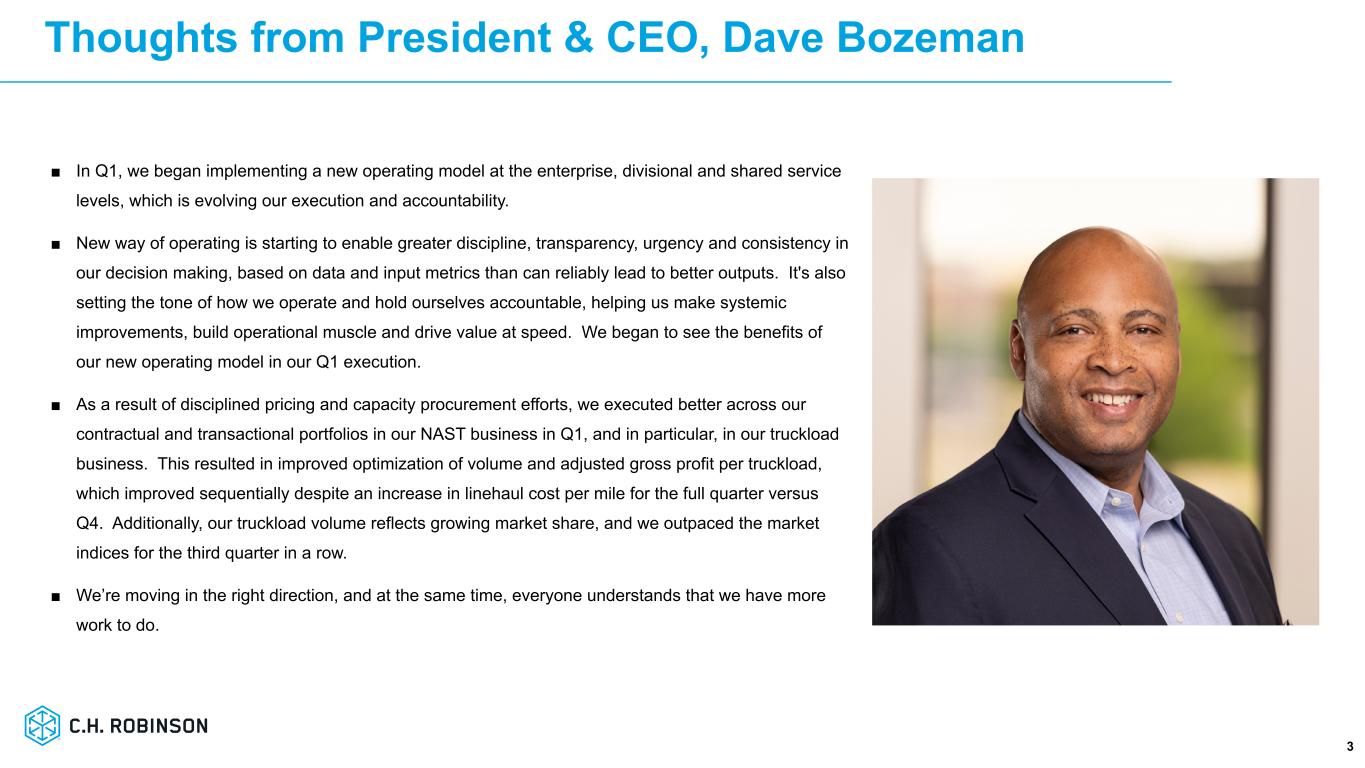 "Our first quarter results and adjusted earnings per share of $0.86 reflects a change in our execution and discipline, as we began implementing a new Lean-based operating model. And although we continue to battle through an elongated freight recession with an oversupply of capacity, I’m optimistic about our ability to continue improving our execution regardless of the market environment," said C.H. Robinson's President and Chief Executive Officer, Dave Bozeman. "Our new operating model is being deployed at the enterprise, divisional and shared service levels and is evolving our execution and accountability by bringing more structure to our continuous improvement cadence and culture. This new way of operating is starting to enable greater discipline, transparency, urgency and consistency in our decision making, based on data and input metrics that can reliably lead to better outputs. It's also setting the tone of how we operate and hold ourselves accountable, helping us make systemic improvements, build operational muscle and drive value at speed.