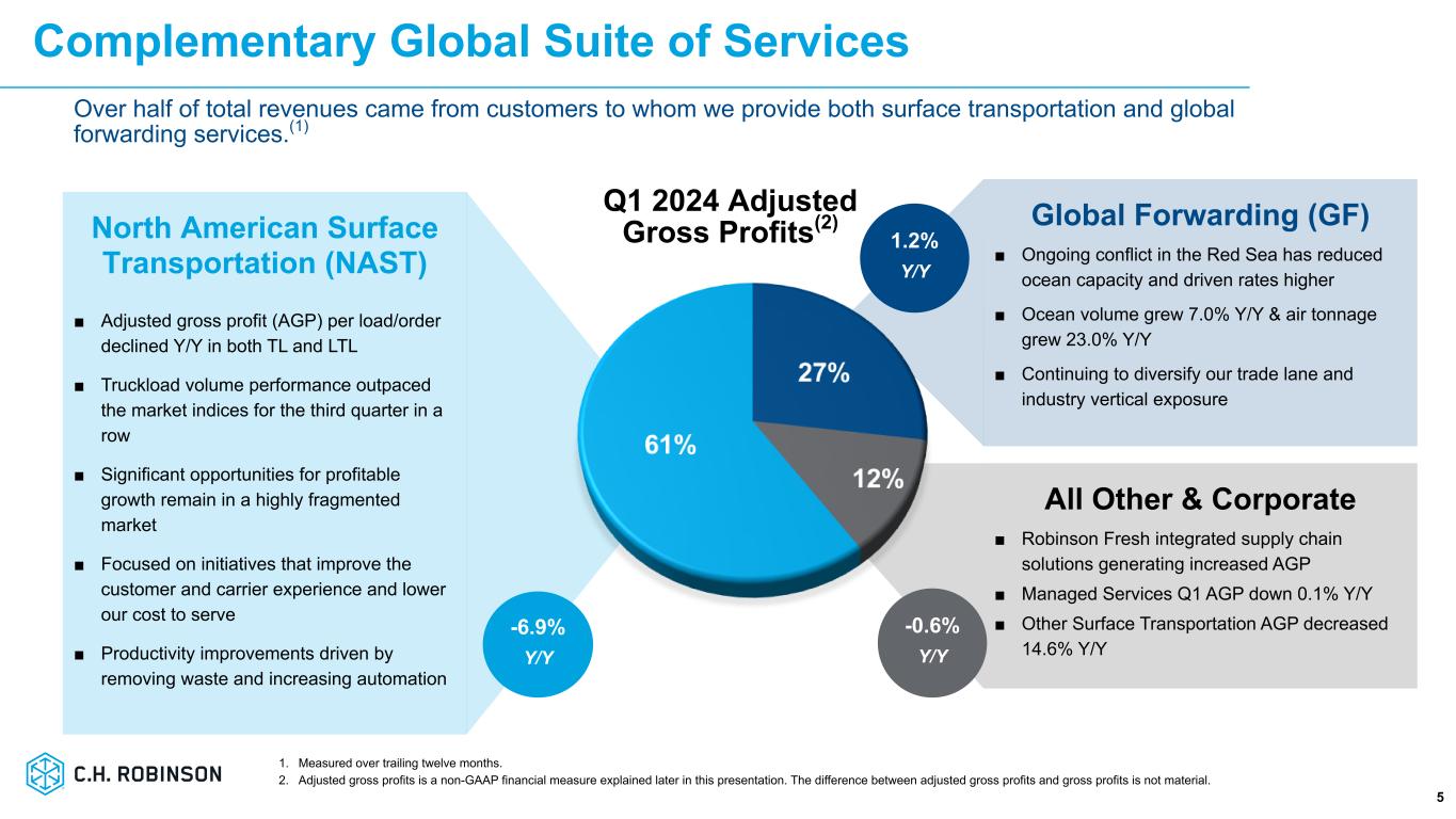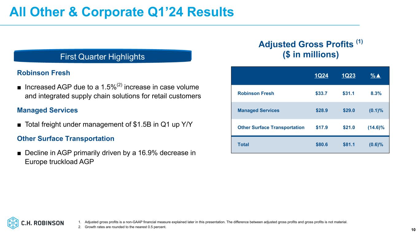 First quarter Robinson Fresh adjusted gross profits increased 8.3% to $33.7 million due to a 1.5% increase in case volume and integrated supply chain solutions for retail customers. Managed Services adjusted gross profits decreased 0.1%. Other Surface Transportation adjusted gross profits decreased 14.6% to $17.9 million, primarily due to a 16.9% decrease in Europe truckload adjusted gross profits.