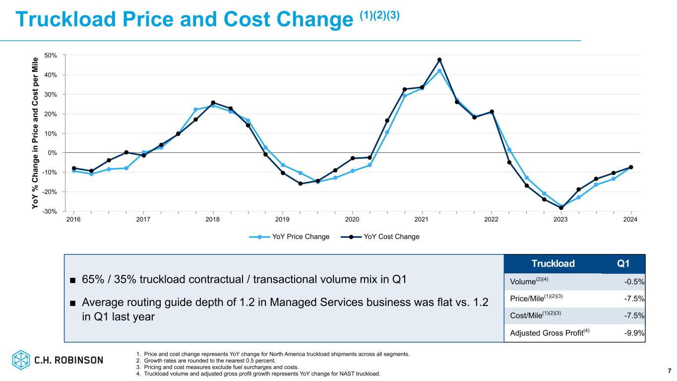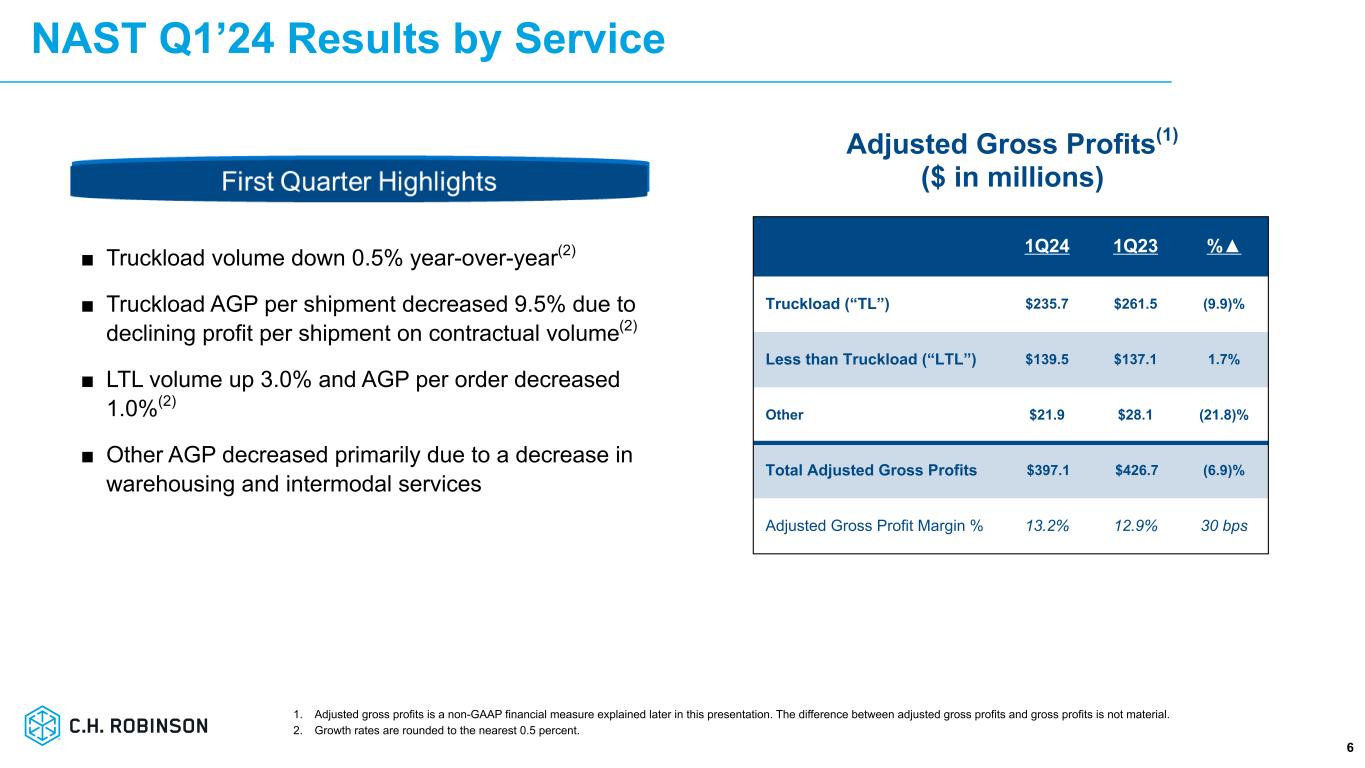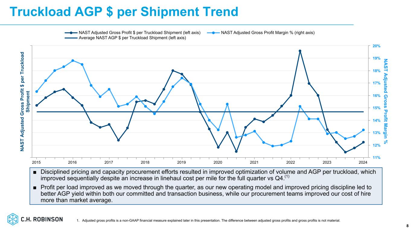 "As a result of disciplined pricing and capacity procurement efforts, we executed better across our contractual and transactional portfolios in our NAST business, and in particular, in our truckload business in the first quarter. This resulted in improved optimization of volume and adjusted gross profit per truckload, which improved sequentially despite an increase in our linehaul cost per mile for the full quarter versus the fourth quarter of 2023. Additionally, our first quarter truckload volume reflects growing market share, and we outpaced the market indices for the third quarter in a row," added Bozeman.