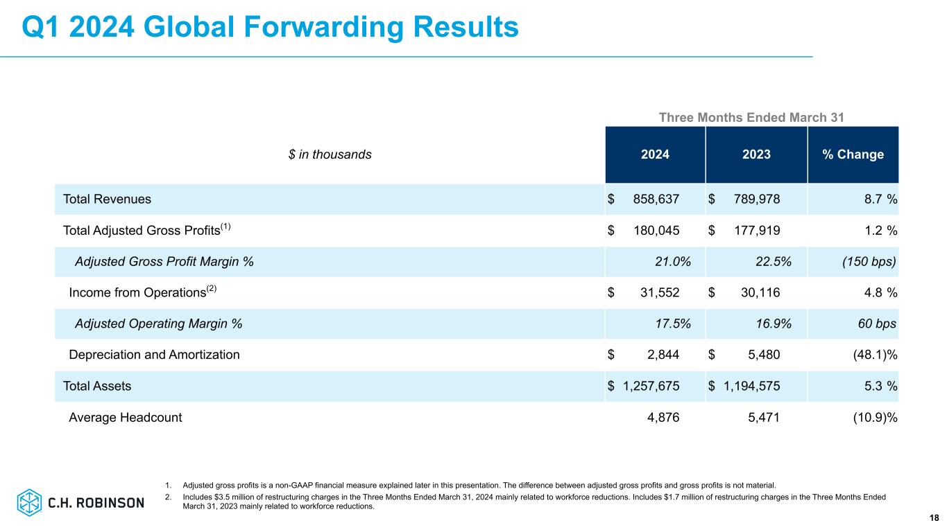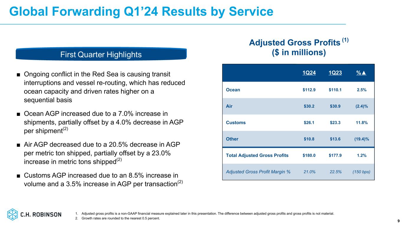 First quarter total revenues for the Global Forwarding segment increased 8.7% to $858.6 million, primarily driven by higher pricing and increased volume in our ocean services. Adjusted gross profits increased 1.2% in the quarter to $180.0 million. Ocean adjusted gross profits increased 2.5%, driven by a 7.0% increase in shipments, partially offset by a 4.0% decrease in adjusted gross profit per shipment. Air adjusted gross profits decreased 2.4%, driven by a 20.5% decrease in adjusted gross profit per metric ton shipped, partially offset by a 23.0% increase in metric tons shipped. Customs adjusted gross profits increased 11.8%, driven by an 8.5% increase in transaction volume and a 3.5% increase in adjusted gross profit per transaction. Operating expenses increased 0.5%, primarily due to higher variable compensation. First quarter average employee headcount decreased 10.9%. Income from operations increased 4.8% to $31.6 million, and adjusted operating margin expanded 60 basis points to 17.5% in the quarter.