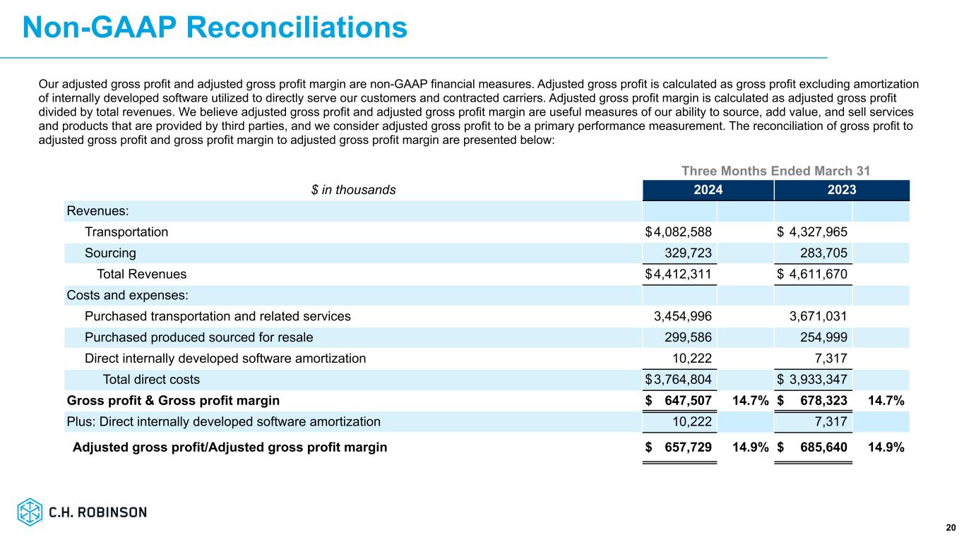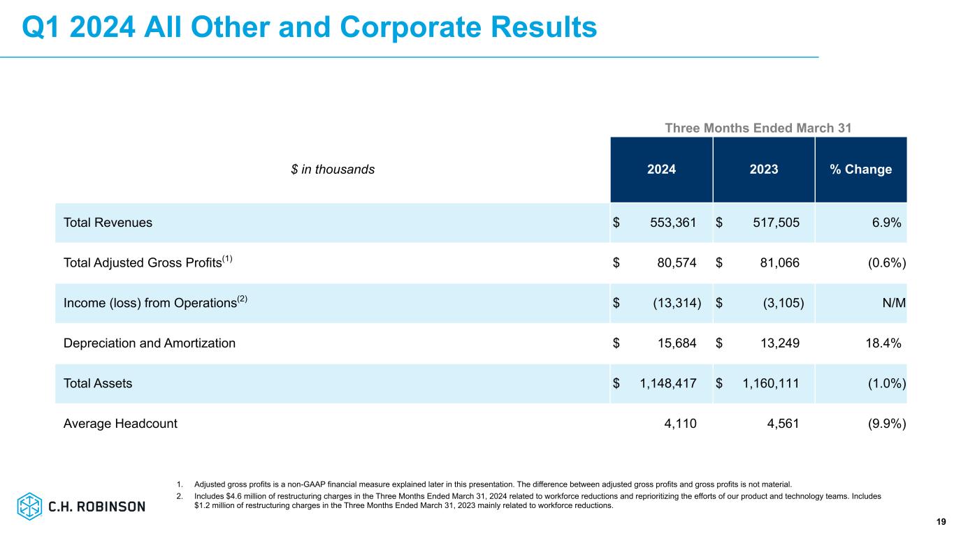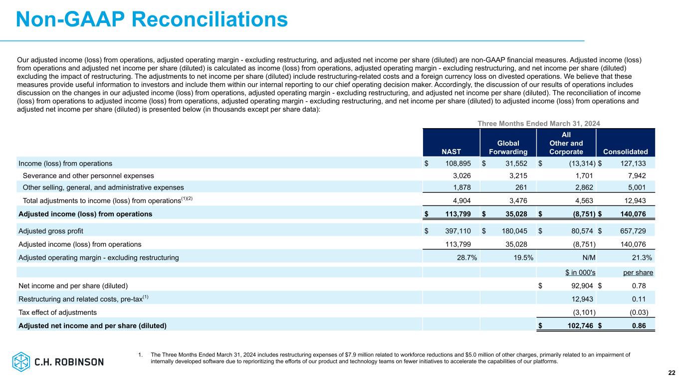 Eden Prairie, MN, May 1, 2024 - C.H. Robinson Worldwide, Inc. (“C.H. Robinson”) (Nasdaq: CHRW) today reported financial results for the quarter ended March 31, 2024.