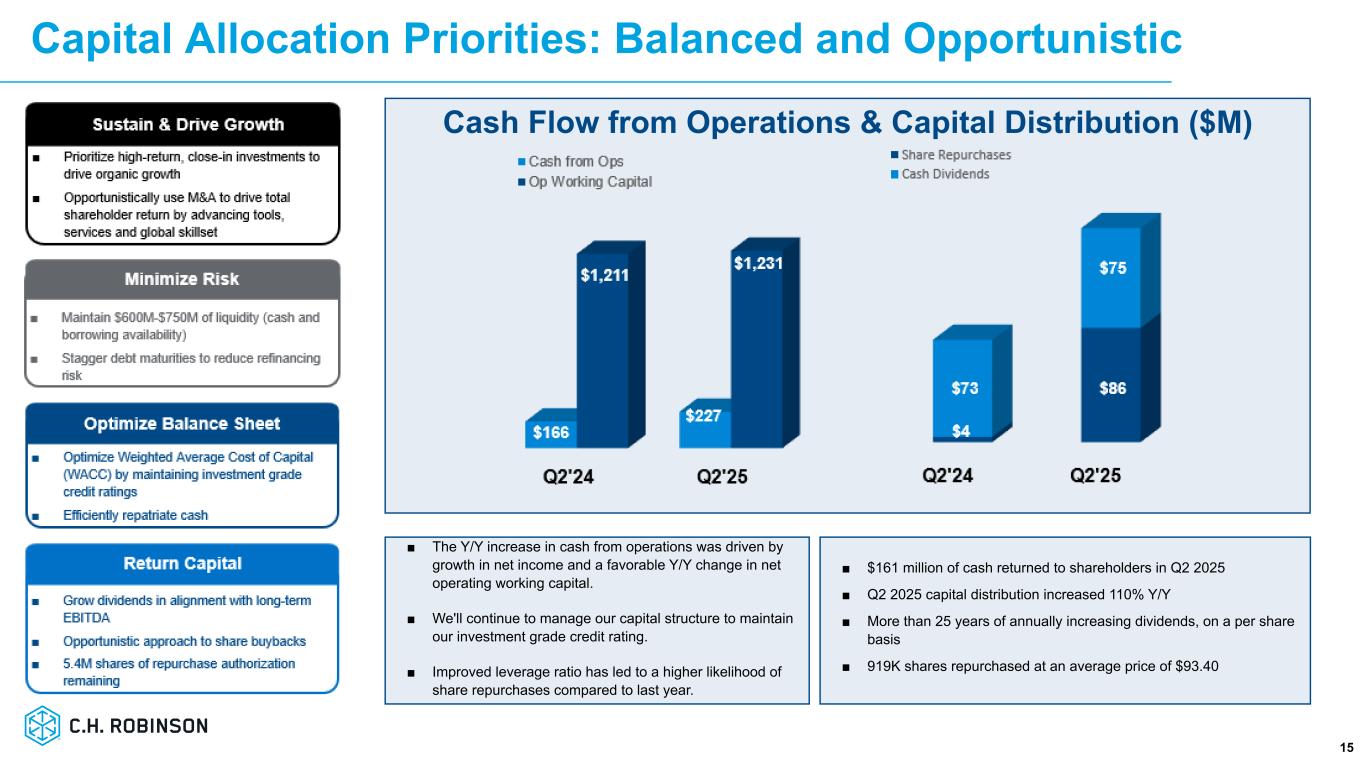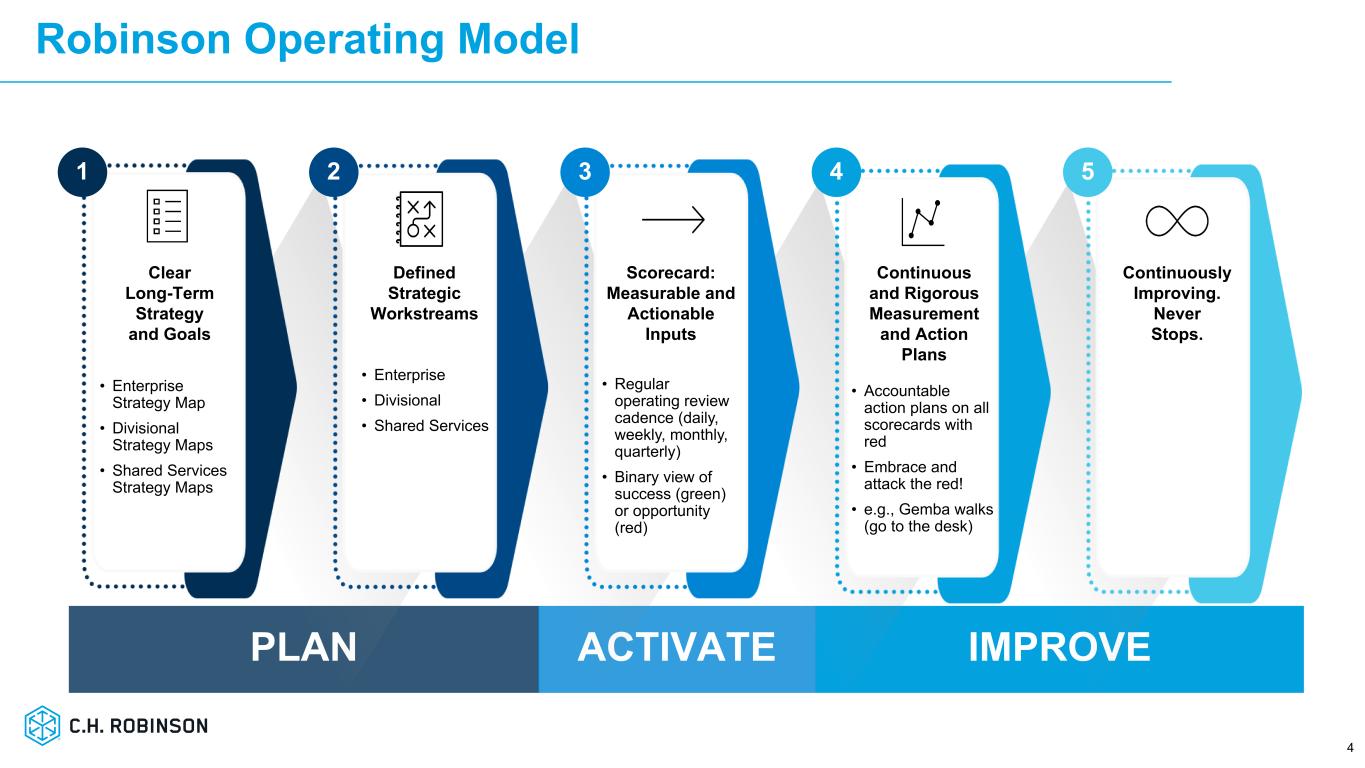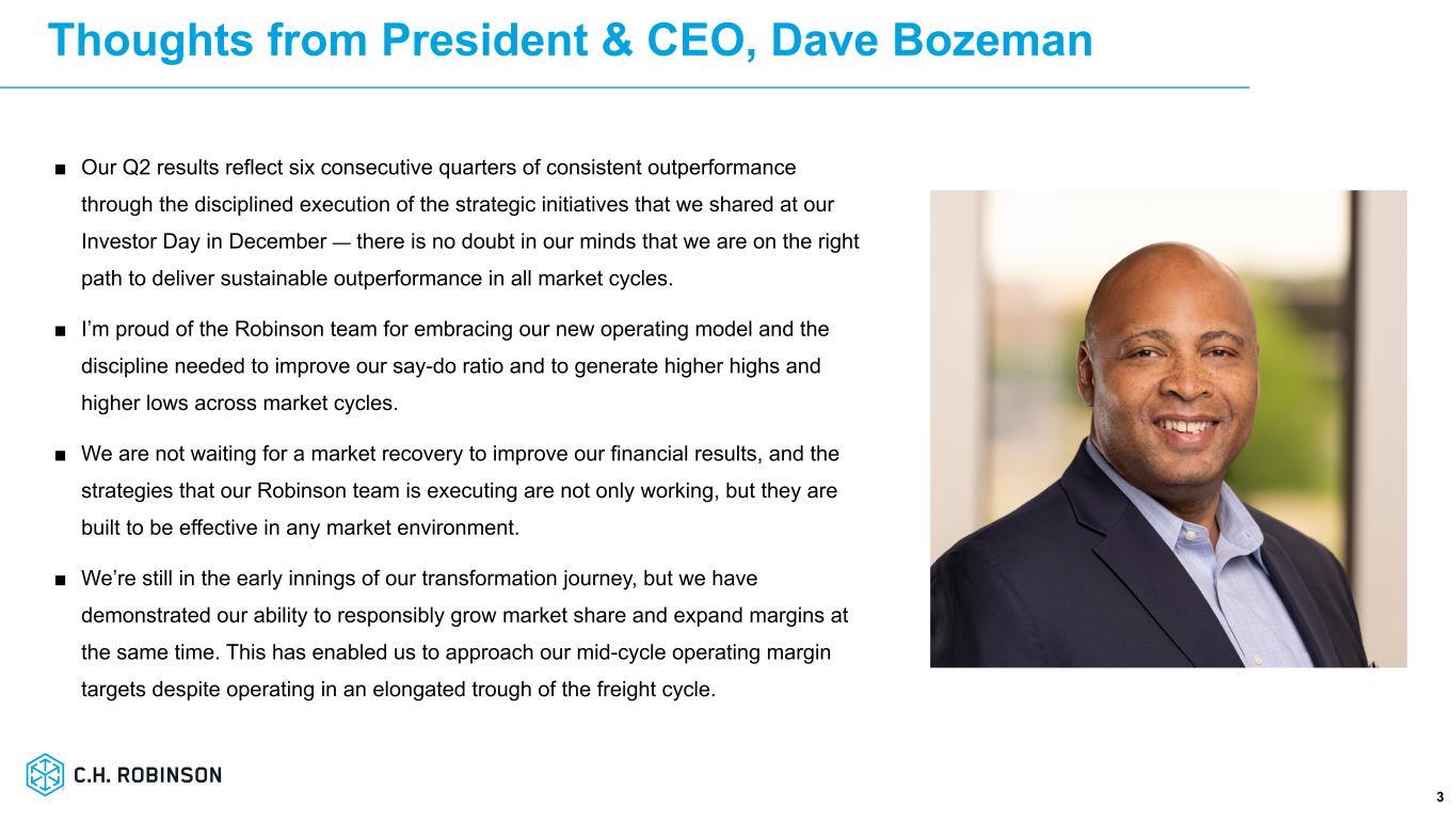 「C.H.ロビンソンの現在の変革が2024年初頭に新しいリーン・オペレーティング・モデルの導入から始まったとき、一部の人々は疑念を抱き、これがどのように会社の軌道修正を可能にするのか理解できなかったと認識しています。現在、2024年のインベスター・デイでお伝えした戦略の規律ある実行により、6四半期連続で一貫したアウトパフォームを達成しており、あらゆる市場サイクルにおいて持続可能なアウトパフォームを実現するための正しい道を歩んでいることに疑いの余地はありません」と、社長兼最高経営責任者(CEO)のデーブ・ボーズマンは述べた。「私は、ロビンソン・チームが新しい経営モデルを採用し、市場サイクルを超えて高値と安値を更新するために必要な規律を身につけたことを誇りに思います。当社の社員は常に、顧客と運送会社にもたらす価値で業界最高のロジスティシャンであることを証明し、ロビンソンで起きている変革と当社の勢いに興奮しています。"「ロビンソン・チームが実行している戦略は、うまくいっているだけでなく、どのような市場環境においても効果的であるように構築されています。