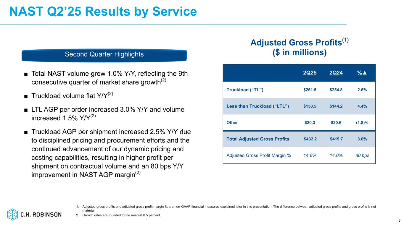 NAST 事業の第 2 四半期の総収入は 29 億ドルとなり、前年同期から 2.4%減少しましたが、これは主にト ラックロード・サービスにおける燃料サーチャージの減少によるものです。NAST 事業の調整後売上総利益は、前年同期比 3.0%増の 4 億 3,220 万ドルとなりました。トラック貨物の調整後売上総利益は、貨物あたりの調整後売上総利益が 2.5%増加したことによ り、2.6%増加しました。一方、燃料サーチャージを除いた1マイルあたりのトラック輸送コストは3.5%増加し、その結果、1マイルあたりのトラック輸送調整後売上総利益は1.5%増加しました。LTL の調整後売上総利益は、受注 1 件当たりの調整後売上総利益が 3.0%増加し、LTL の取扱量が 1.5%増加したことにより、前年同期比で 4.4%増加しました。NAST 全体の取扱量は 1.0%増加し、市場の指標を上回りました。営業費用は 3.7%減少しましたが、これは主にコスト最適化の努力と生産性の改善、および人員削減とオペレ ーティング・リースのオフィス・ビルの早期解約または放棄を含む施設面積の縮小に関連した前年の構造改革費用 によるものです。第 2 四半期の平均従業員数は前年同期比で 10.0%減少しました。営業利益は16.2%増の1億6,400万ドル、調整後営業利益率は430bp拡大し37.9%となりました。