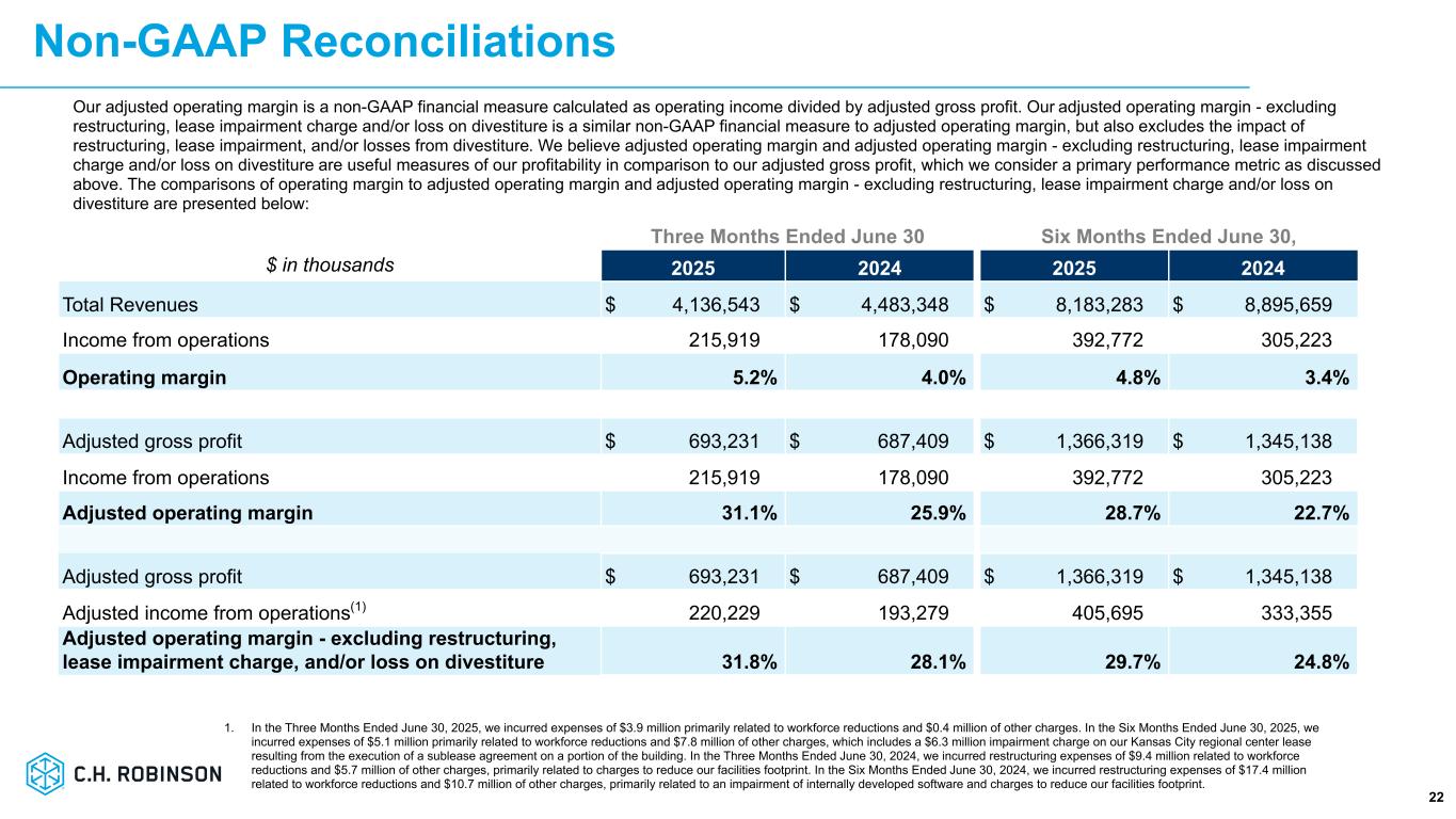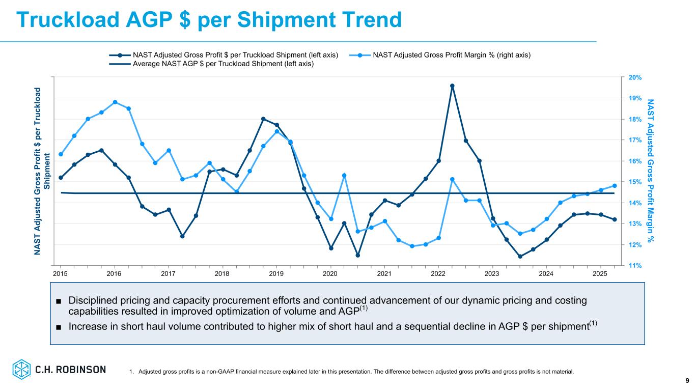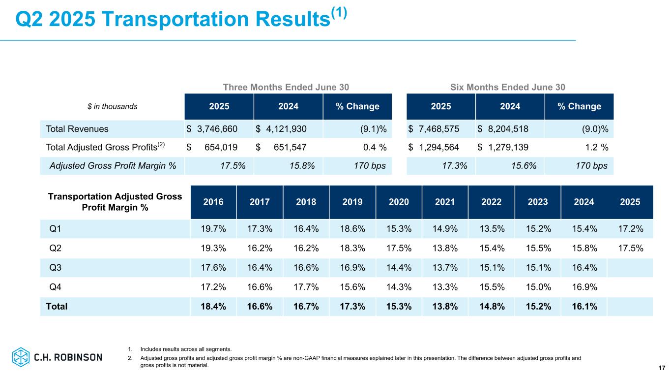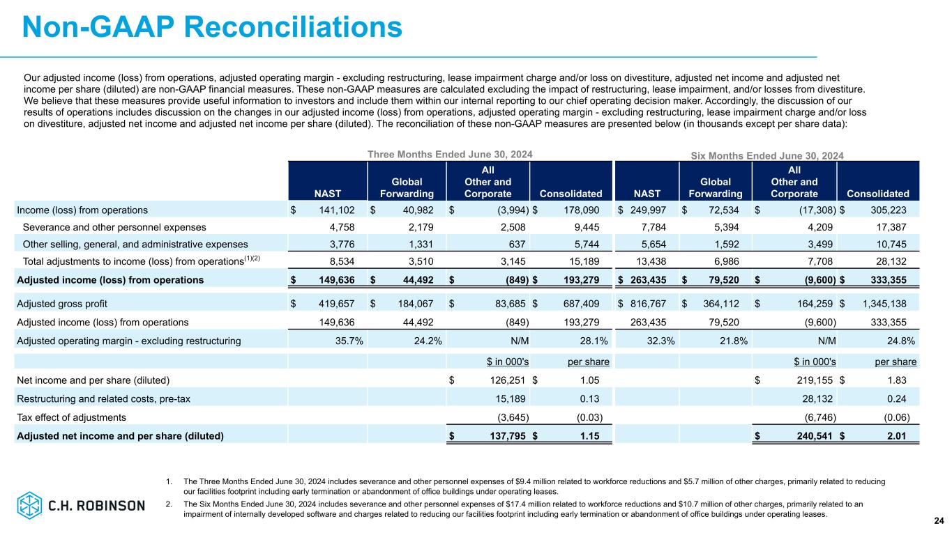 -売上総利益は1.0%増の13億ドル。調整後売上総利益は1.6%増の14億ドルで、主にトラックロード、LTL、通関サービスにおける1取引あたりの調整後売上総利益の増加により、欧州陸上輸送事業の売却、トラックロードおよび海上サービスにおける取扱量の減少により一部相殺されました。
