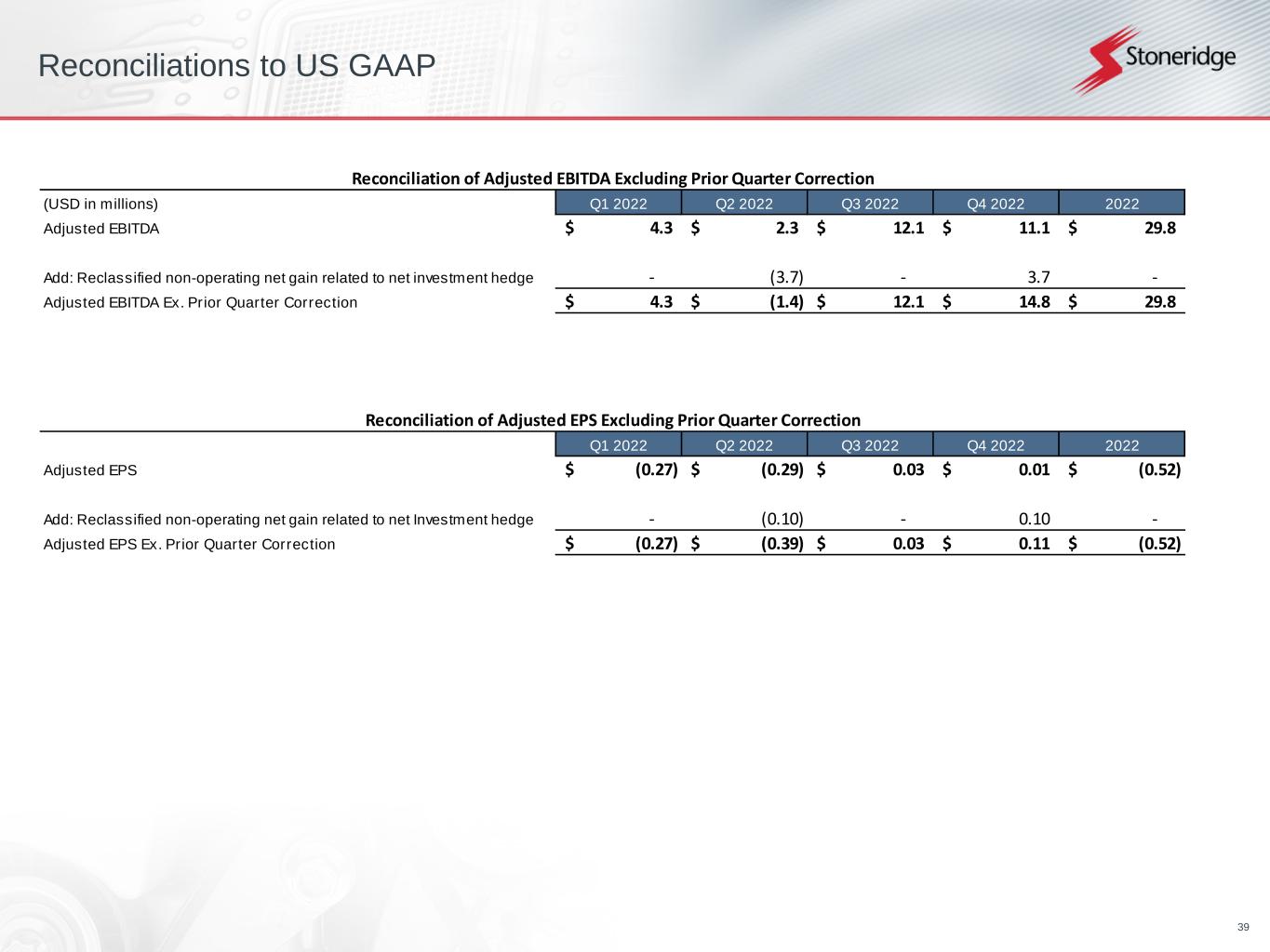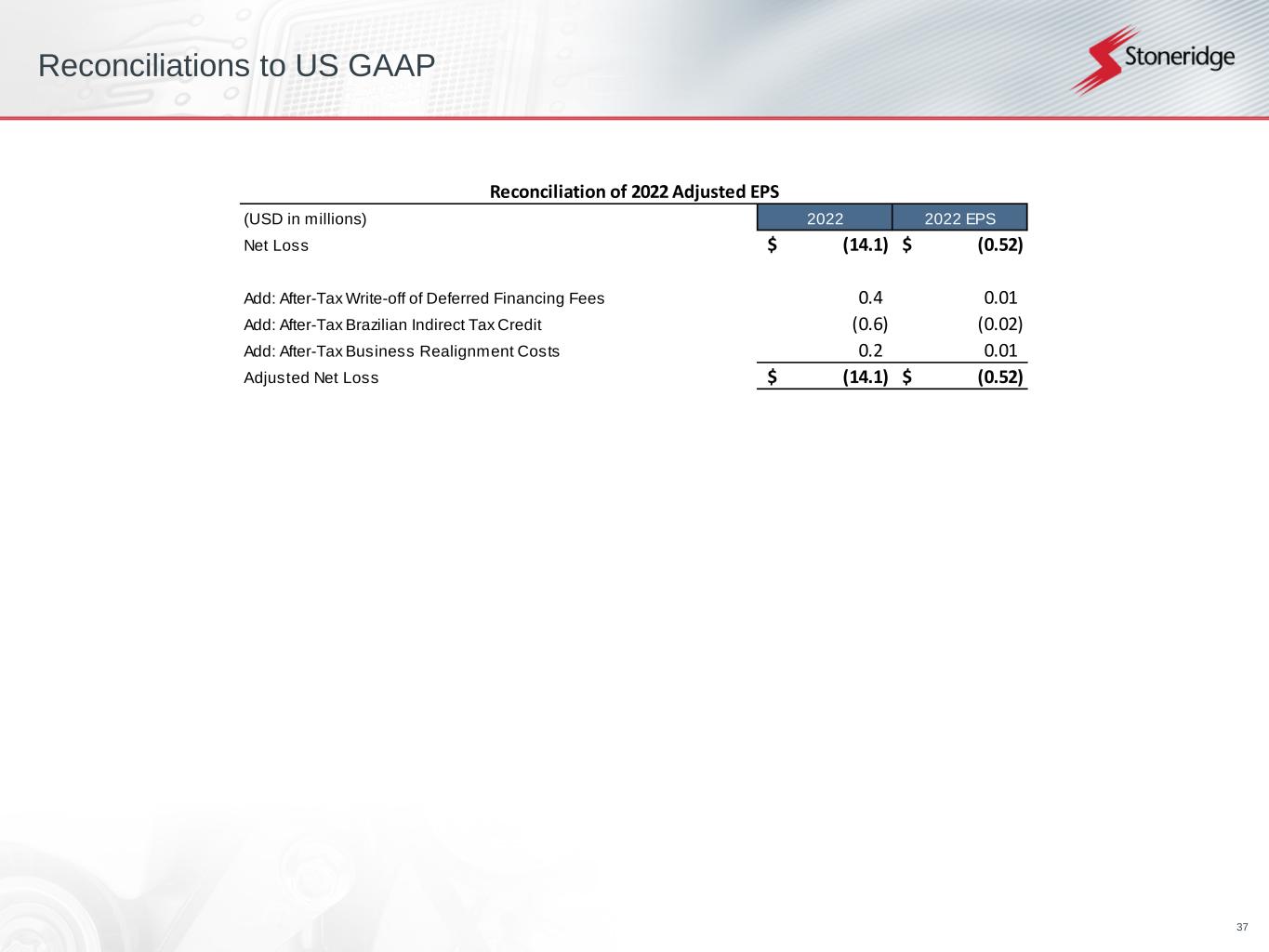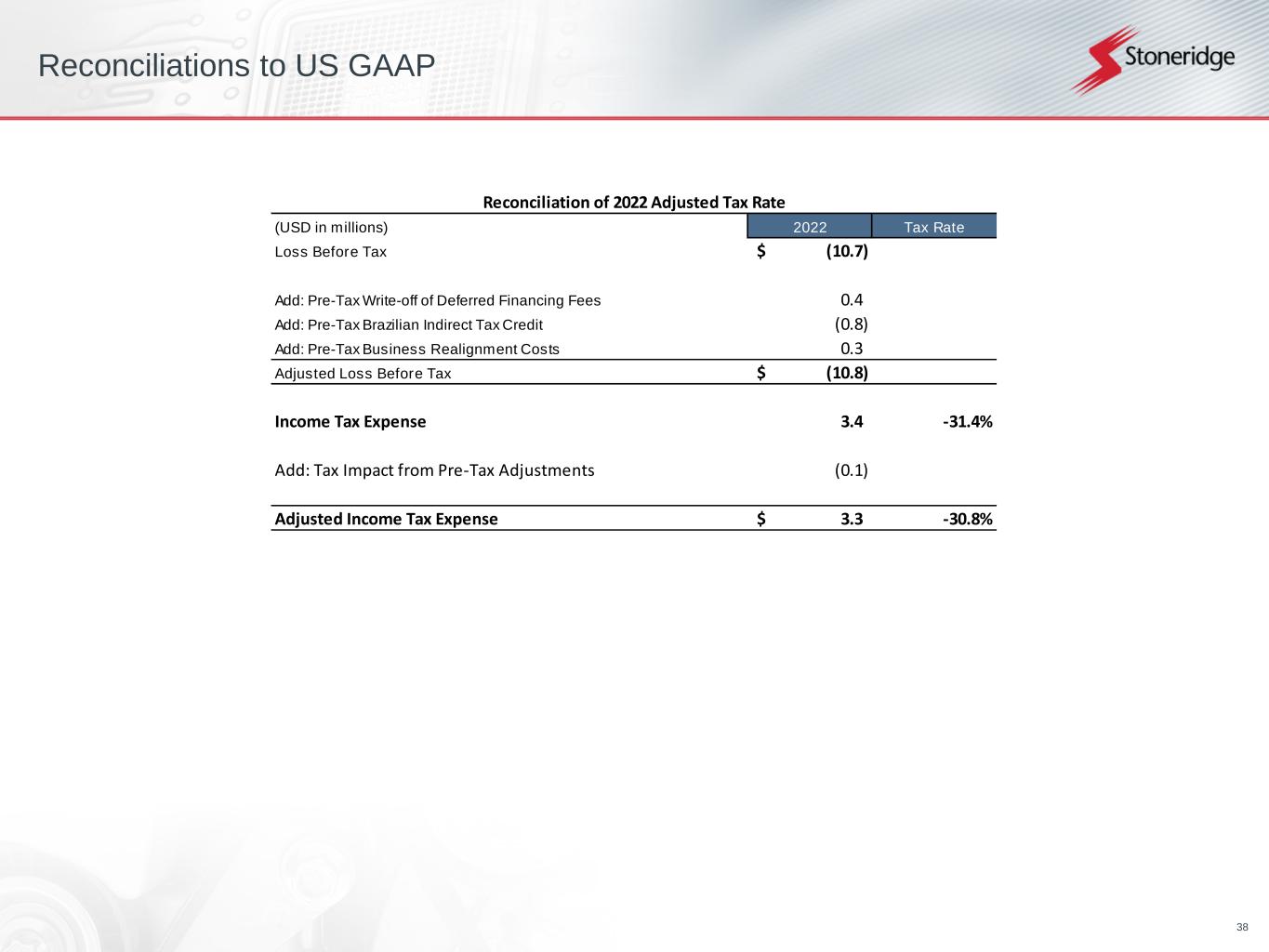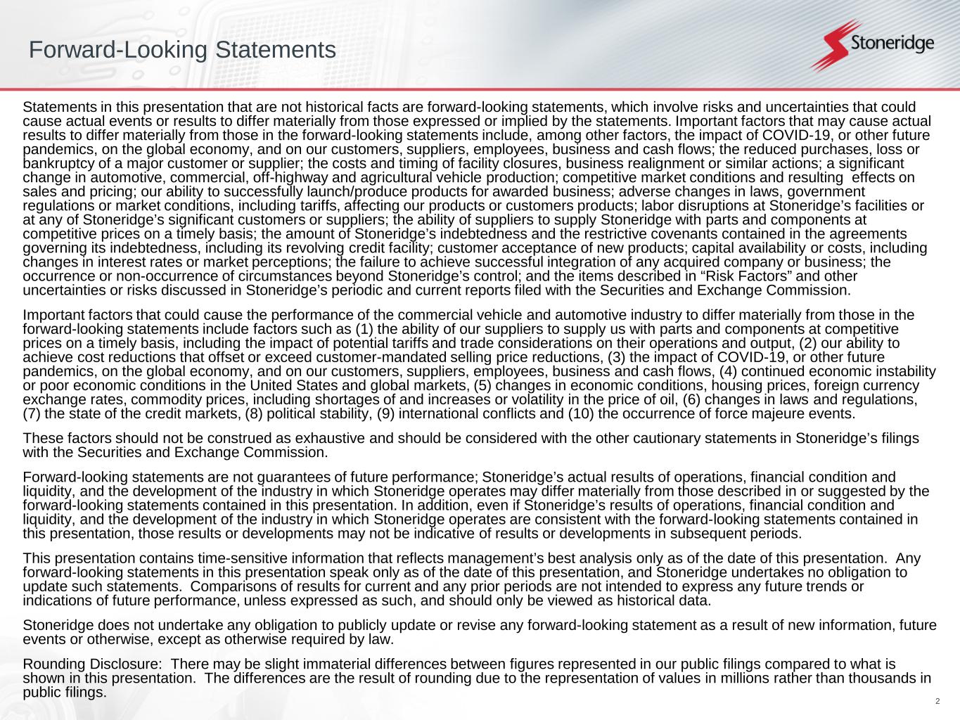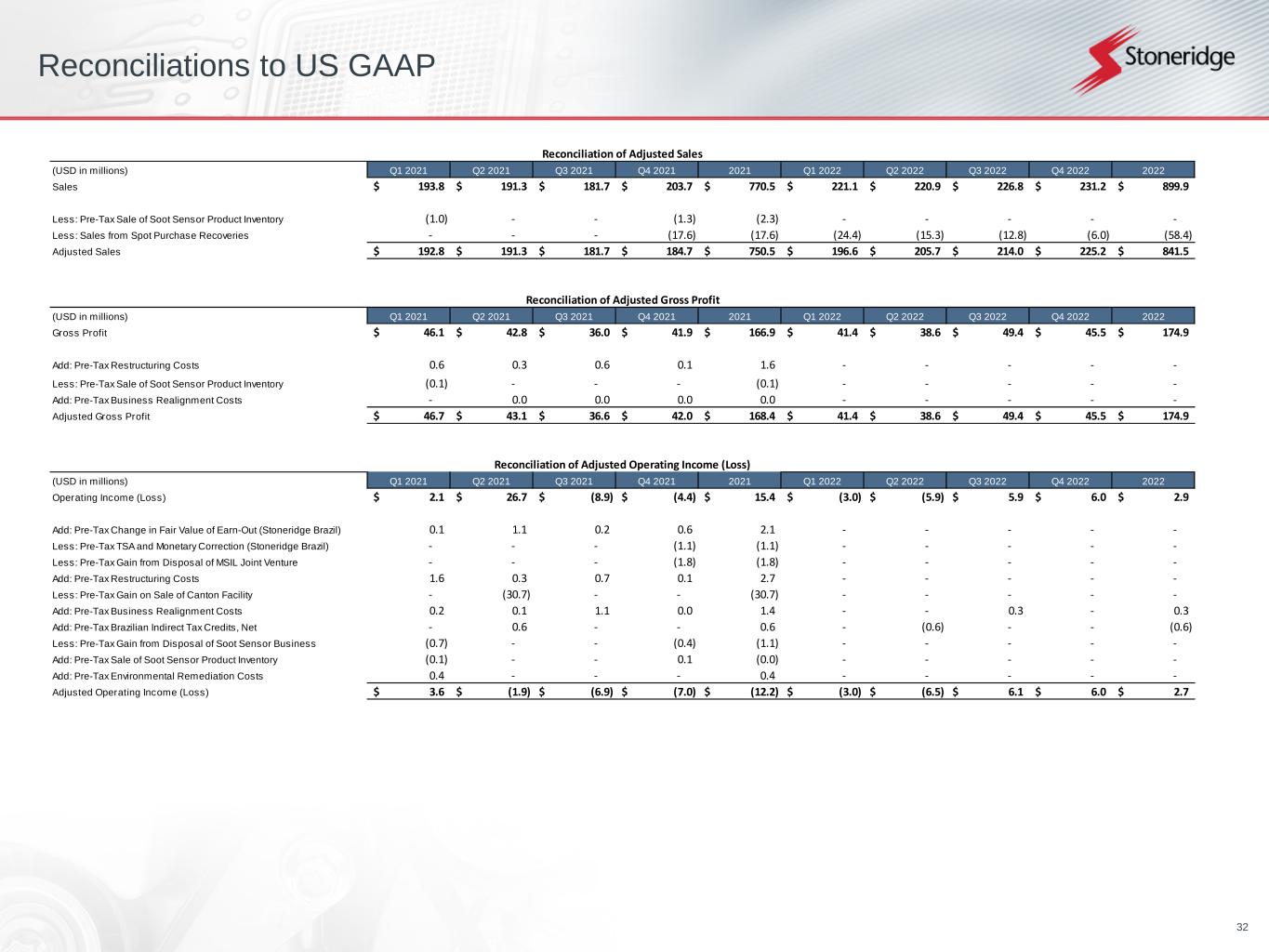 This press release contains information about the Company’s financial results that is not presented in accordance with accounting principles generally accepted in the United States (“GAAP”). Such non-GAAP financial measures are reconciled to their closest GAAP financial measures at the end of this press release. The provision of these non-GAAP financial measures for 2022 and 2021 is not intended to indicate that Stoneridge is explicitly or implicitly providing projections on those non-GAAP financial measures, and actual results for such measures are likely to vary from those presented. The reconciliations include all information reasonably available to the Company at the date of this press release and the adjustments that management can reasonably predict.