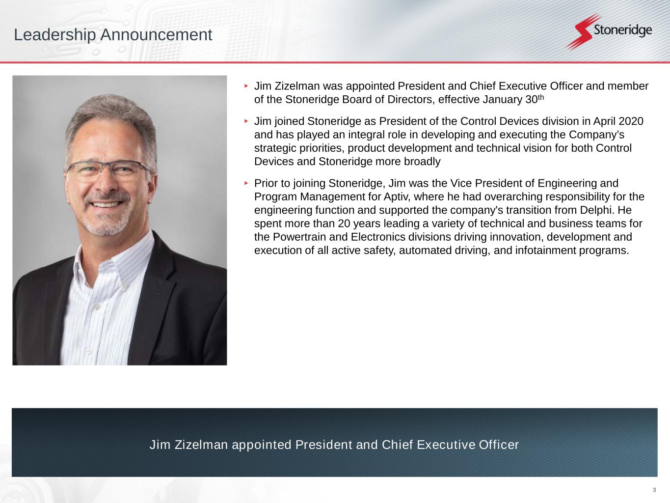 Stoneridge, Inc., headquartered in Novi, Michigan, is a global designer and manufacturer of highly engineered electrical and electronic systems, components and modules for the automotive, commercial, off-highway and agricultural vehicle markets. Additional information about Stoneridge can be found at www.stoneridge.com.