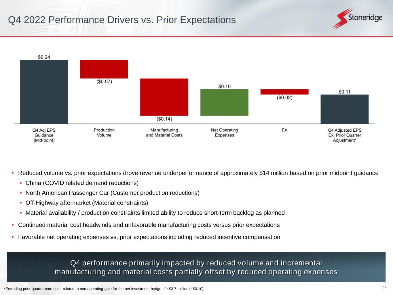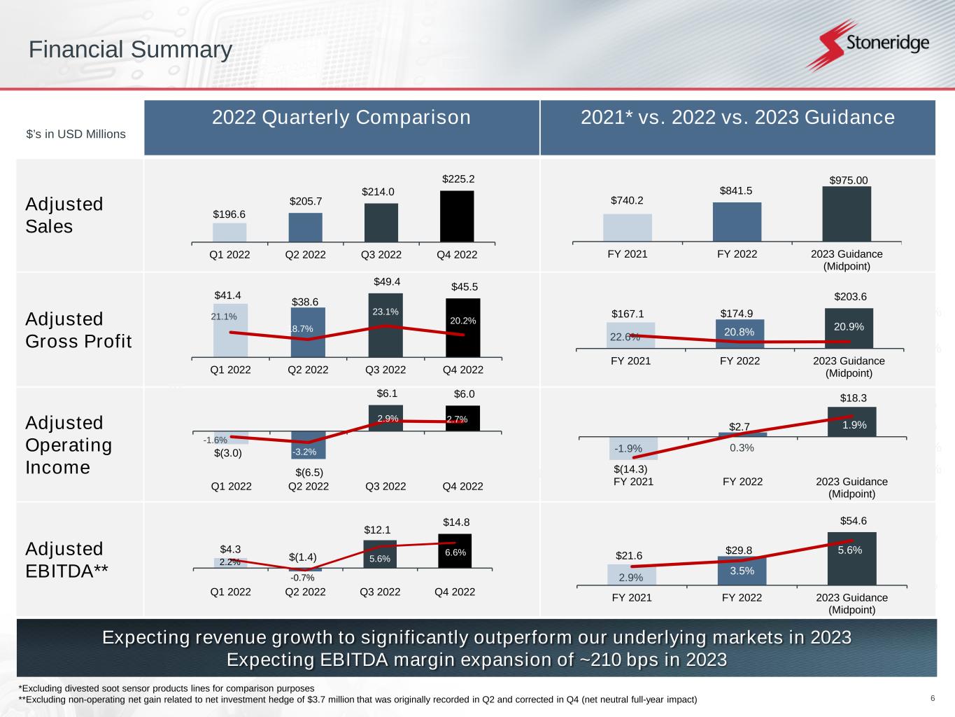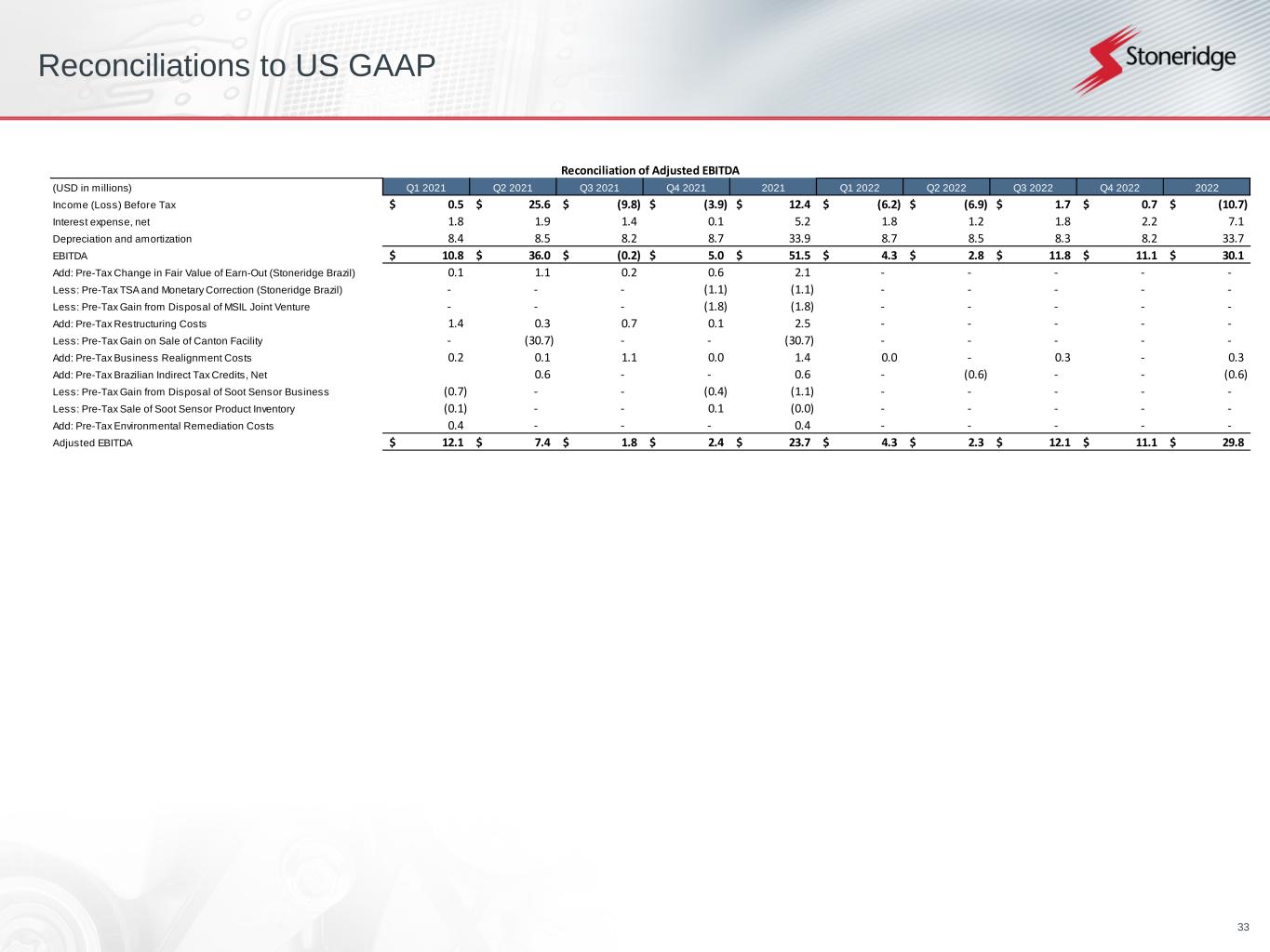 For the fourth quarter of 2022, Stoneridge reported gross profit of $45.5 million (19.7% of sales, 20.2% of adjusted sales). Operating income was $6.0 million (2.6% of sales and 2.7% of adjusted sales). EBITDA was $11.1 million (4.9% of adjusted sales). Excluding the impact of the prior quarter correction, EBITDA was $14.8 million (6.6% of adjusted sales), a $3.7 million and 100 basis point improvement over the third quarter.